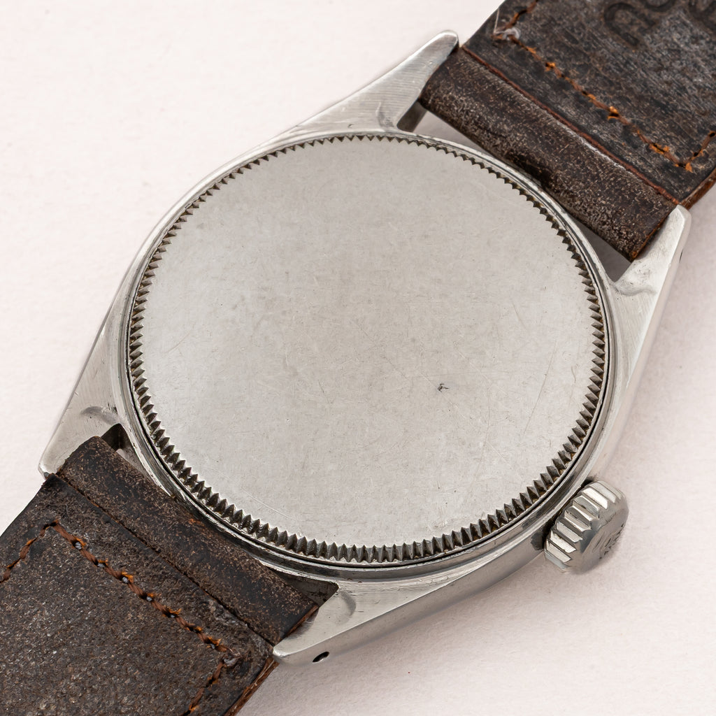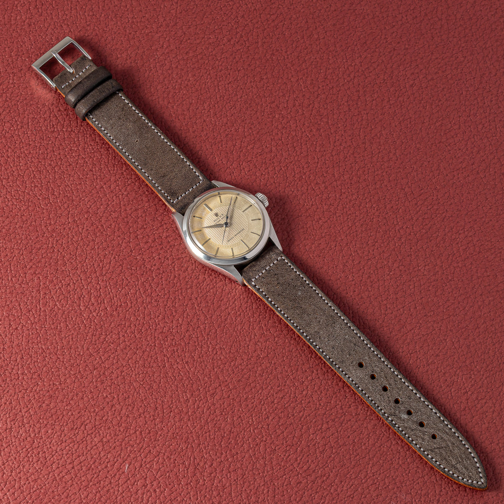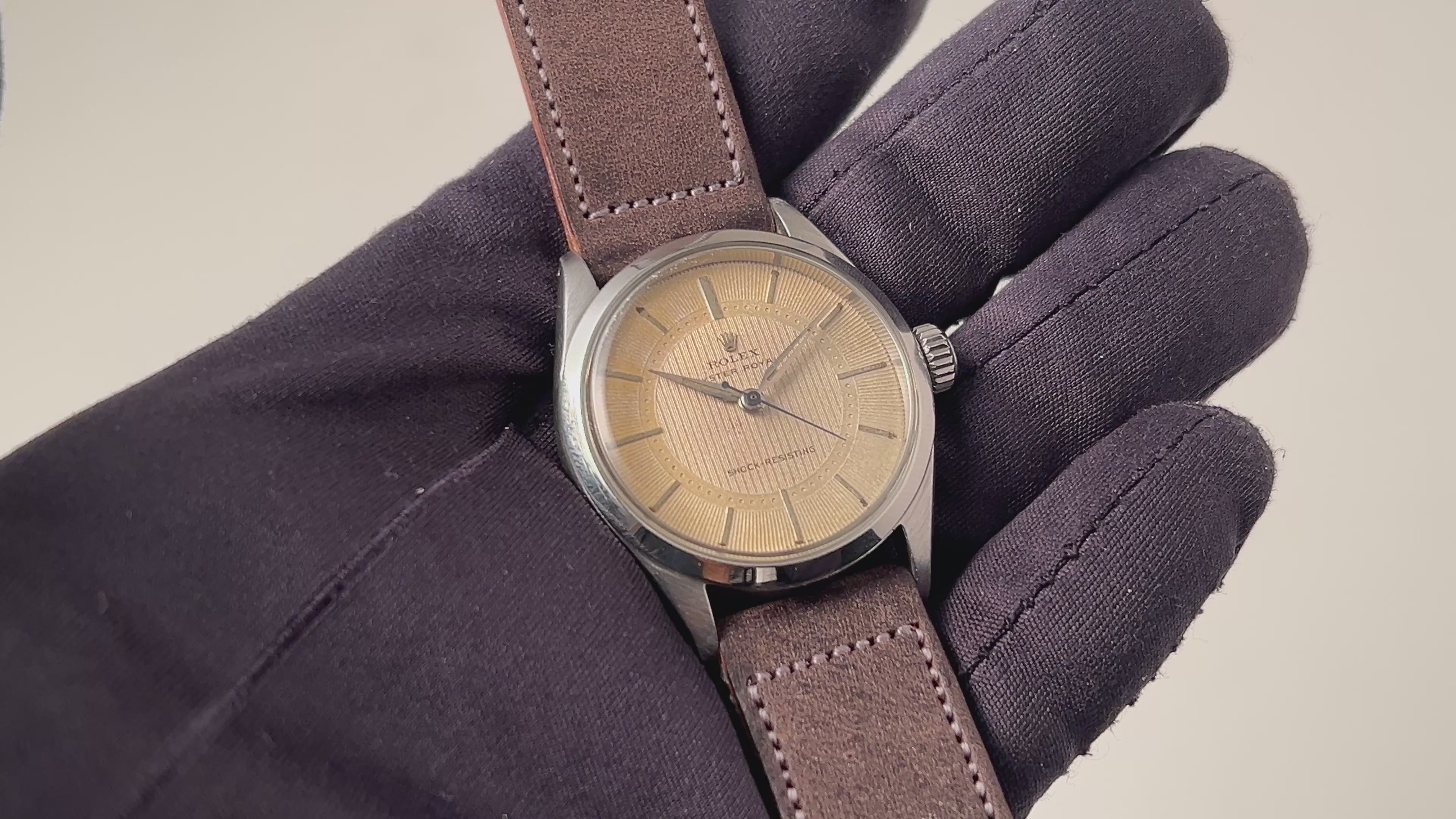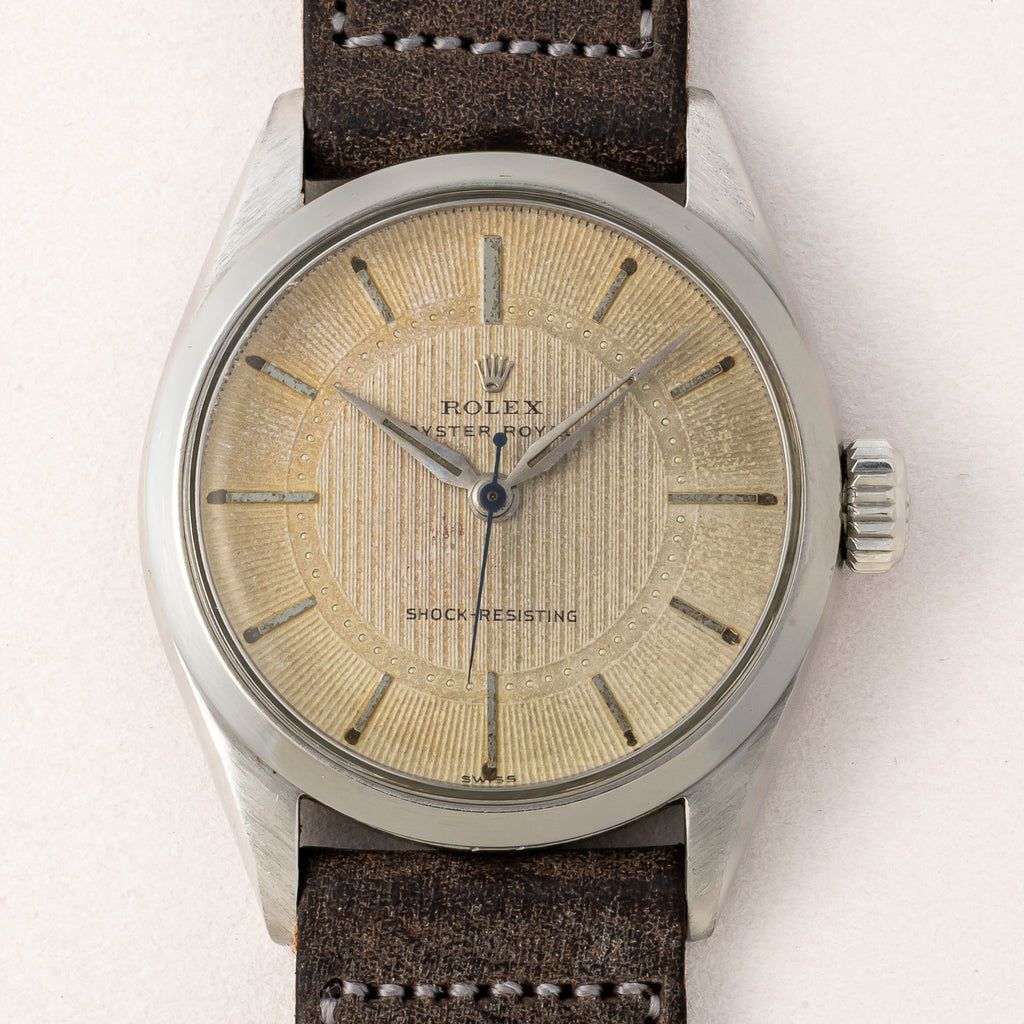 1957年製のロレックス オイスター ローヤル ツートンダイヤルが入荷しました。ダイヤルはパールドットのサークルを境に仕上げの方向を切り替えたツートンダイヤルで、凝った珍しい作りです。ブルースチール秒針もパールドットのミニッツに長さをしっかり合わせています。長針の夜光はほとんど落ちていますが若干オリジナルも根元付近に残っています。ケースは小傷はありますが過度なダメージは無く、良好なコンディションです。ベルトはアキュレイトフォルムの革ベルトを合わせています。手巻きや針回しはスムーズです。