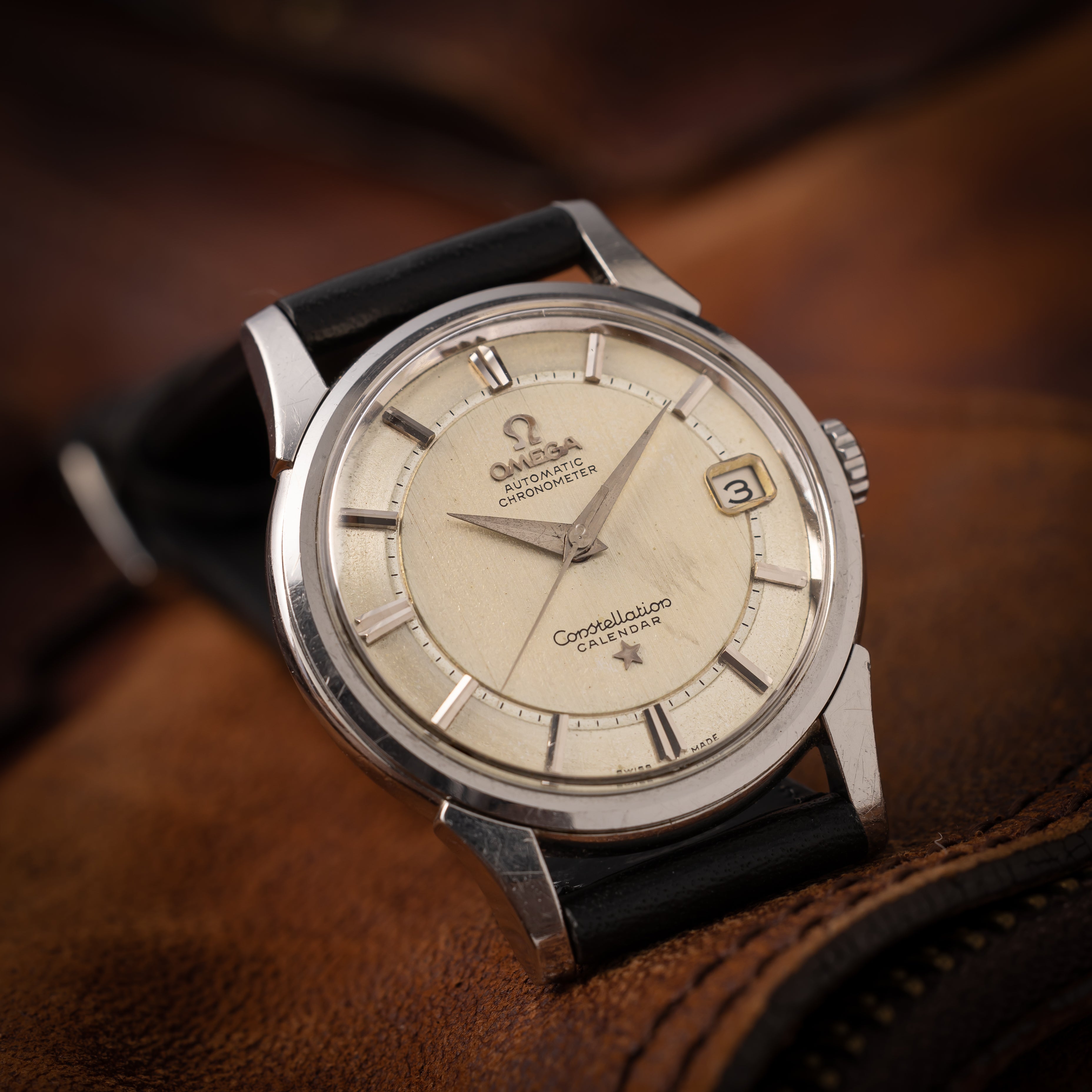 1959年製のオメガコンステレーションカレンダーRef.14393 2 SCです。オメガの最高級ラインであるコンステレーションです。カレンダーを備えた段付きで立体感のある文字盤は状態も良くかつヴィンテージの雰囲気も抜群です。裏ブタのメダリオンもしっかり残っています。ムーブメントはクロノメーターのCal.561を搭載。ケースは小傷はありますが大きなダメージはありません。手巻きや針回しの操作はスムースです。ベルトは新品のファイアーキッズオリジナル革ベルトでイタリアンレザーのブッテーロで裏面ラバーが取り付けられています。