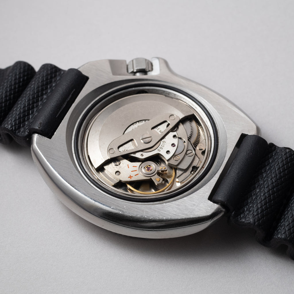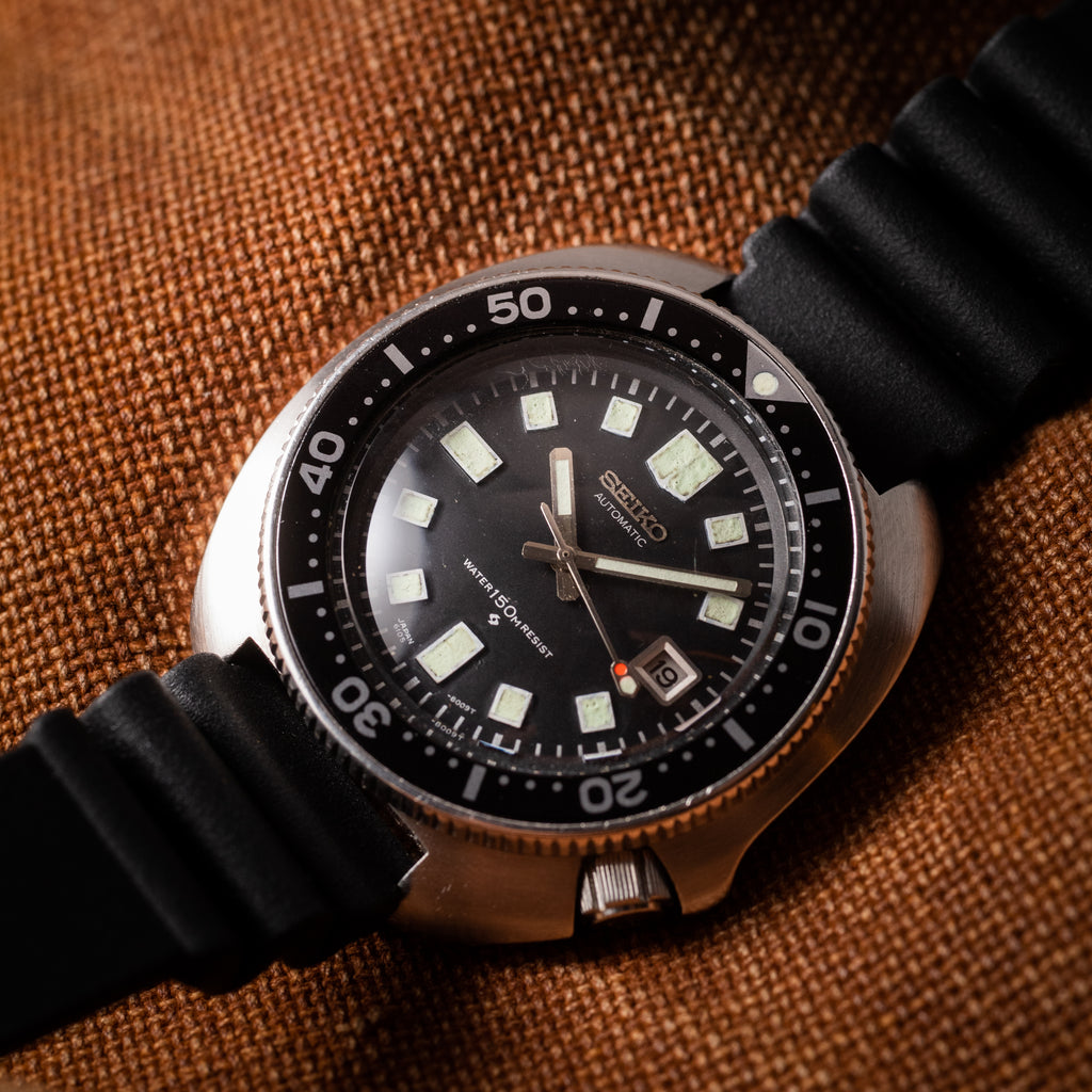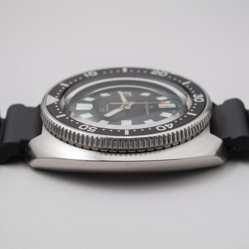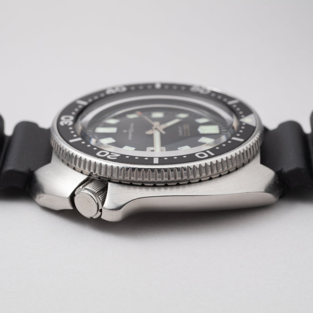 1976年製のセイコーセカンドダイバー後期モデルです。 世界的にも有名な冒険家、植村直己さんが北極圏12,000の距離を犬ぞりで足掛け3年で突破した際に着用していたモデルで、通称「植村直己モデル」と呼ばれています。 前期型よりもボリュームのあるケースに改良され、特徴的なリューズガードがデザインされています。ベゼル文字盤の状態はキレイですが、針の夜光は塗りなおされています。リューズのロック機構は経年により効かなくなっているものが多い中、しっかりと効きます。ムーブメントは自動巻きのCal.6105Bを搭載。ベルトは純正のウレタンベルトが取り付けてあります。