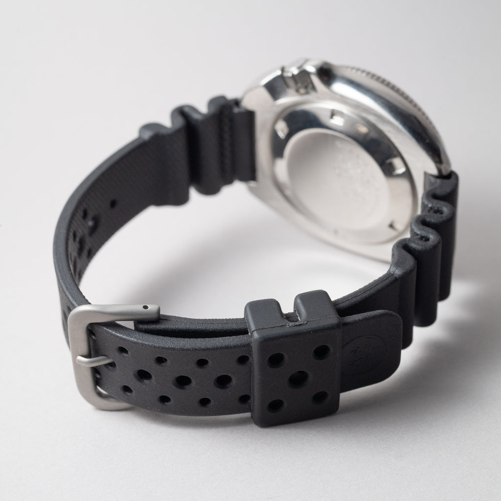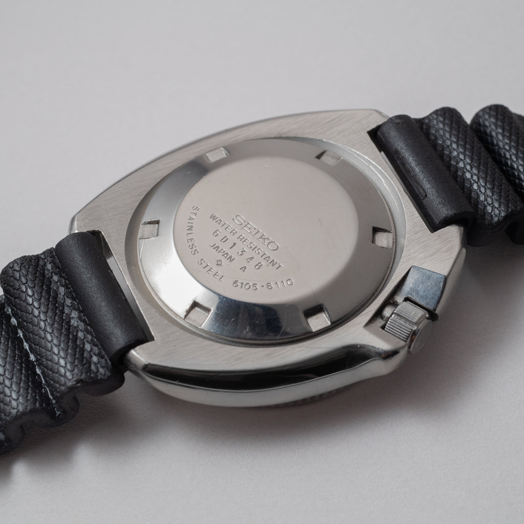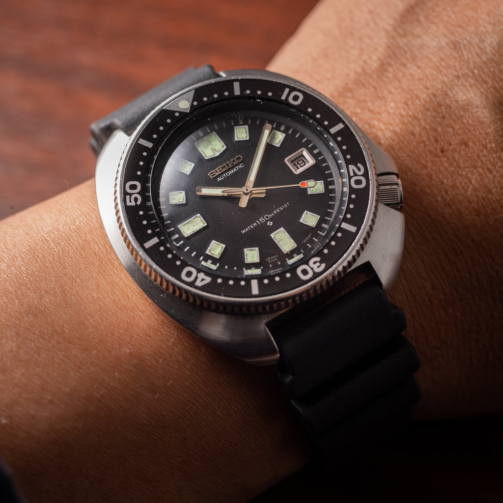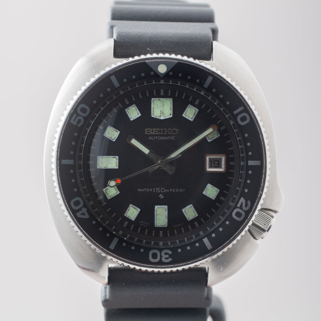 1976年製のセイコーセカンドダイバー後期モデルです。 世界的にも有名な冒険家、植村直己さんが北極圏12,000の距離を犬ぞりで足掛け3年で突破した際に着用していたモデルで、通称「植村直己モデル」と呼ばれています。 前期型よりもボリュームのあるケースに改良され、特徴的なリューズガードがデザインされています。ベゼル文字盤の状態はキレイですが、針の夜光は塗りなおされています。リューズのロック機構は経年により効かなくなっているものが多い中、しっかりと効きます。ムーブメントは自動巻きのCal.6105Bを搭載。ベルトは純正のウレタンベルトが取り付けてあります。