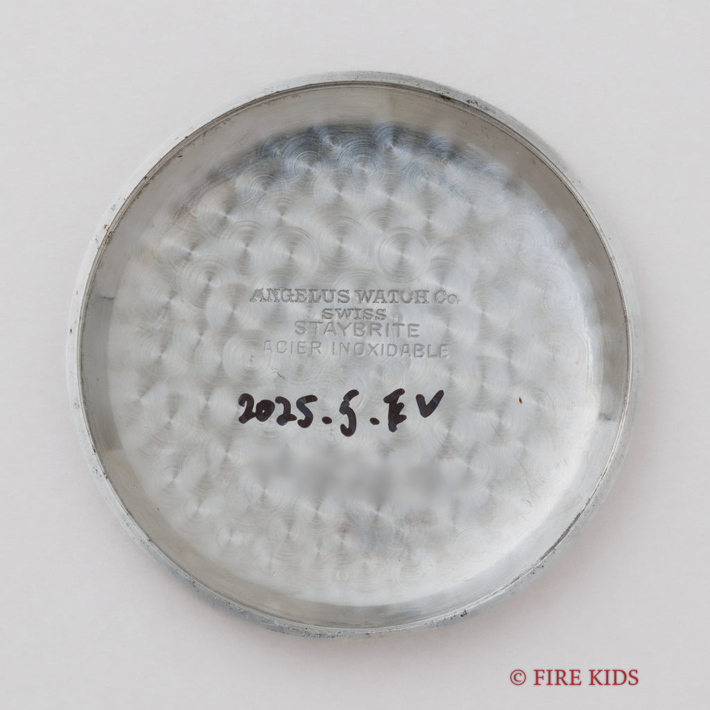 アンジェラス 2レジスター クロノグラフ 1940年代製 オリジナルブラックダイヤル 手巻き Cal.215の入荷になります。自社キャリバーCal. 215を搭載した2レジスタークロノグラフでオリジナルのブラックアラビアダイヤルが抜群の雰囲気になっています。文字盤は表面の劣化、夜光塗料の塗り直しが見られますがシミ等無く格好良い時計になっています。ケースは小傷が見られますが大きなダメージはありません。手巻きや針回し、クロノグラフの操作はスムースです。ベルトはファイアーキッズオリジナル革ベルトイタリアンレザーのブッテーロ(裏面ラバー)が取り付けられています。こちらの時計は分解掃除済みです。
