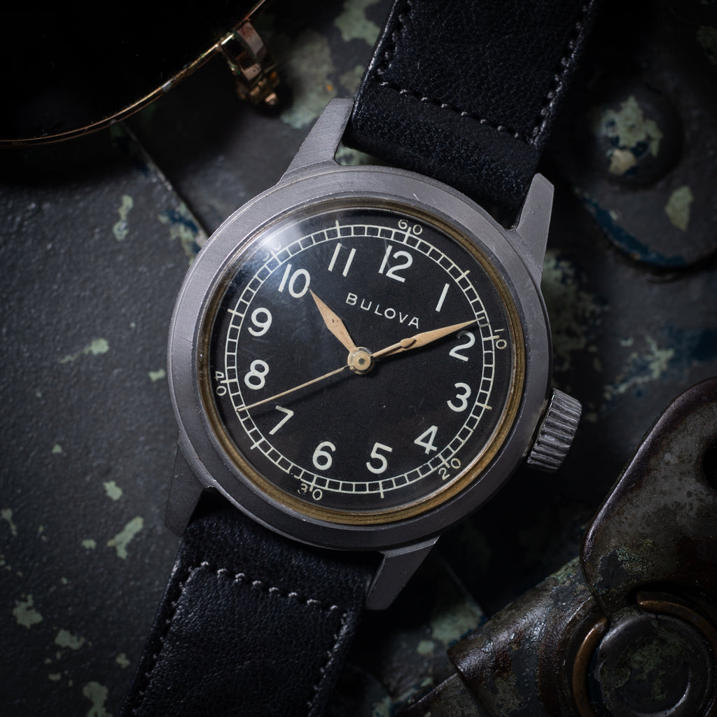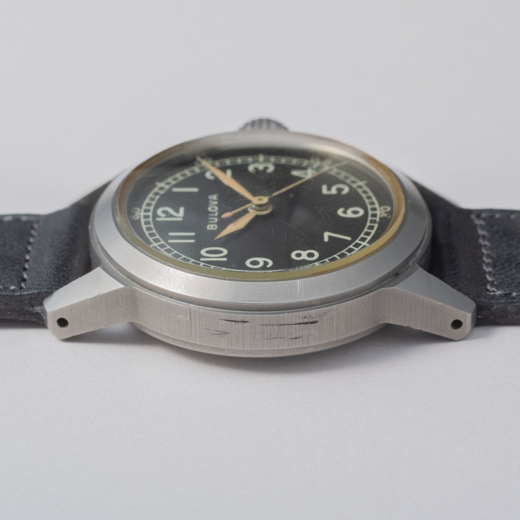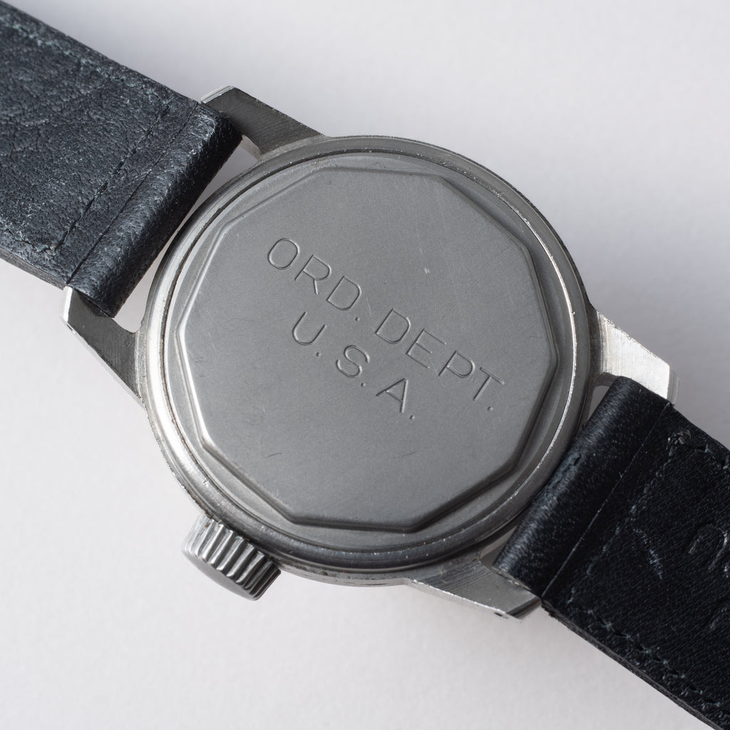 ブローバのミリタリーウオッチ 1950年代製です。アメリカ軍に制式採用された本物の軍用時計になります。幅32mm(リューズ別)のコンパクトながらしっかりとしたケースで二重構造の裏蓋です。手袋をした状態でリューズ操作がしやすい大きめのリューズが格好良く見えます。ムーブメントはCal.10AKを搭載。ハック機能が付き、手巻きや針回しの操作はスムースです。ベルトはヴィンテージと相性の良いアキュレイトフォルムが取り付けられています。こちらはオーバーホール済みです。