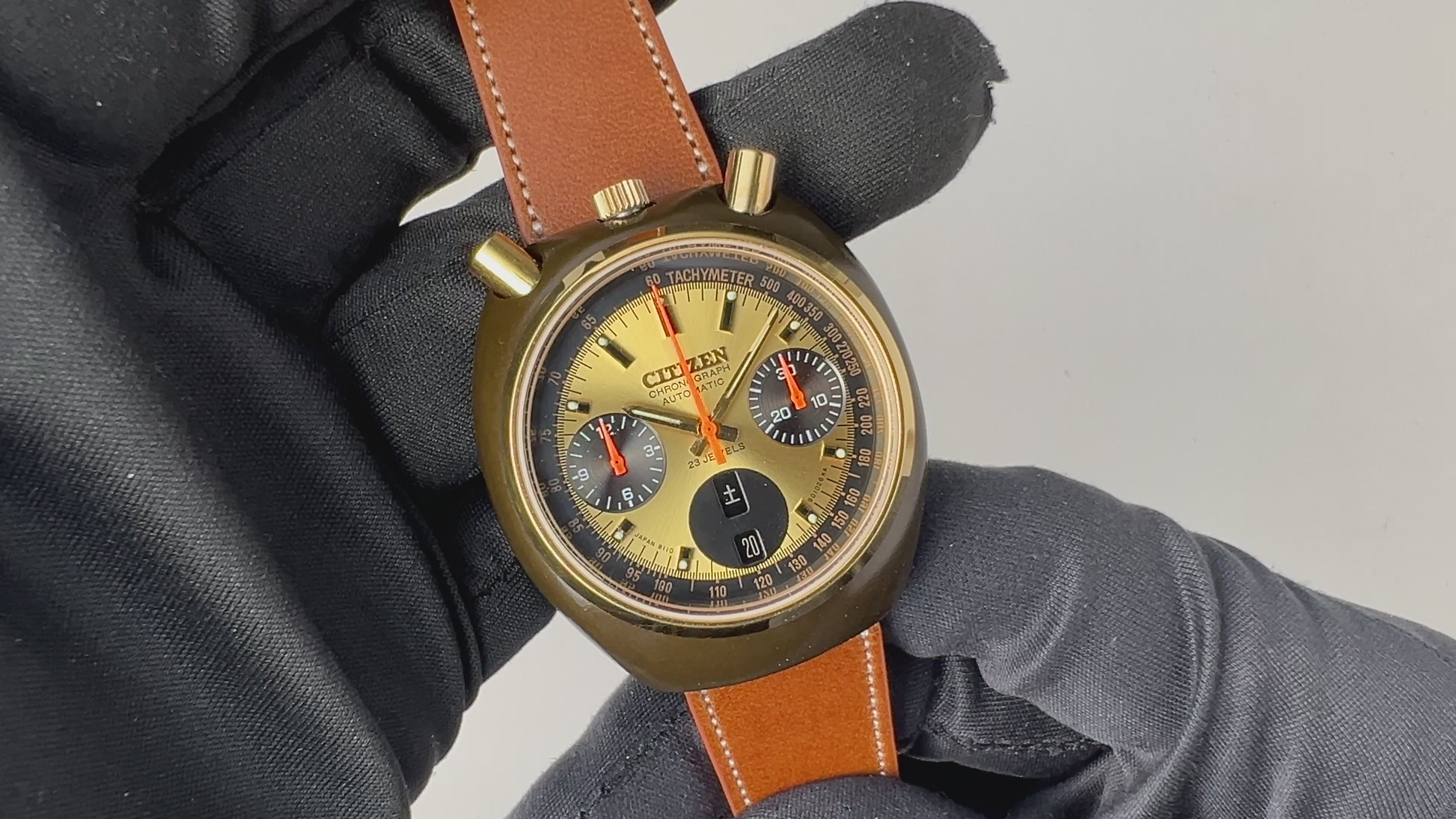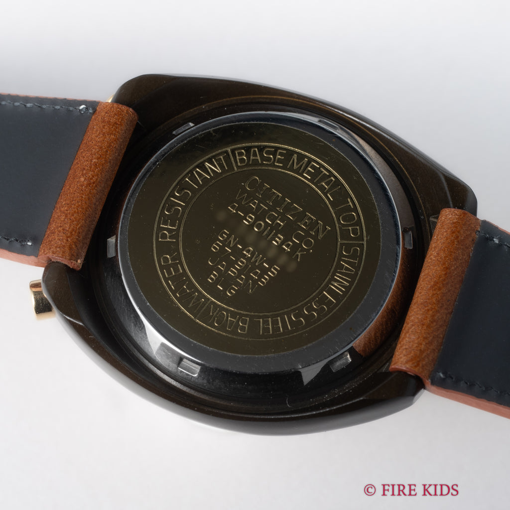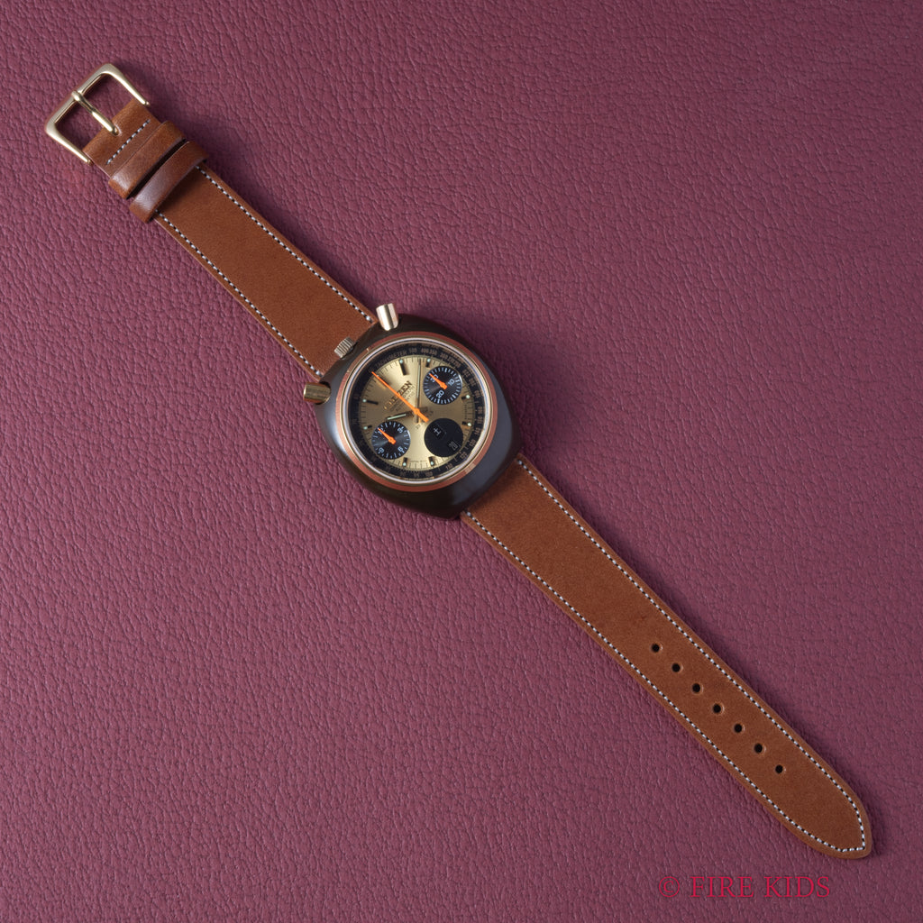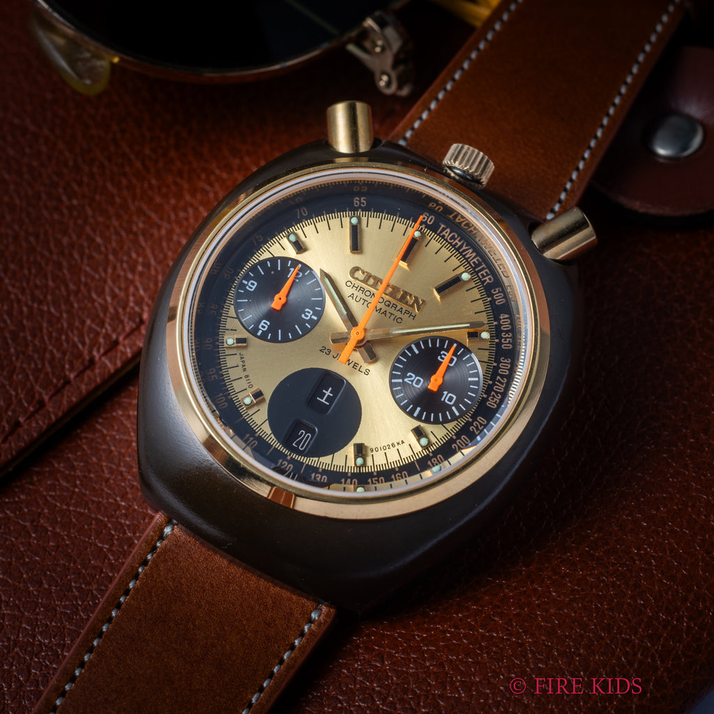 1975年製シチズンのクロノグラフチャレンジタイマーです。12時位置に配されたリューズ、プッシャーから「ツノクロノ」海外では「ブルヘッド」やインダイヤルの見た目から「ミッキー」と呼ばれる人気モデルです。ゴールドの文字盤は、キズの様なダメージはなく綺麗な状態です。シチズンが誇るブラッキーケースも良好なコンディションで、裏蓋に保護シールが残っています。手巻きや針回し、クロノグラフの操作はスムーズです。ベルトはファイアーキッズオリジナルのブッテーロレザーが取り付けられています。こちらは分解掃除済みになります。
