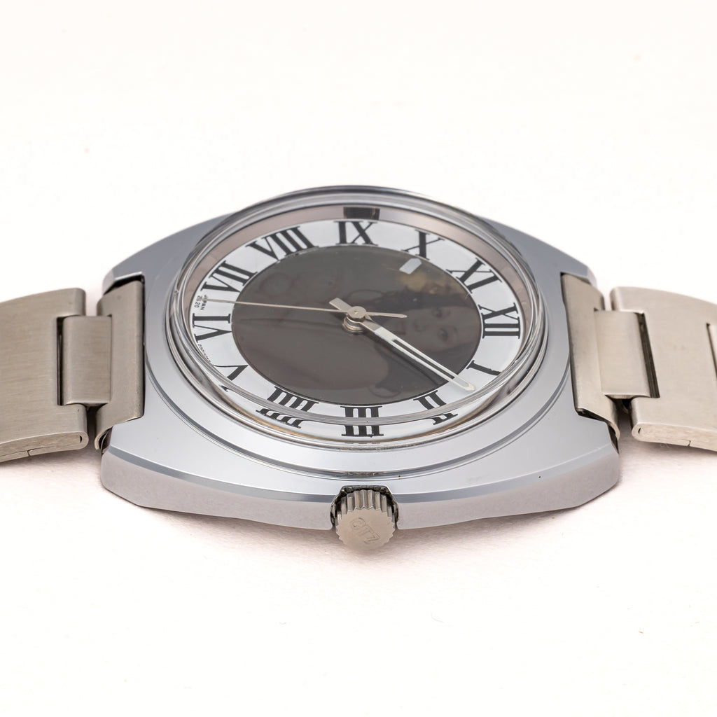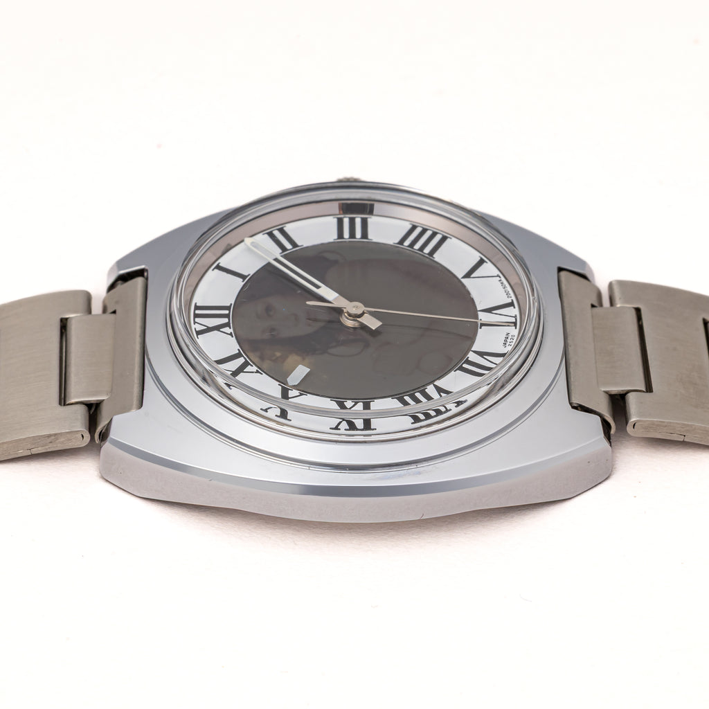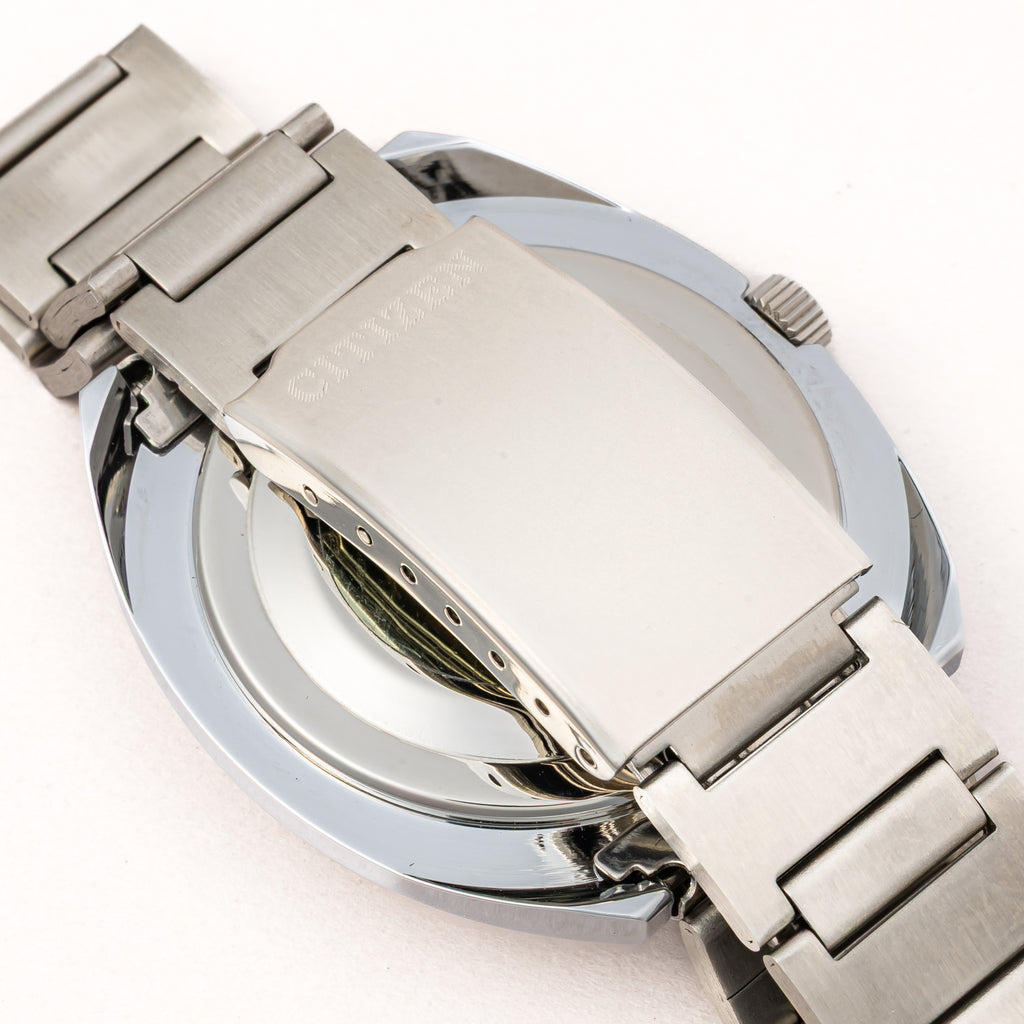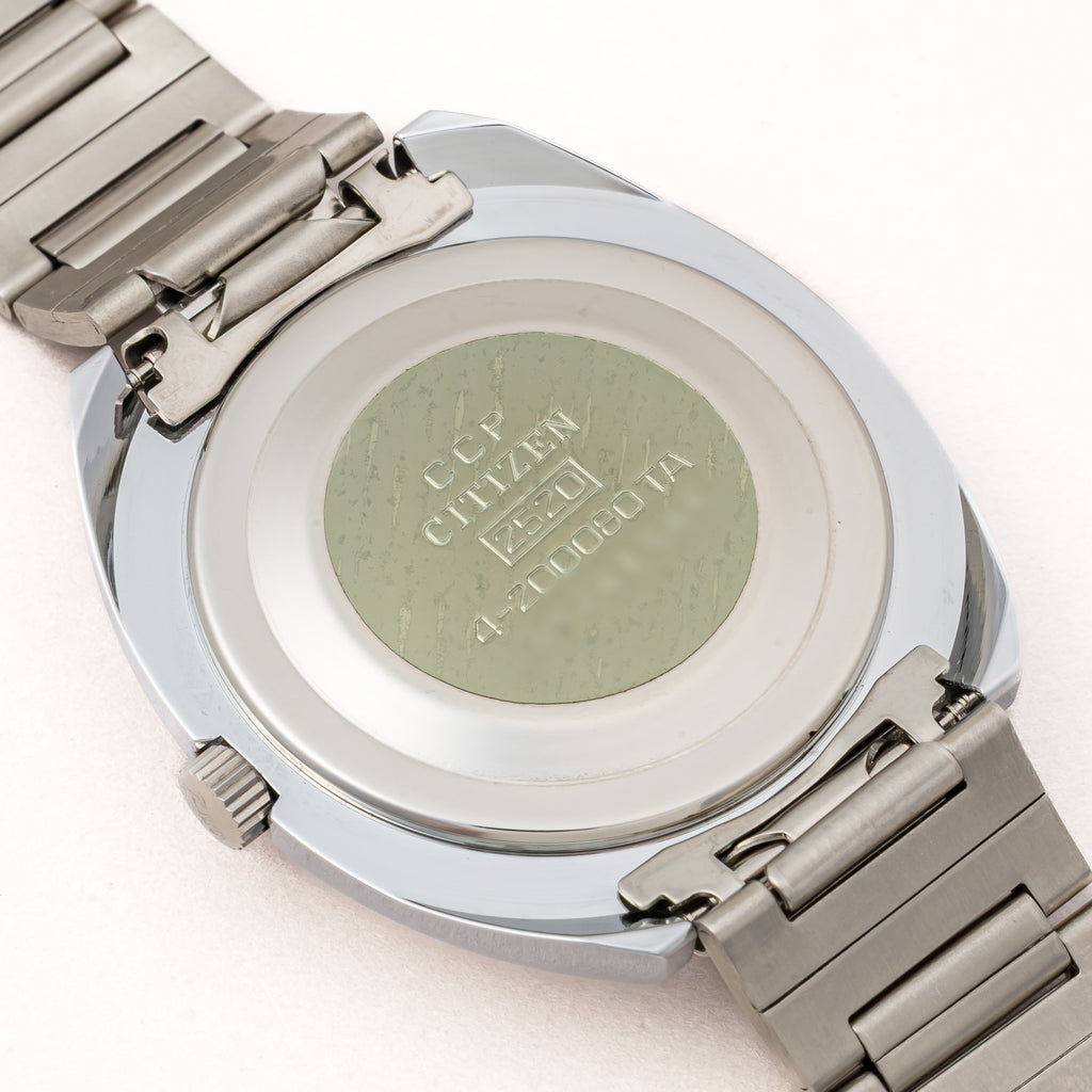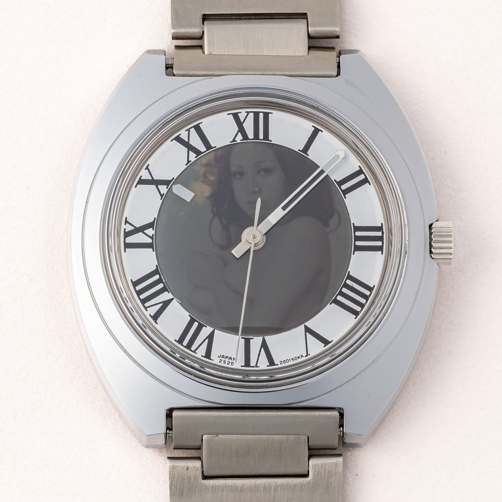 1972年製の偏光ダイヤル Ref.4-200080TA タグ付きです。時刻合わせをすると中央の偏光版から女性のヌード写真が現れるというシチズンの遊び心が詰まった一本です。ケースは小傷が見られますが大きなダメージはございません。ムーブメントは手巻きのCal.2520を搭載。裏蓋のシールも残ったままです。手巻きや針回しの操作はスムースです。ベルトは純正のステンレスブレスが取り付けてあります。