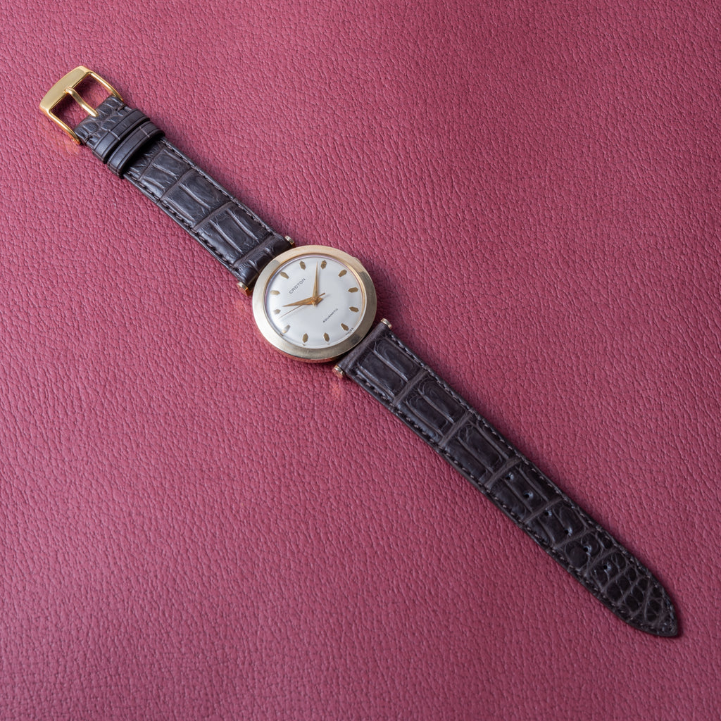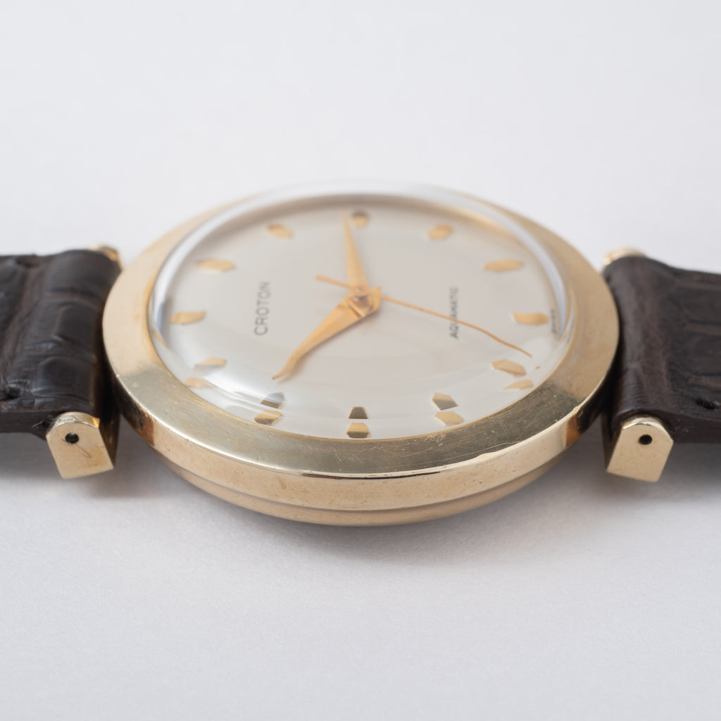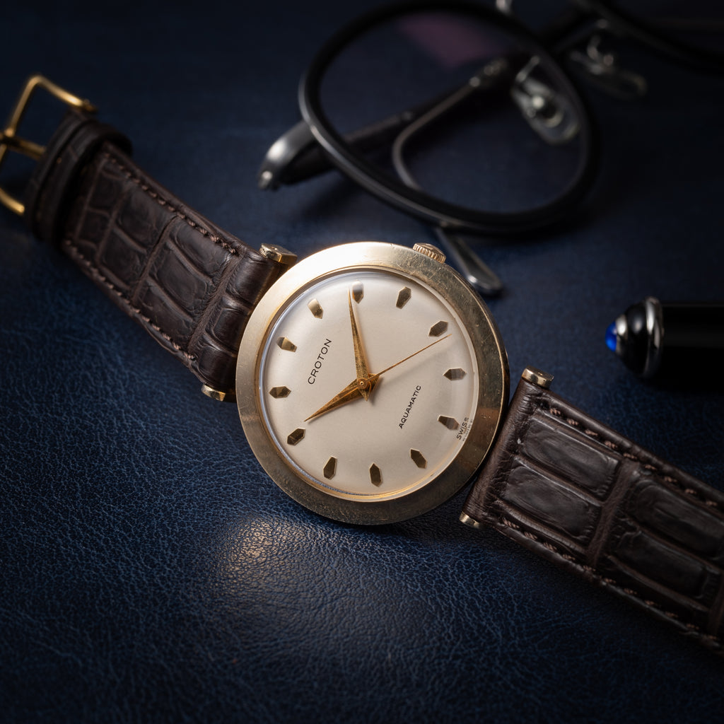 クロトン AQUAMATIC 1960年代製です。ダイヤルはドーム型に膨らんでおり、ダイヤモンド型のインデックスにドルフィンハンドの組み合わせはヴィンテージ感があってカッコいいです。ケースは10KGFにステンレスバックの仕様で、ラグの形状も独特です。ムーブメントは自動巻きのCal.1256を搭載しており、巻き上げも針回しもスムーズです。ベルトはファイアーキッズオリジナルのクロコダイルを合わせています。こちらはOH済みです。