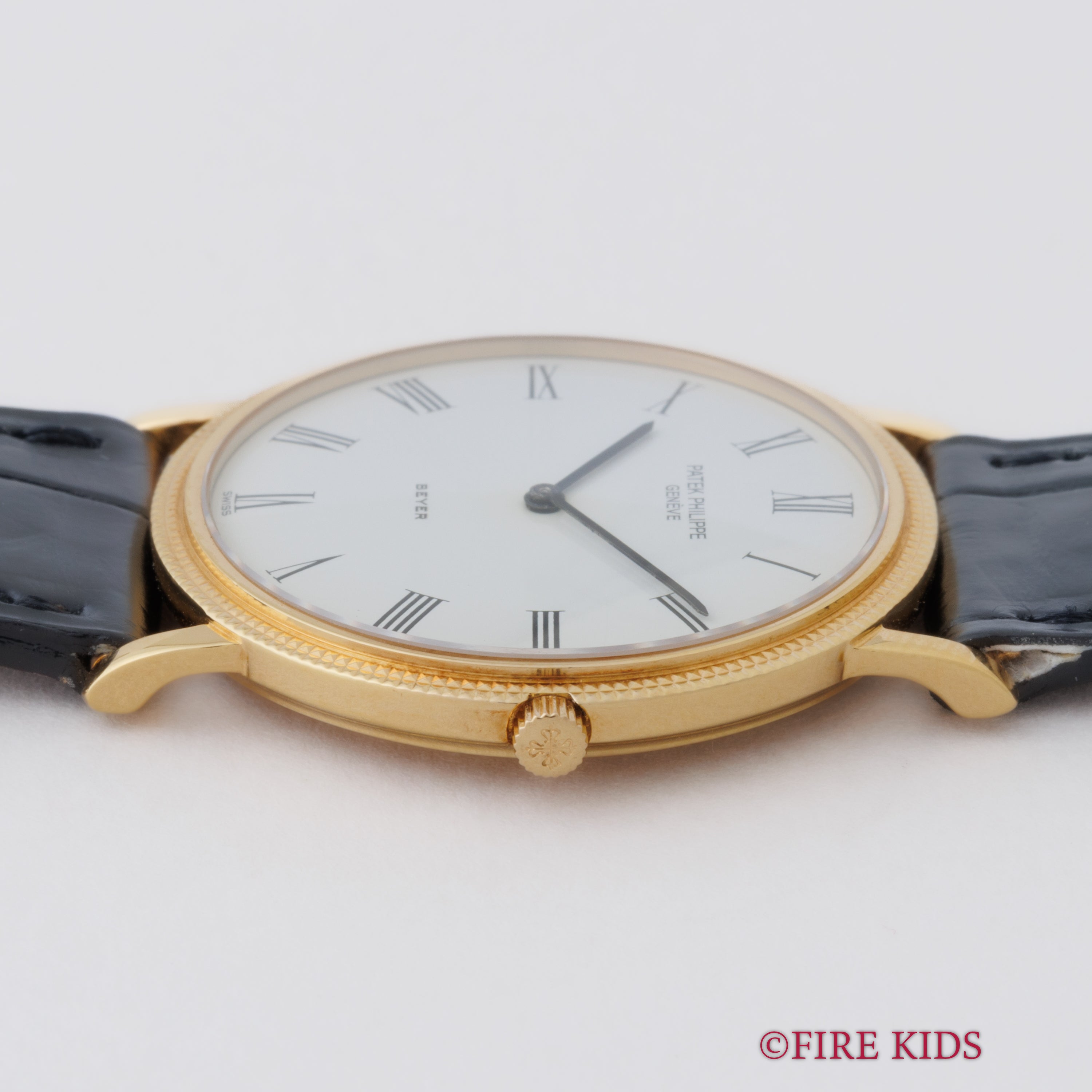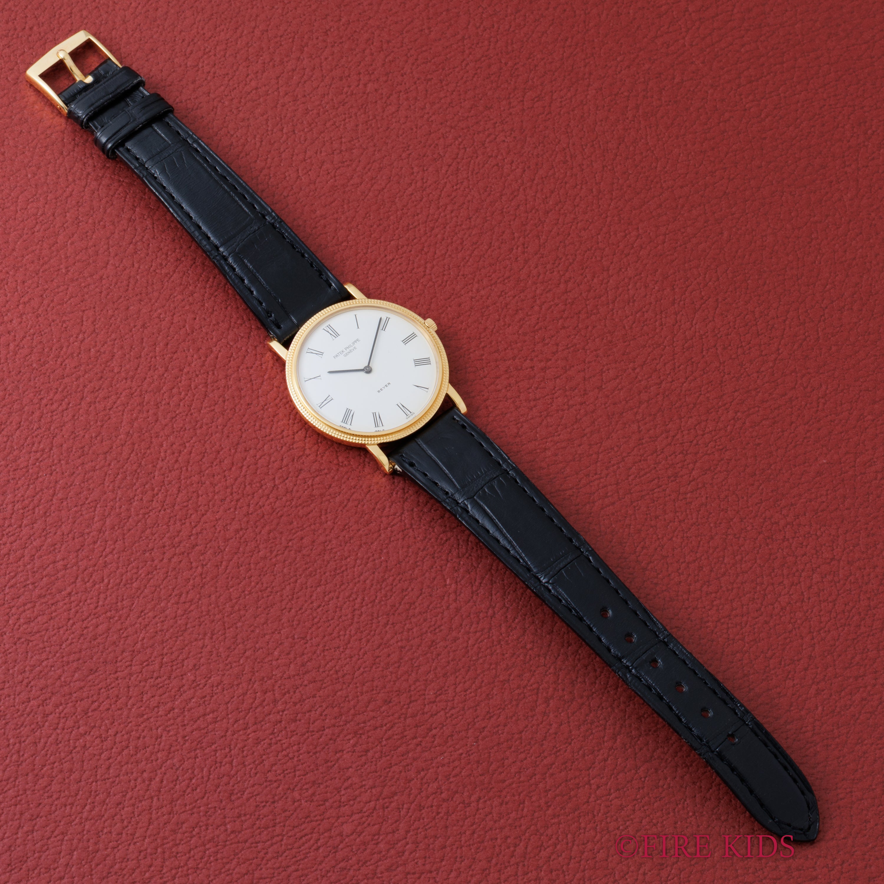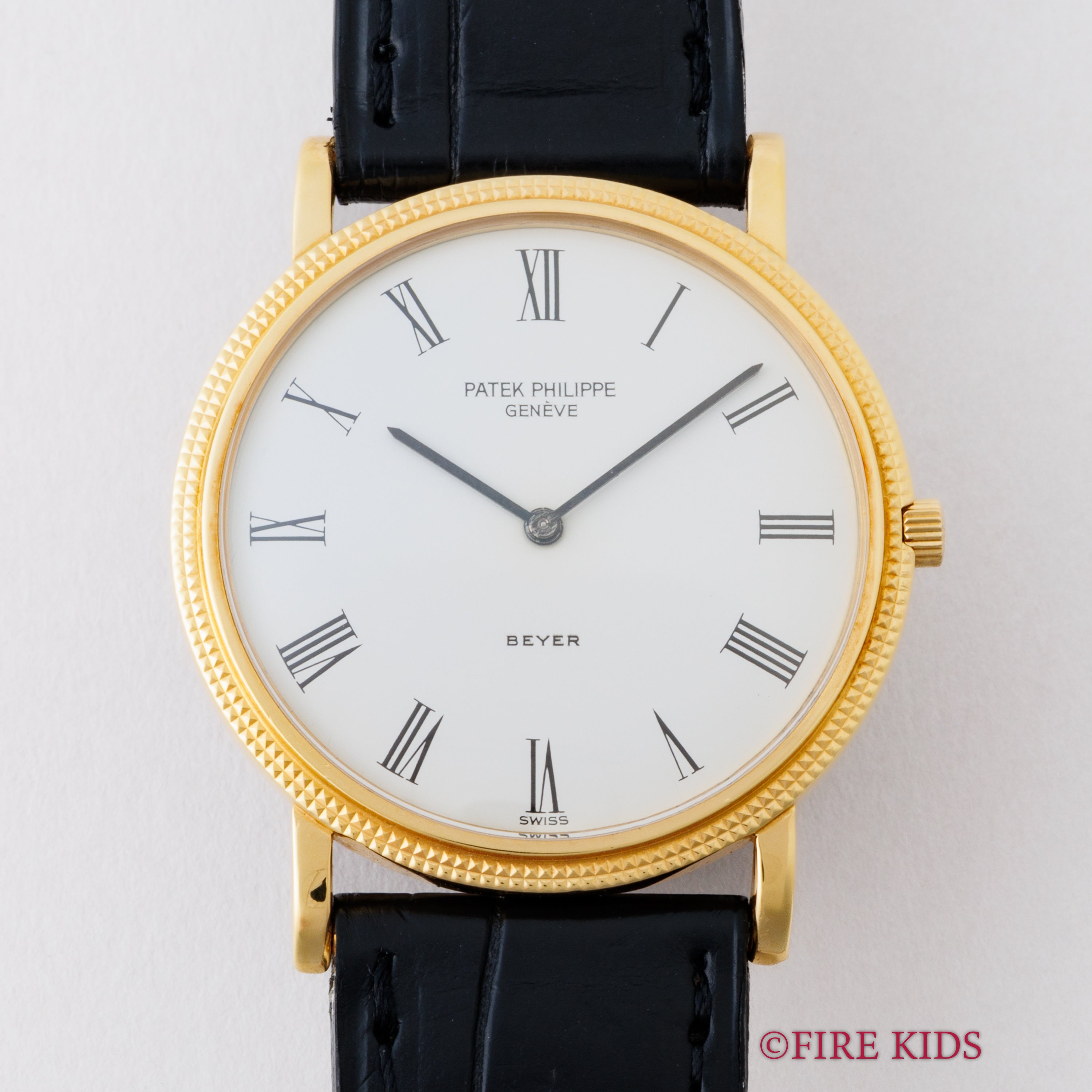 パテックフィリップ 1990年代製 18金無垢イエローゴールド Ref.3520/D ラウンドケース ホワイトローマンダイヤル ベイヤーWネーム 手巻き 純正革ベルト、尾錠付き