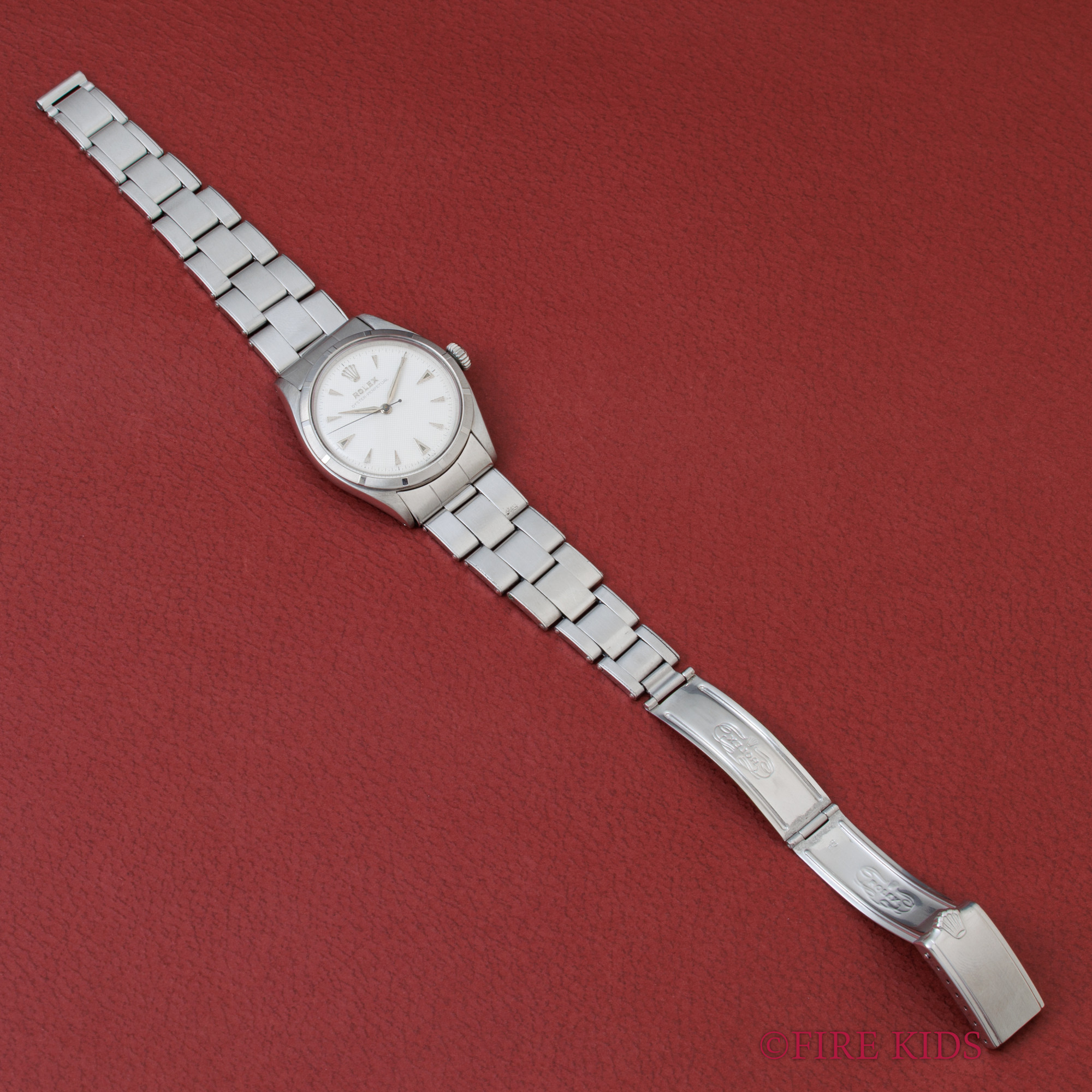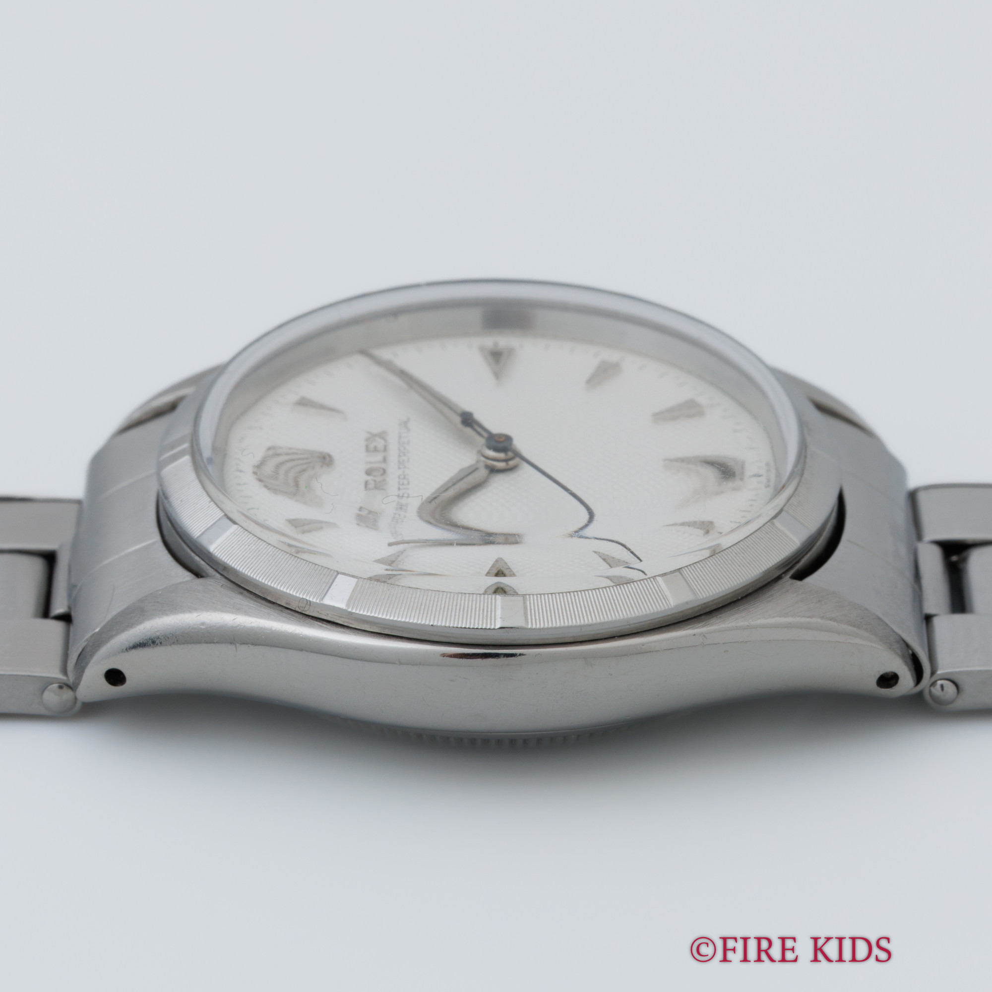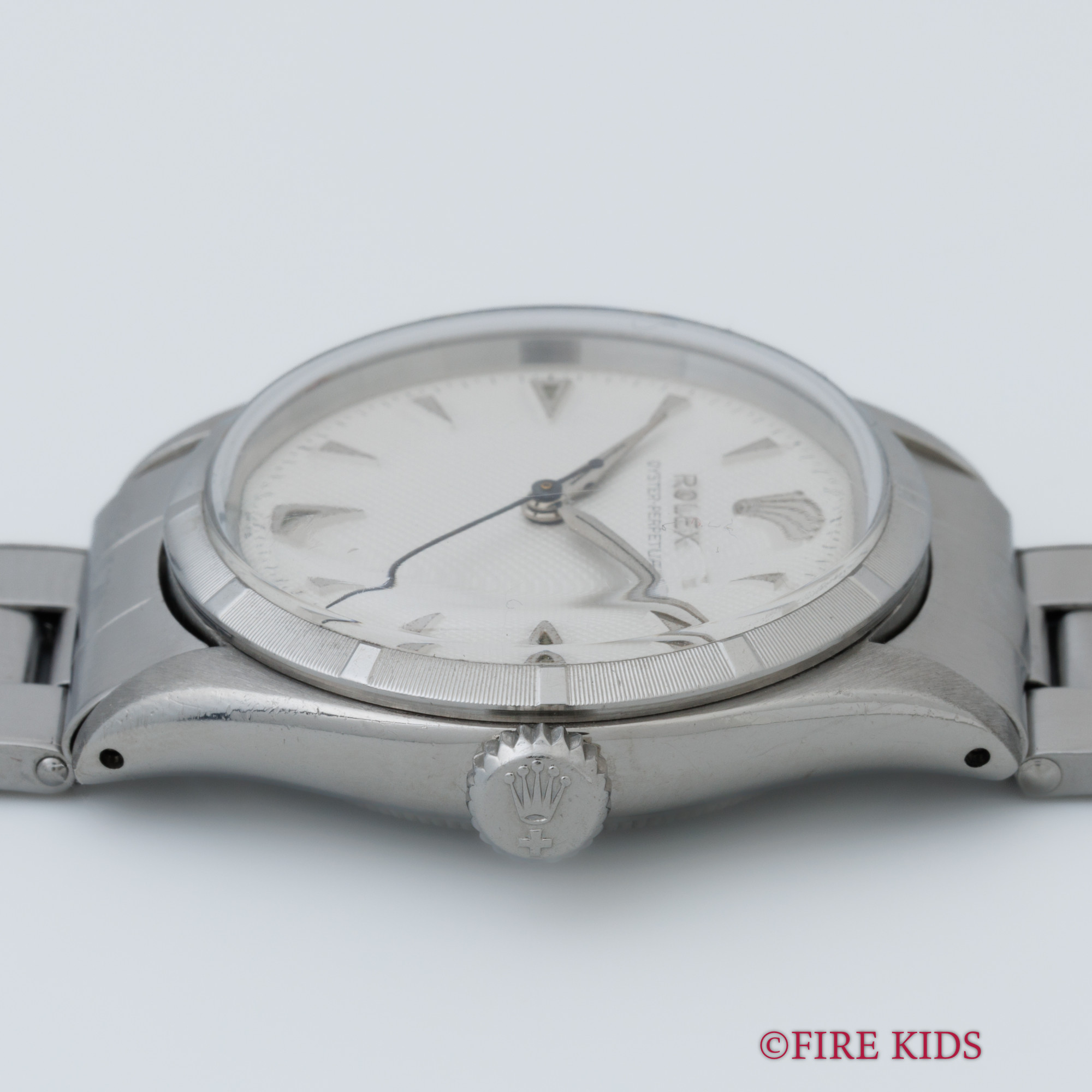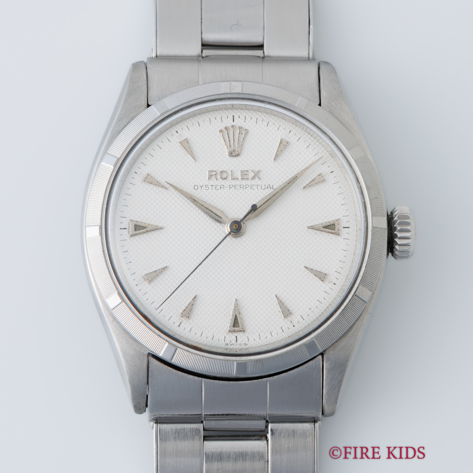 ロレックス セミバブルバック ホワイトギョーシェダイヤル 1954年製 +リューズ 純正リベットブレス エンジンターンドベゼル ノンデイト 自動巻き