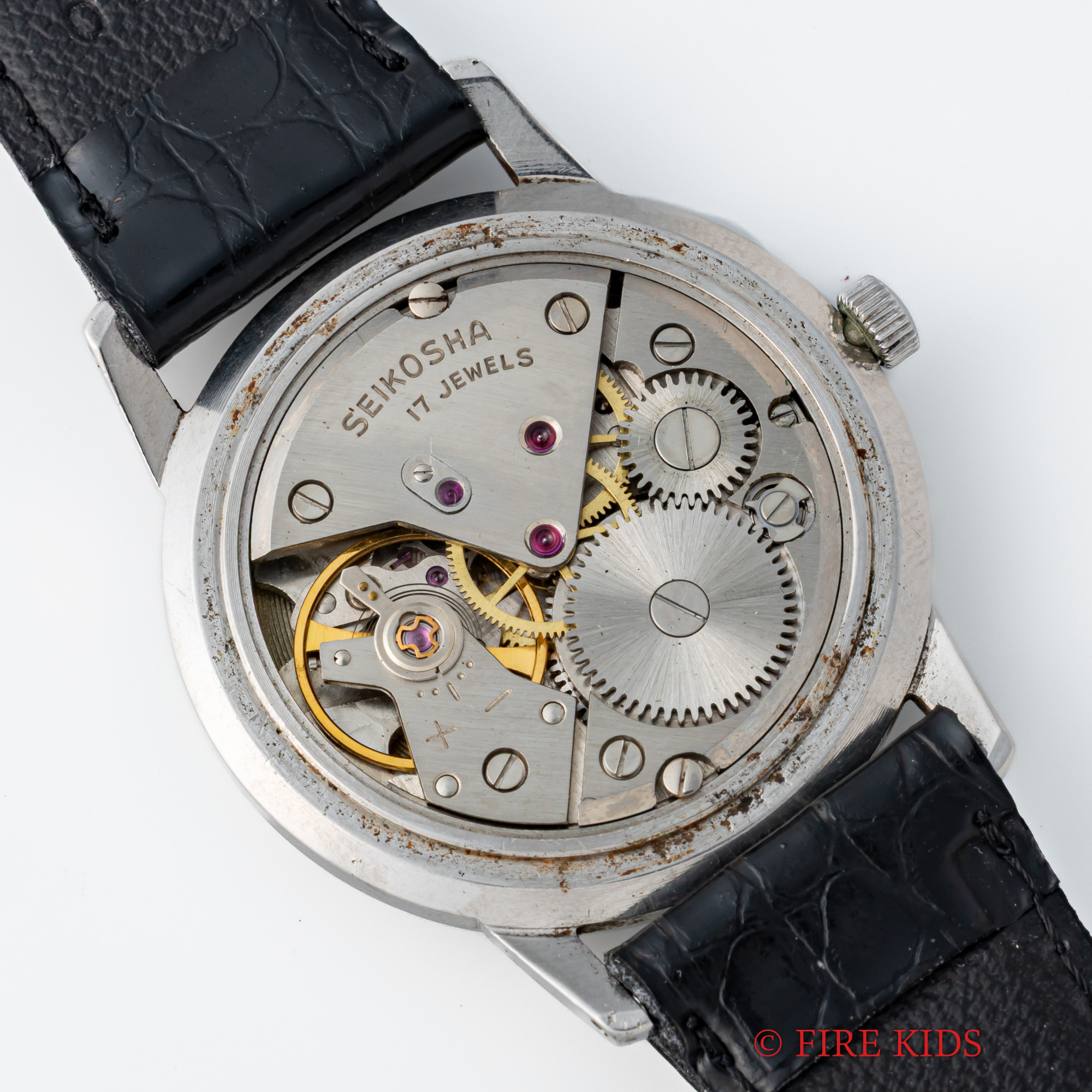 - ヴィンテージ時計の特性上、風防・パッキン・リューズ・バネ棒などの消耗部品は後年メンテナンス過程で交換されている場合がございます。オリジナル性を重視しておりますが、必要に応じて適切な部品にて調整されていますので、よりコレクション性重視のお求めのお客様は事前にご確認ください。
