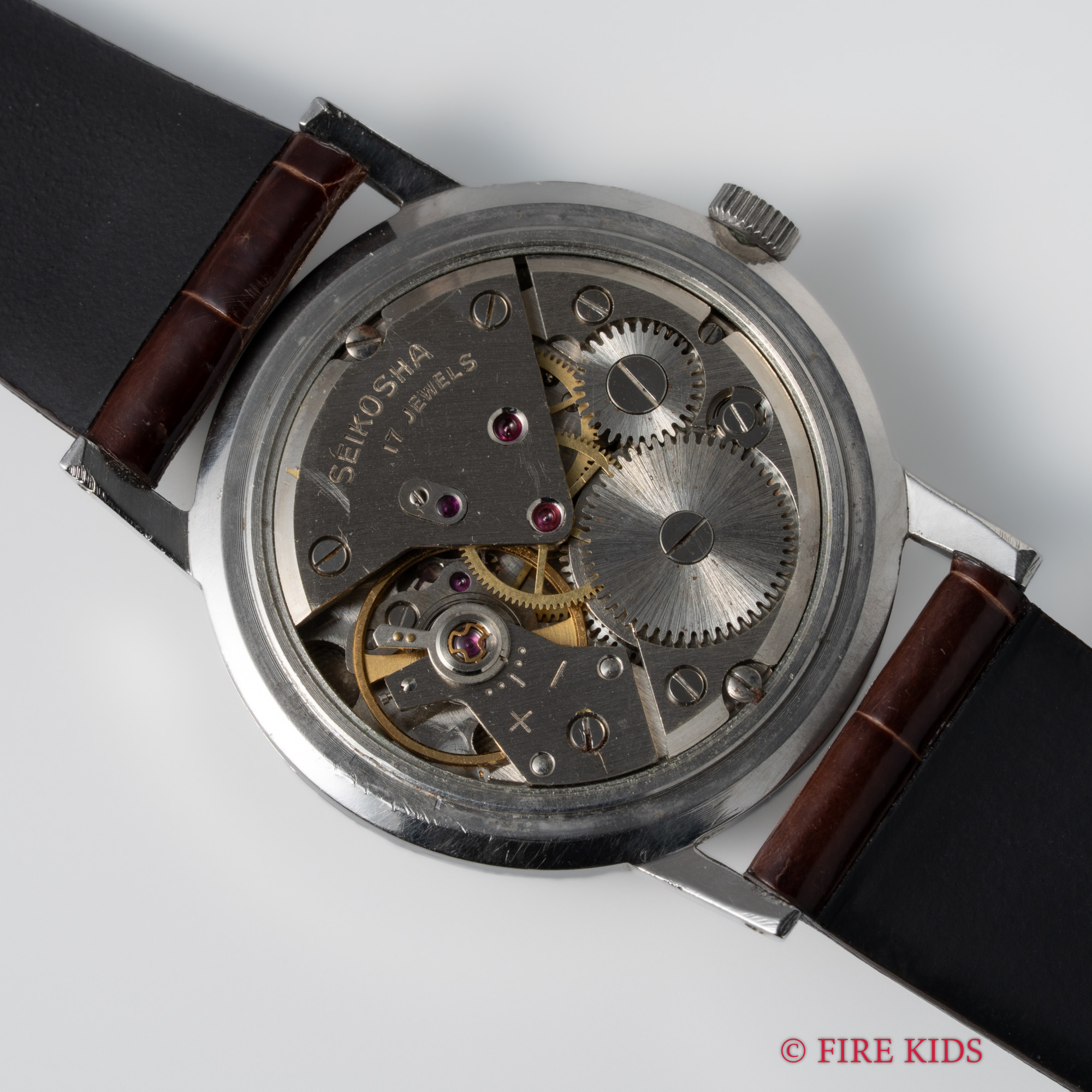 - ヴィンテージ時計の特性上、風防・パッキン・リューズ・バネ棒などの消耗部品は後年メンテナンス過程で交換されている場合がございます。オリジナル性を重視しておりますが、必要に応じて適切な部品にて調整されていますので、よりコレクション性重視のお求めのお客様は事前にご確認ください。