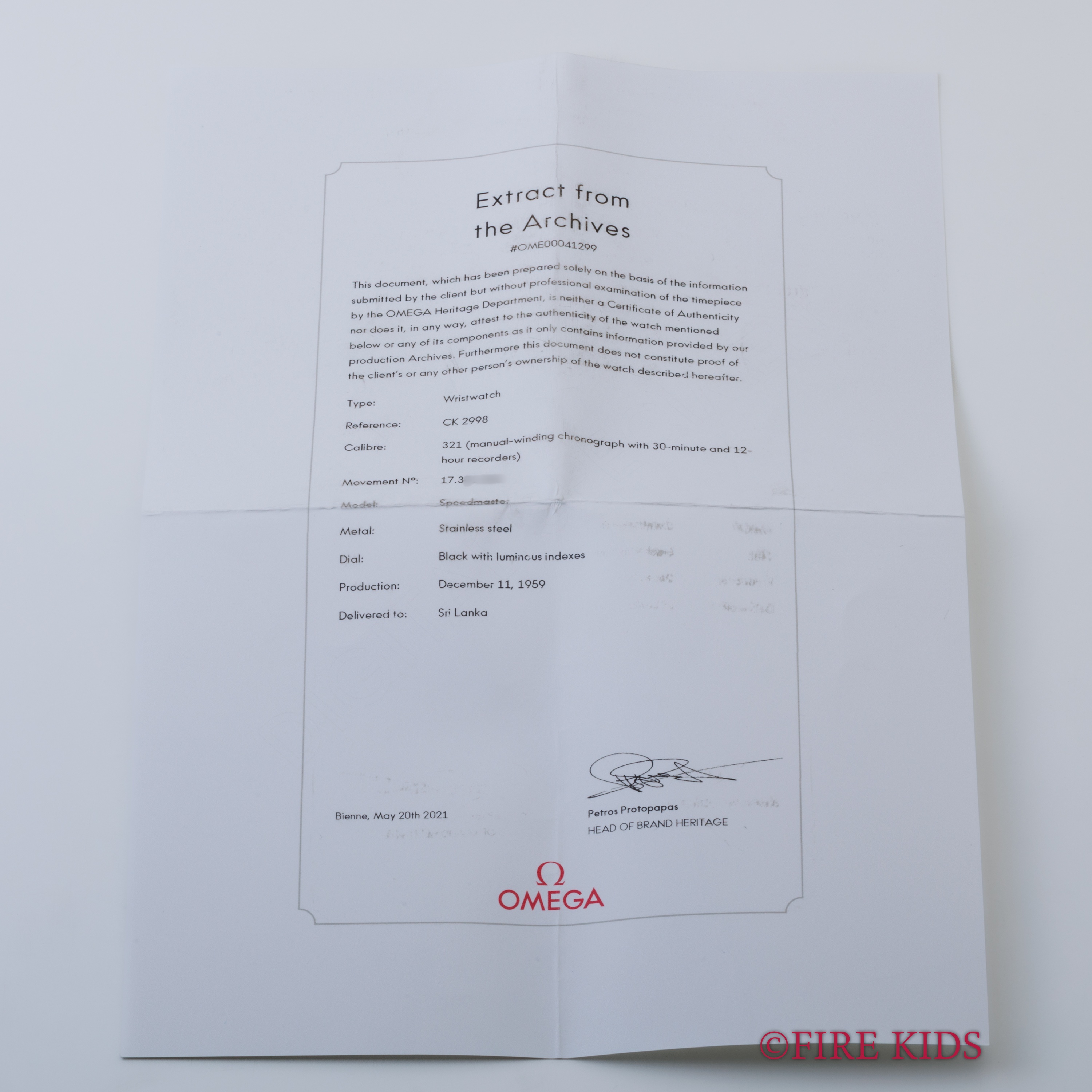 オメガ スピードマスター 2nd Ref.CK2998-1 アルファハンド 1959年製 Cal.321 手巻き アーカイブ写し付き 純正キャタピラブレス BASE1000ベゼル