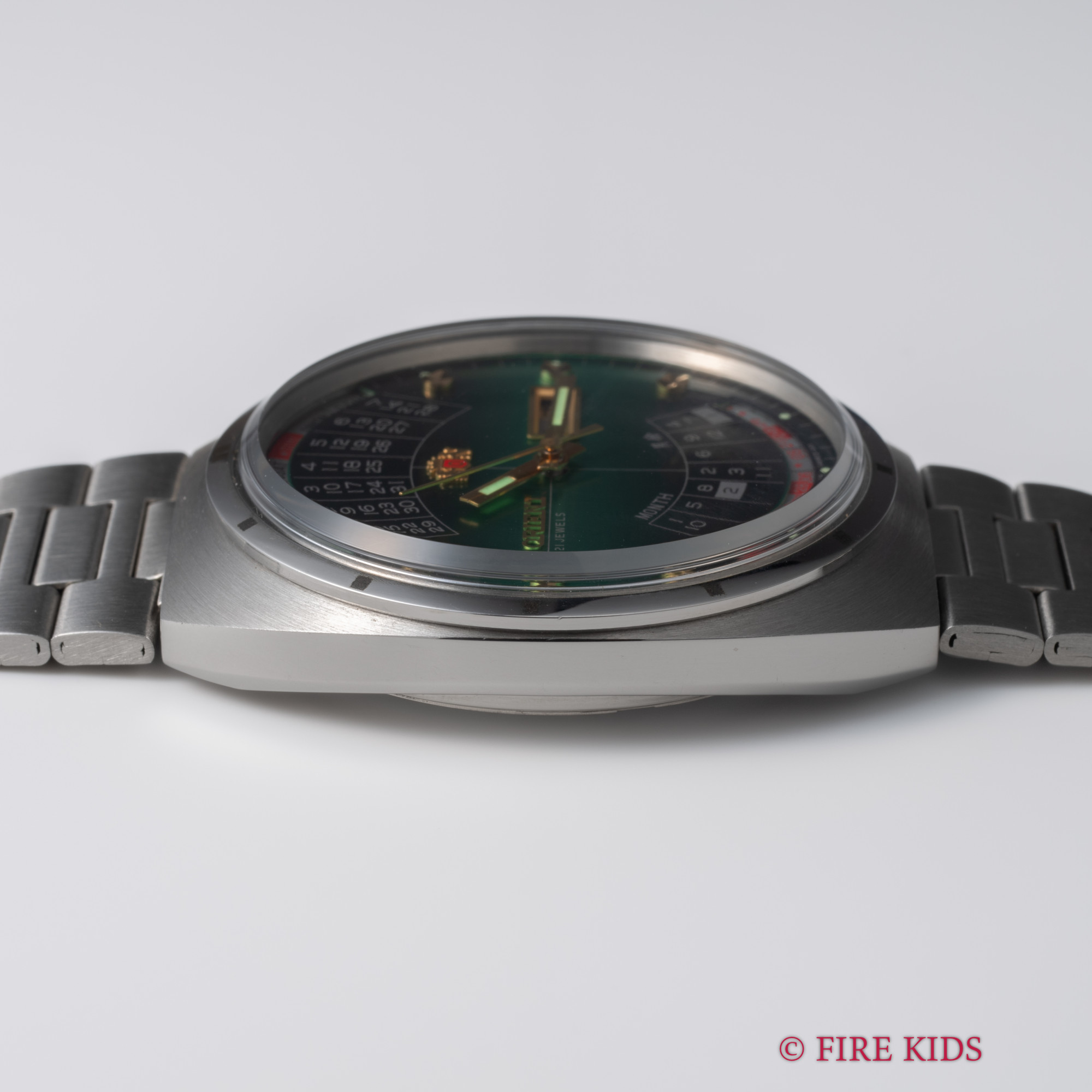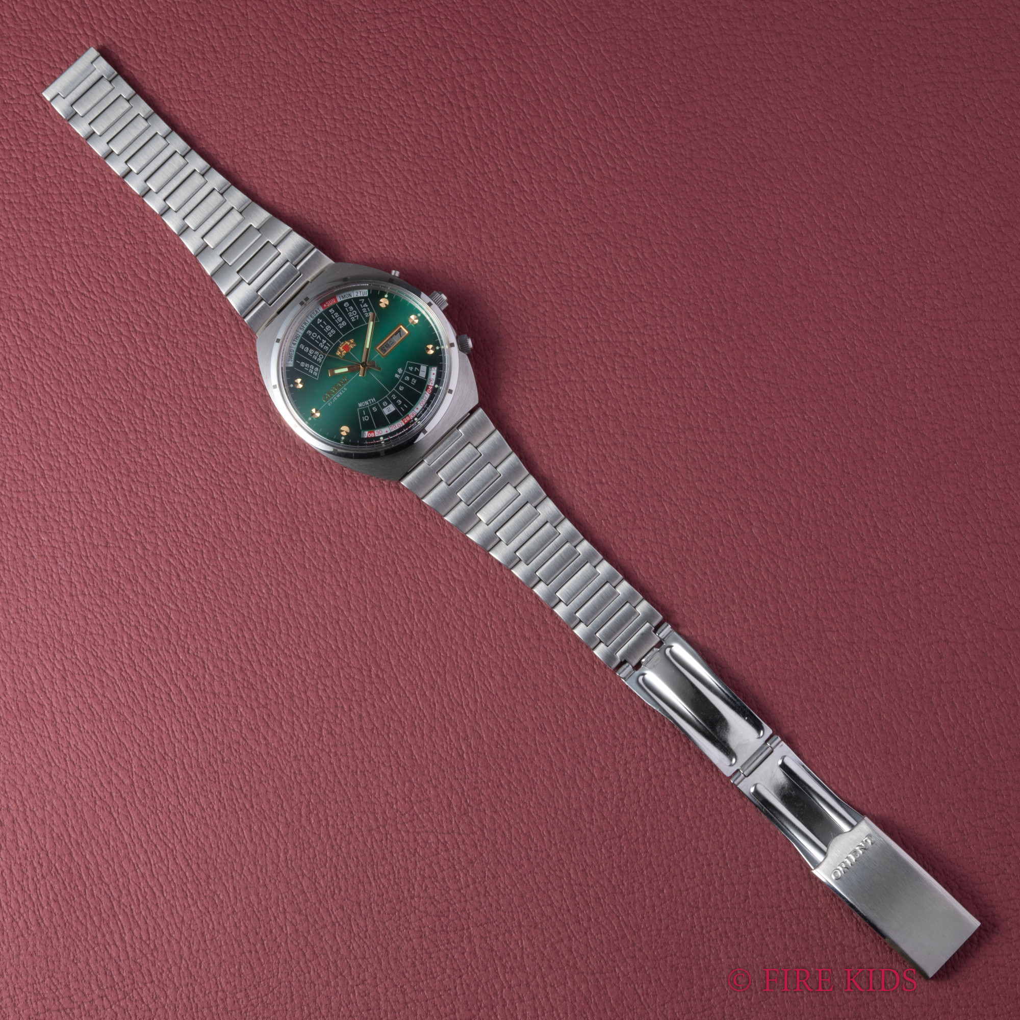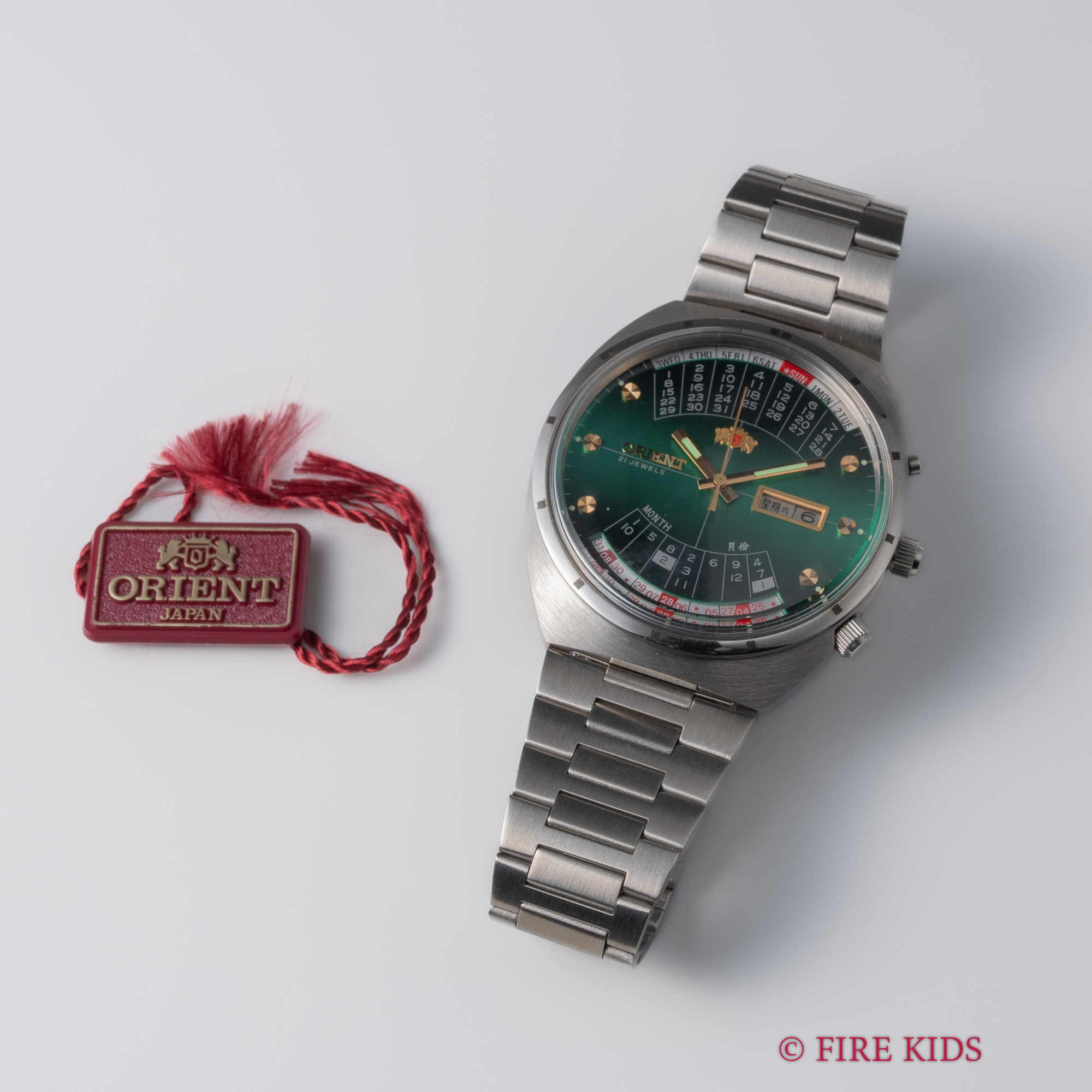 オリエント 万年カレンダー未使用美品 1970年代製 グリーンダイヤル 自動巻 純正ステンレスブレス タグ付