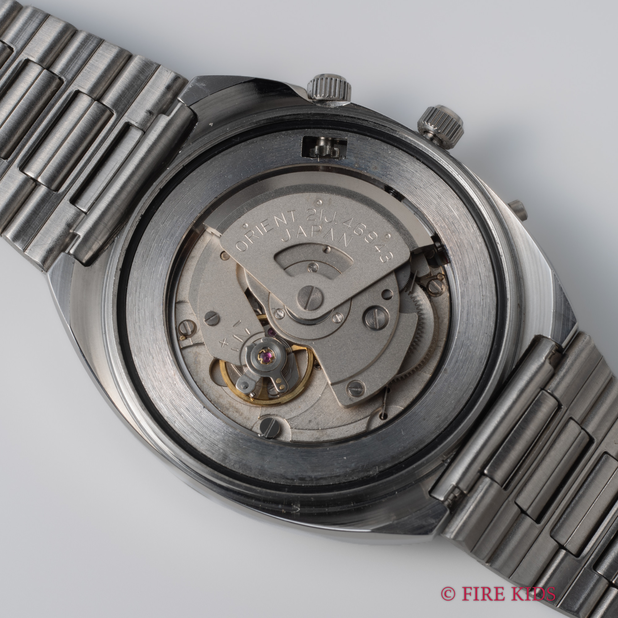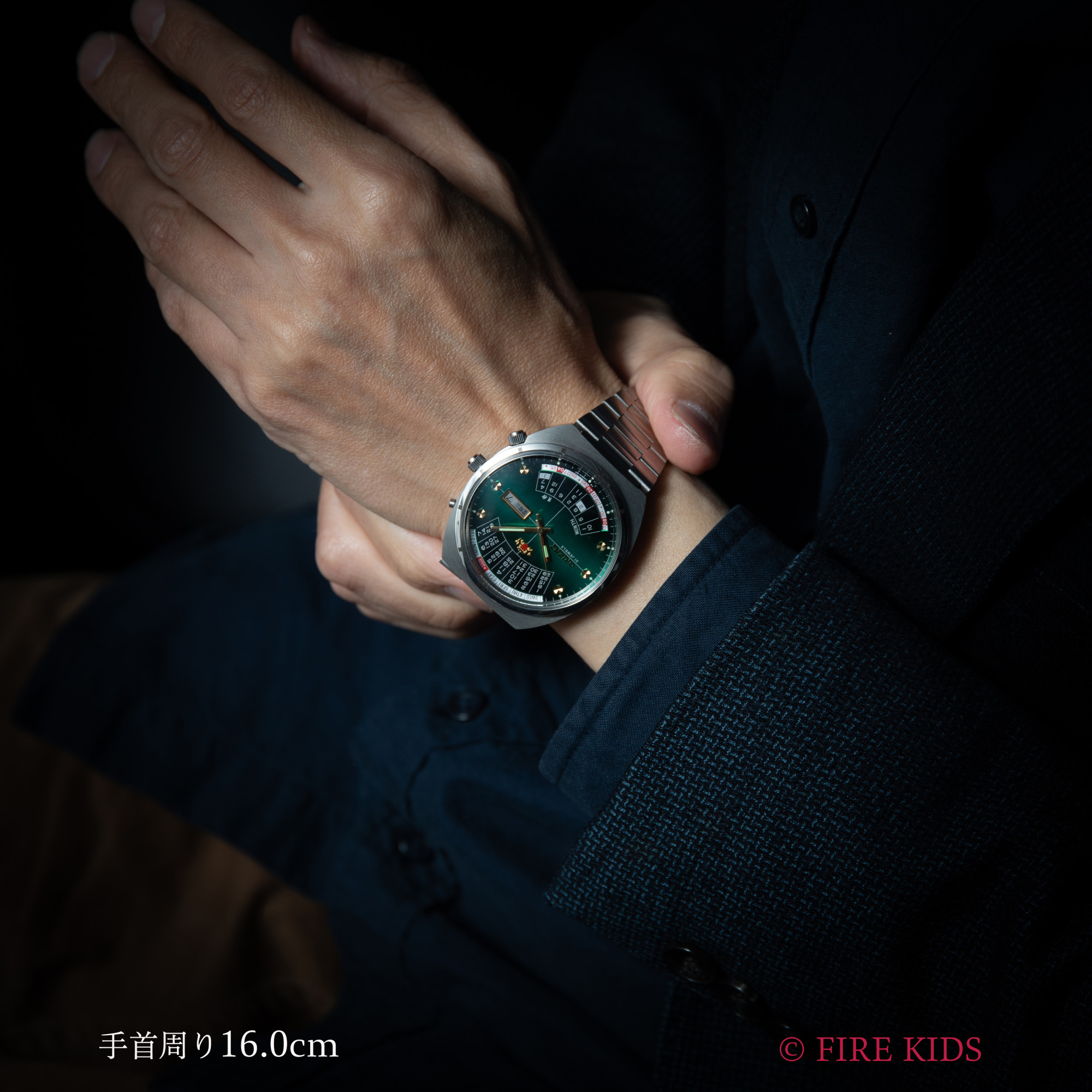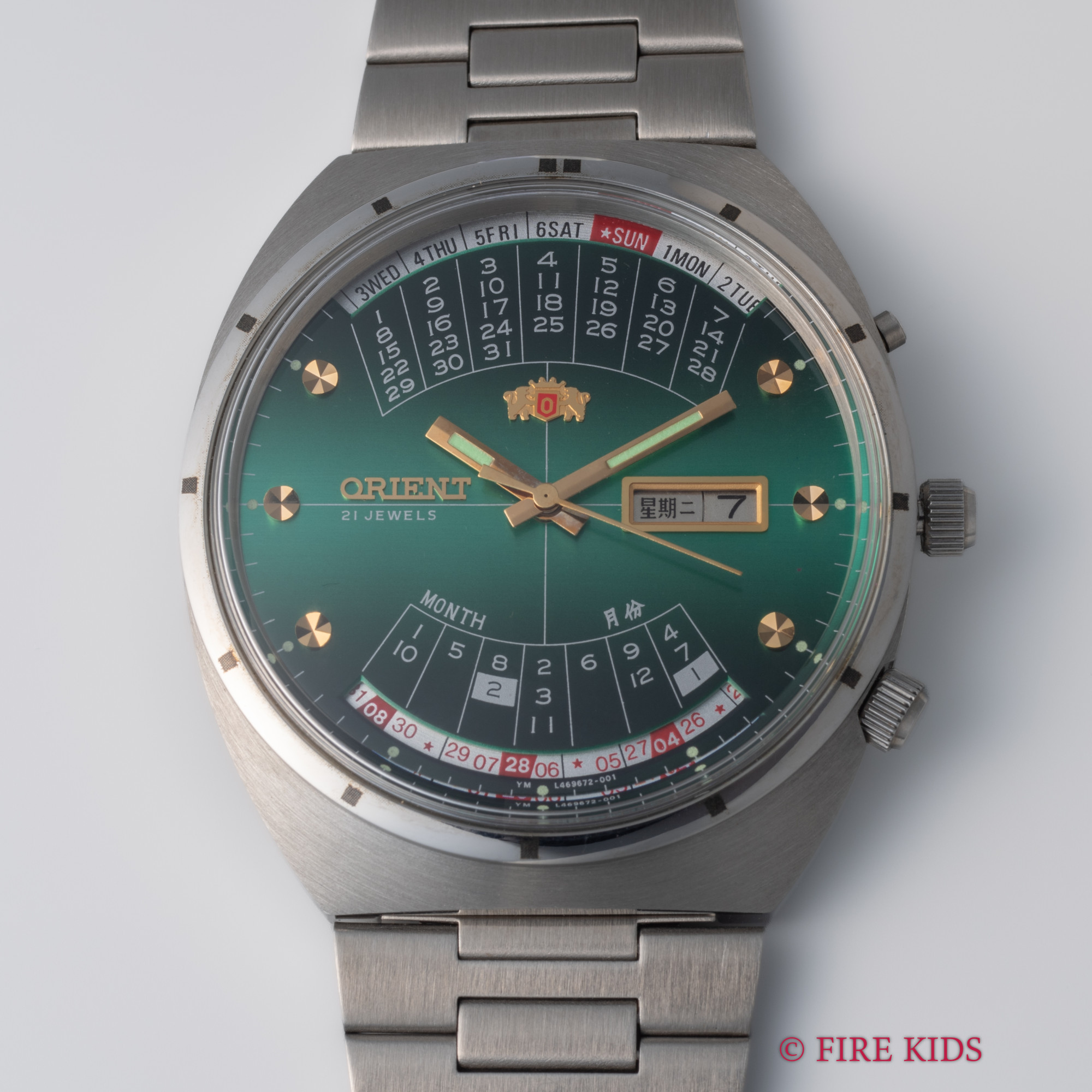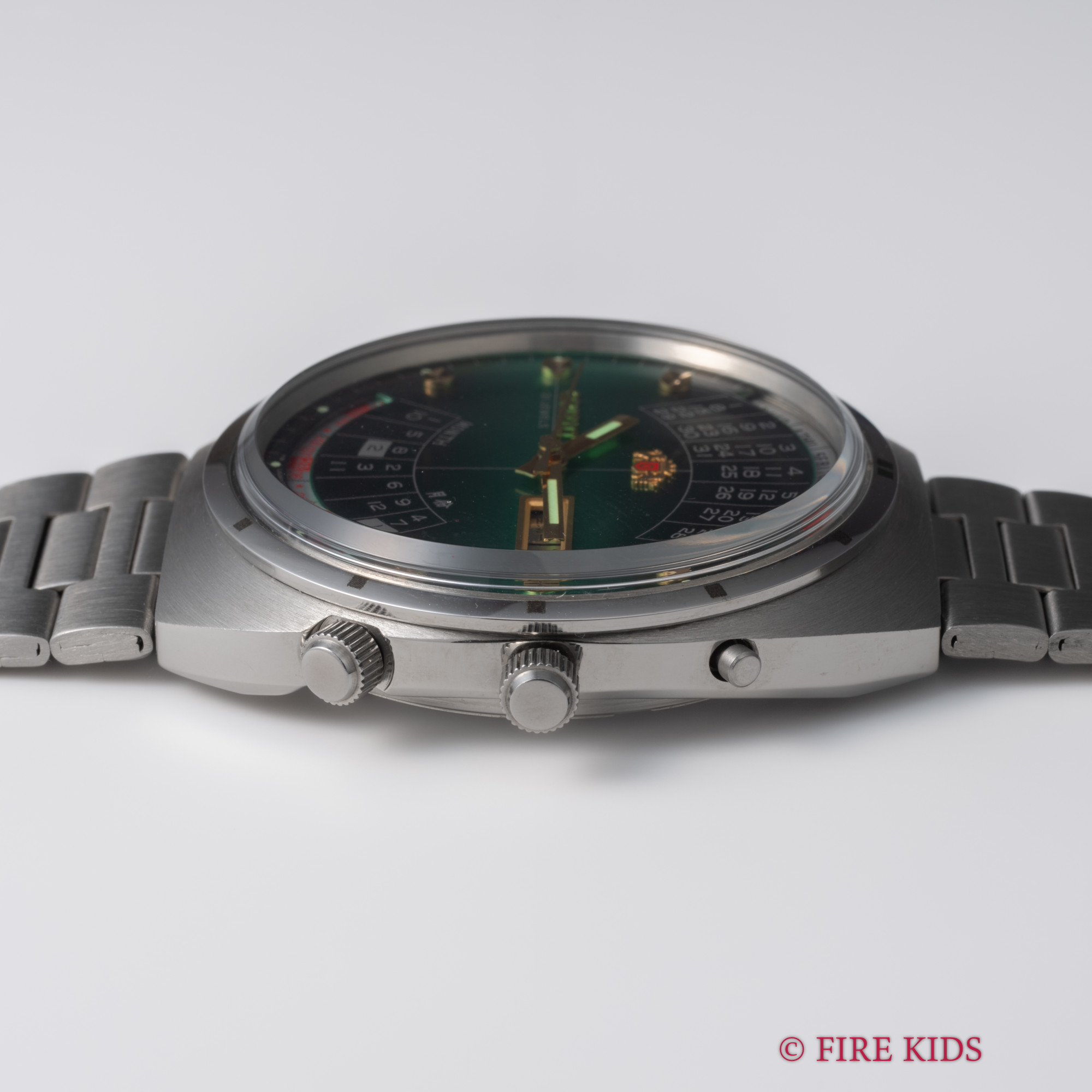 オリエント 万年カレンダー未使用美品 1970年代製 グリーンダイヤル 自動巻 純正ステンレスブレス タグ付