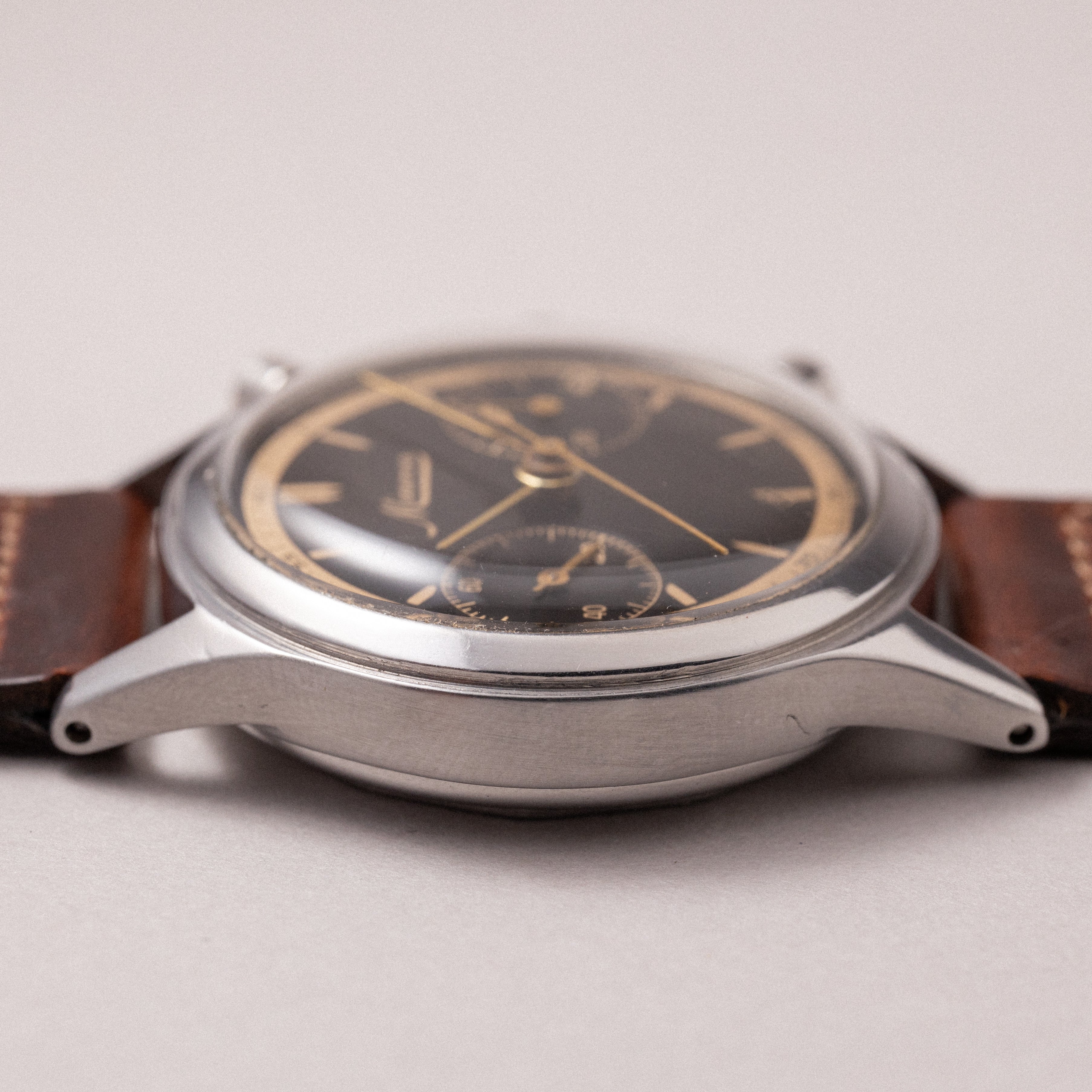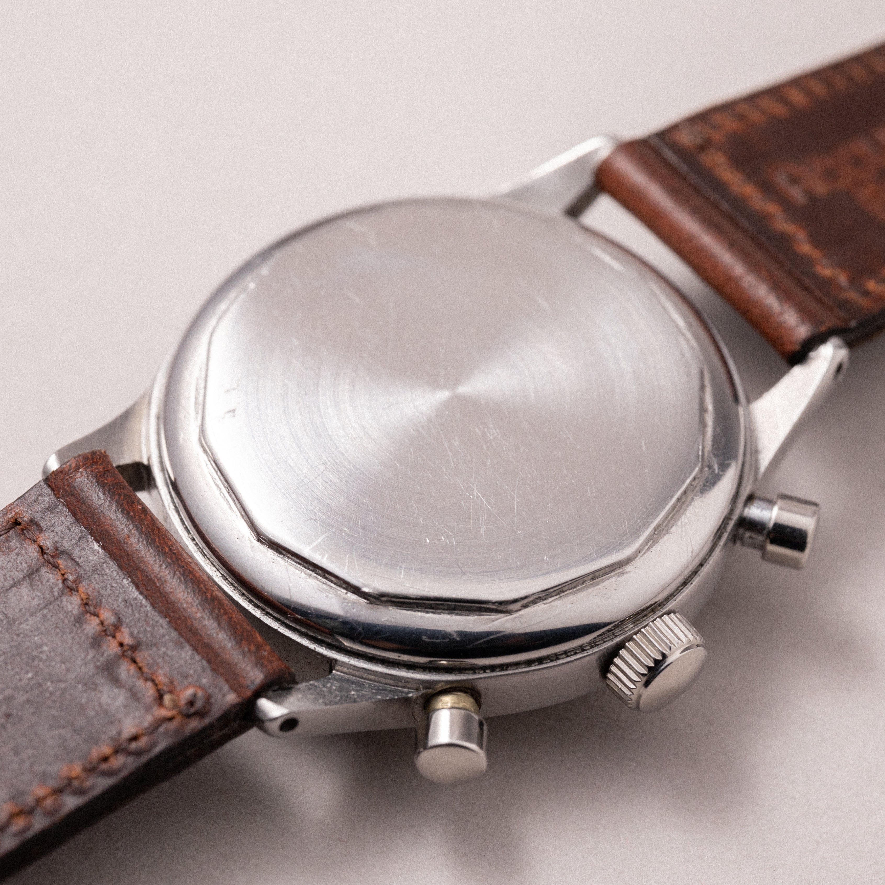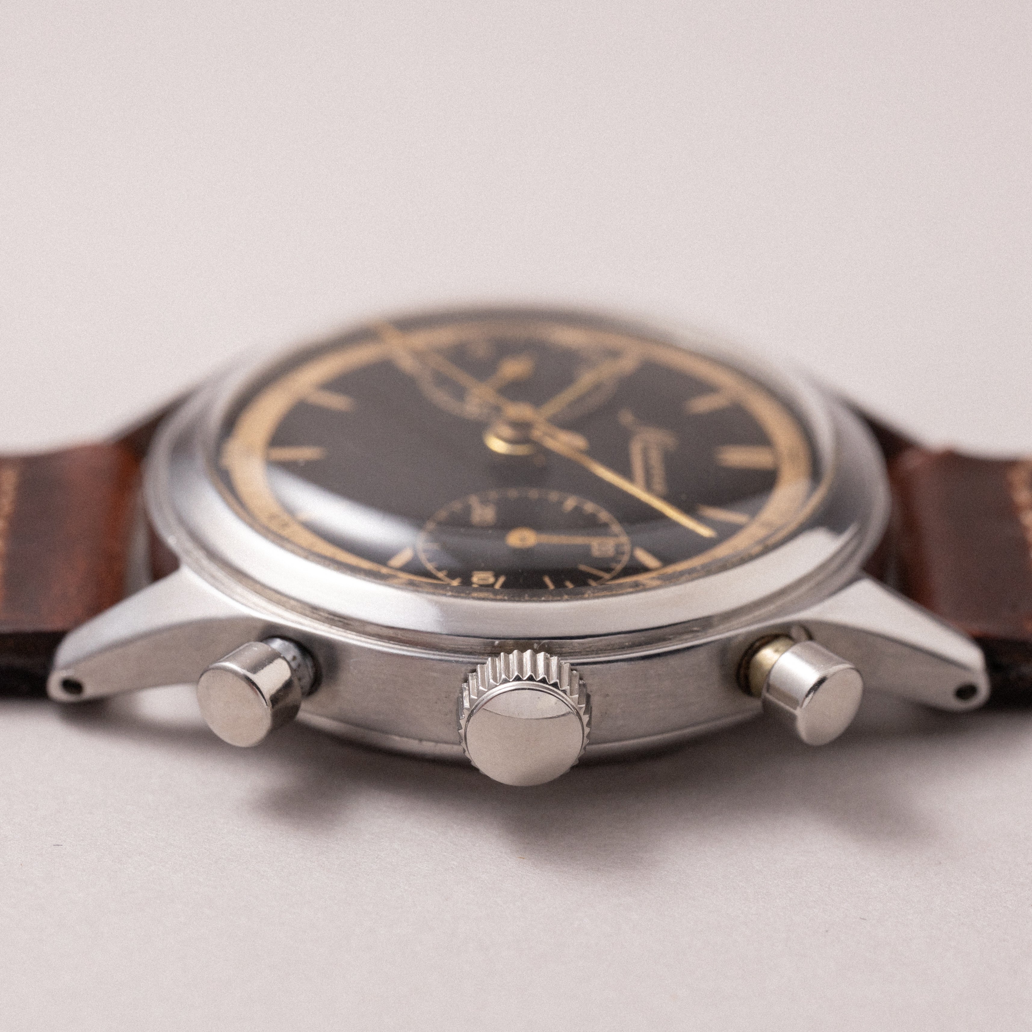 - ヴィンテージ時計の特性上、風防・パッキン・リューズ・バネ棒などの消耗部品は後年メンテナンス過程で交換されている場合がございます。オリジナル性を重視しておりますが、必要に応じて適切な部品にて調整されていますので、よりコレクション性重視のお求めのお客様は事前にご確認ください。