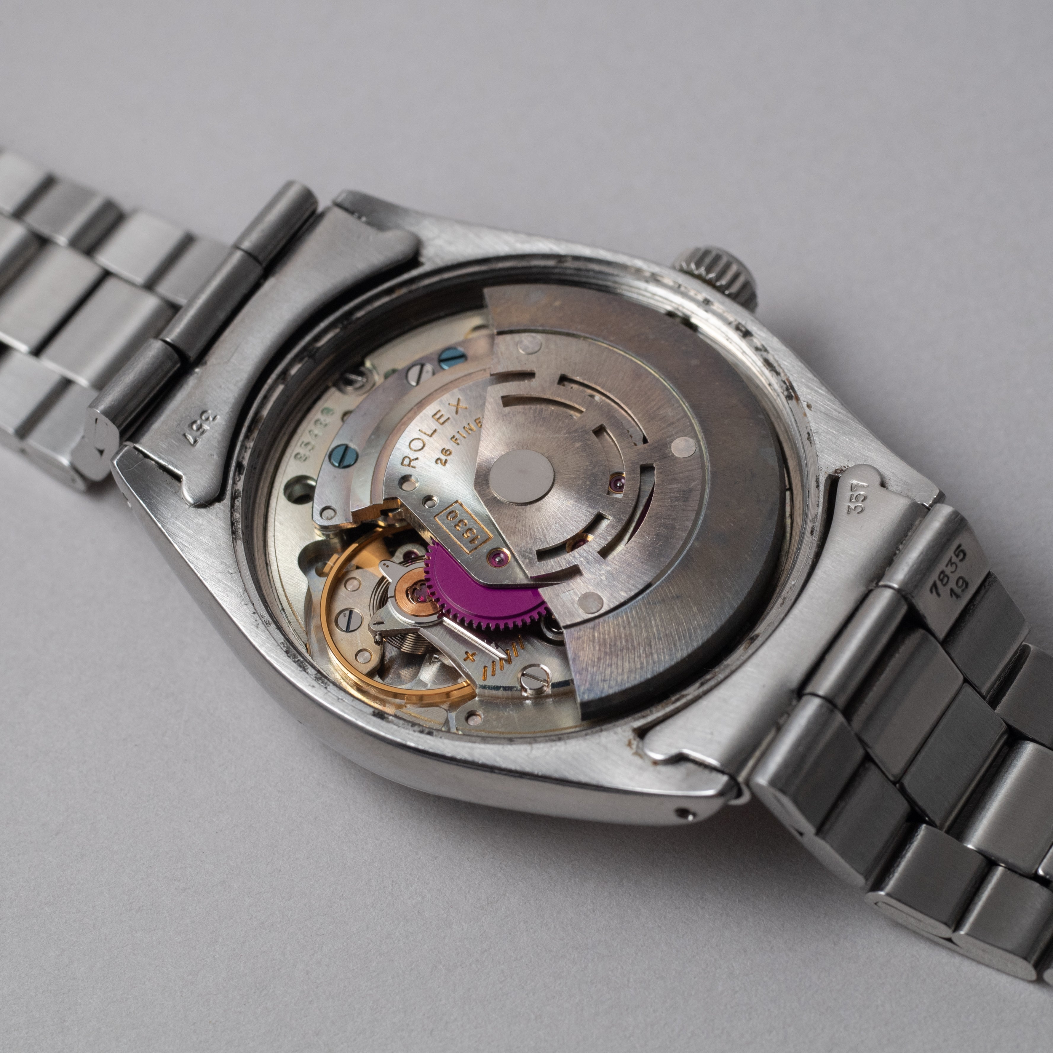 - ヴィンテージ時計の特性上、風防・パッキン・リューズ・バネ棒などの消耗部品は後年メンテナンス過程で交換されている場合がございます。オリジナル性を重視しておりますが、必要に応じて適切な部品にて調整されていますので、よりコレクション性重視のお求めのお客様は事前にご確認ください。