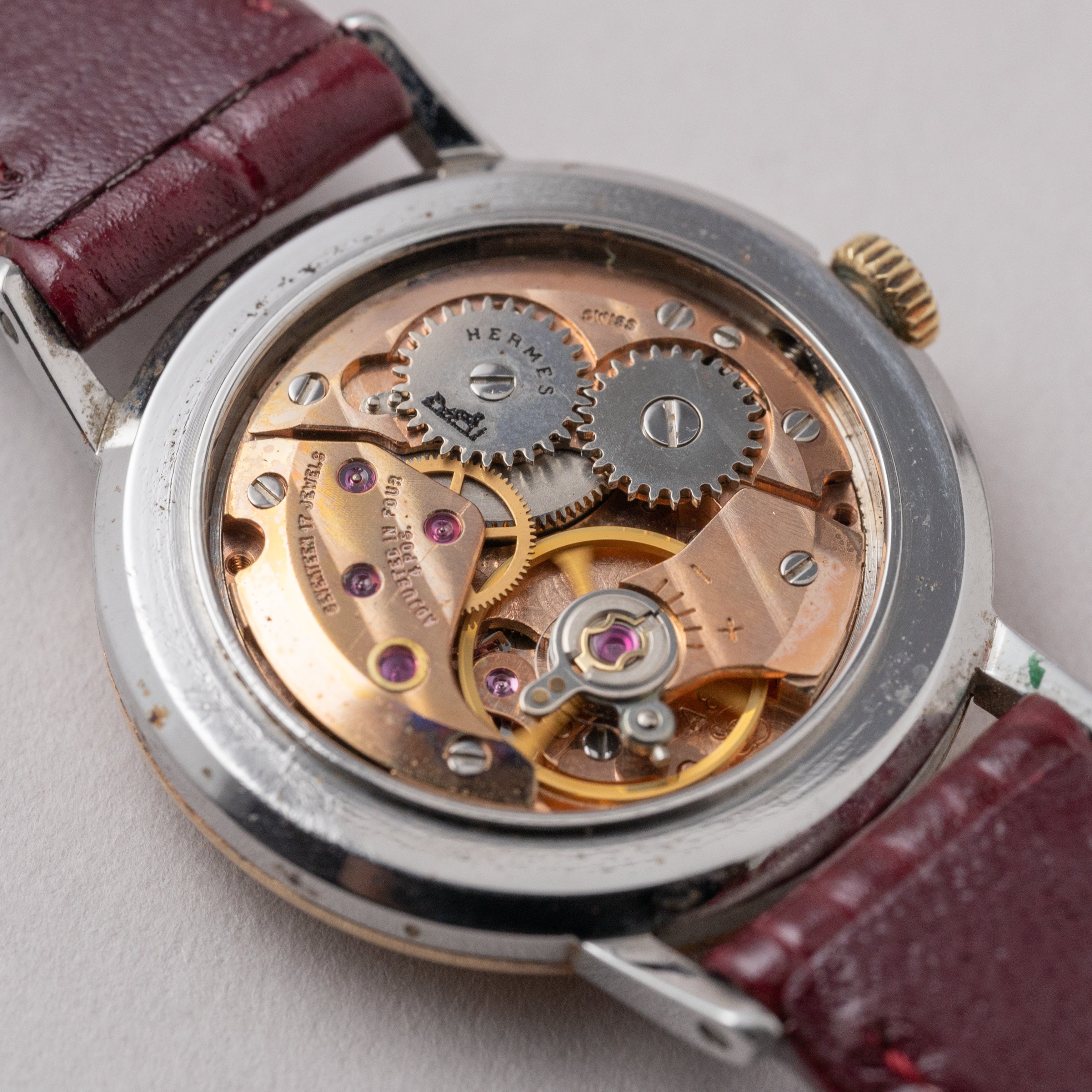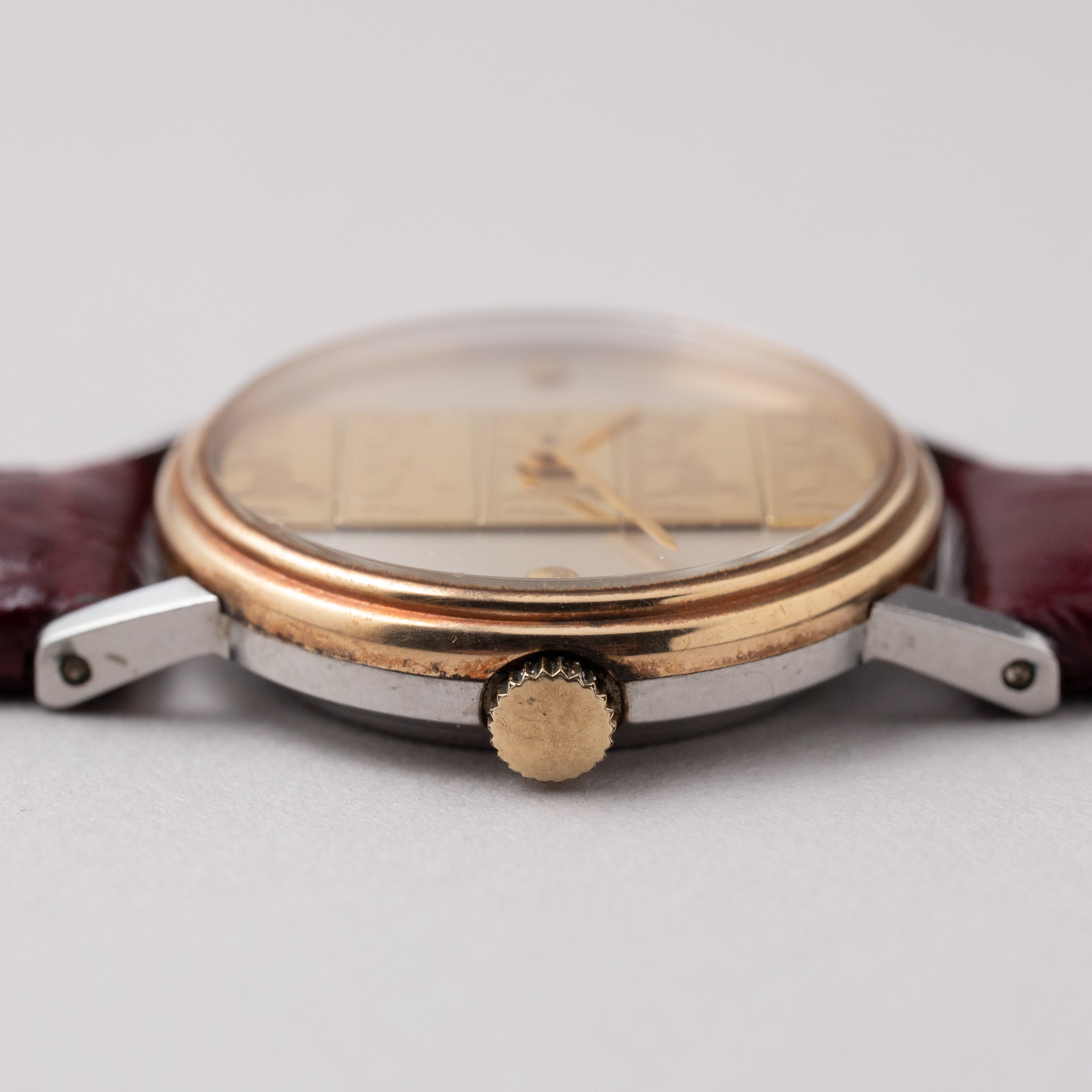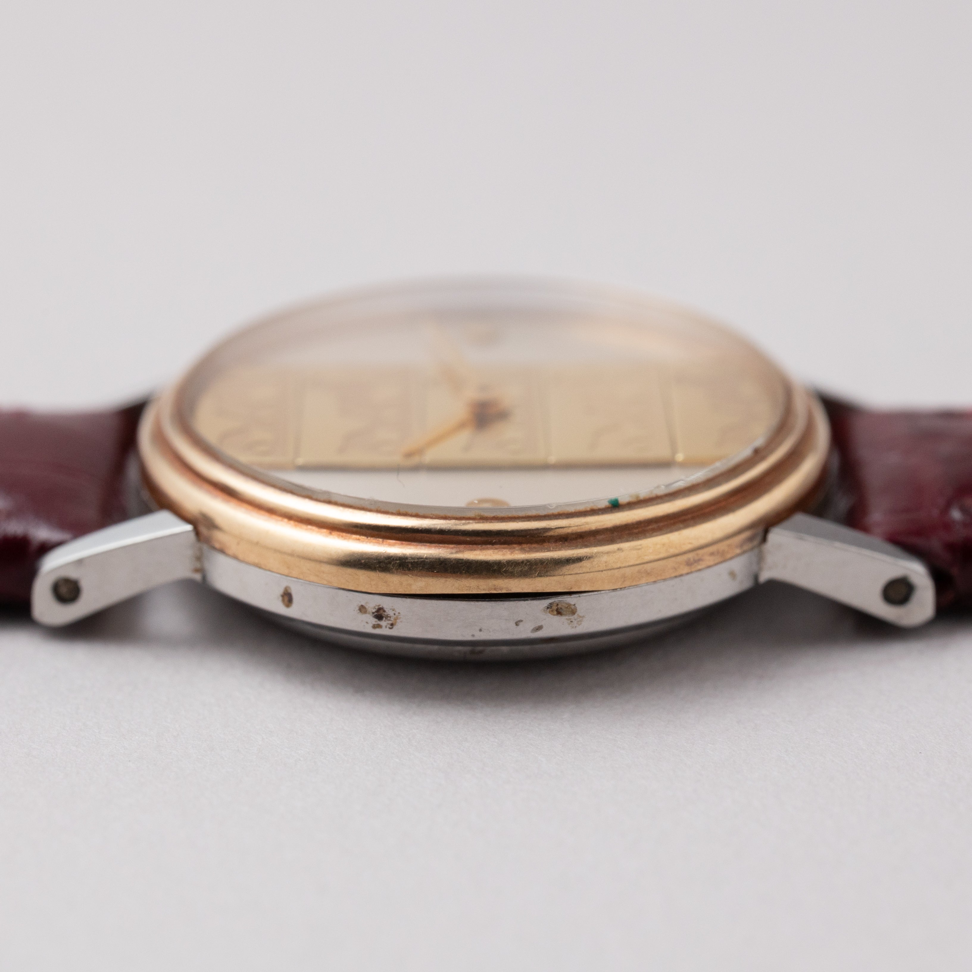 - ヴィンテージ時計の特性上、風防・パッキン・リューズ・バネ棒などの消耗部品は後年メンテナンス過程で交換されている場合がございます。オリジナル性を重視しておりますが、必要に応じて適切な部品にて調整されていますので、よりコレクション性重視のお求めのお客様は事前にご確認ください。