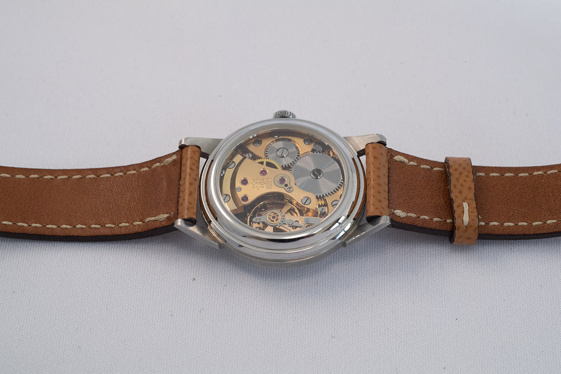 - ヴィンテージ時計の特性上、風防・パッキン・リューズ・バネ棒などの消耗部品は後年メンテナンス過程で交換されている場合がございます。オリジナル性を重視しておりますが、必要に応じて適切な部品にて調整されていますので、よりコレクション性重視のお求めのお客様は事前にご確認ください。
