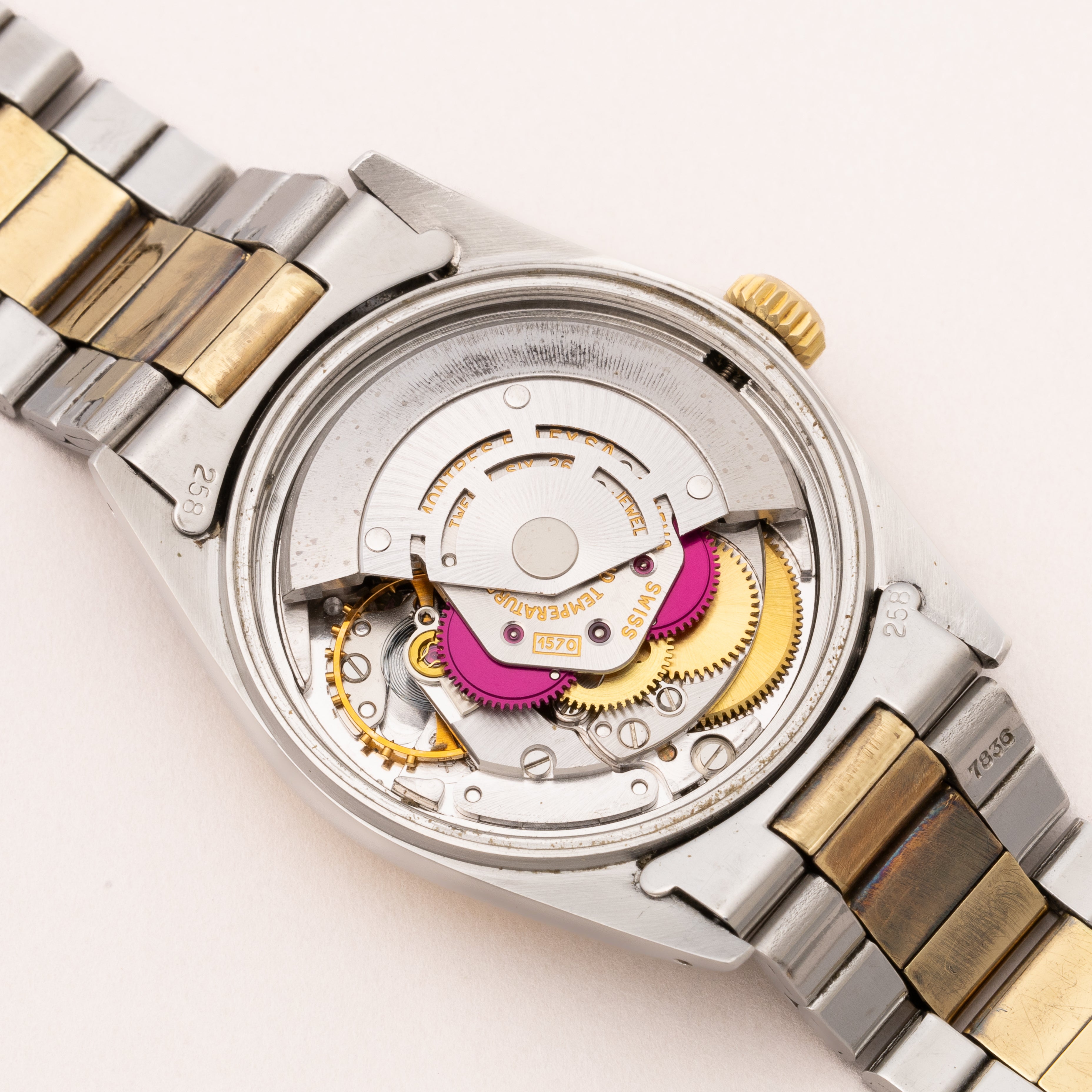 - ヴィンテージ時計の特性上、風防・パッキン・リューズ・バネ棒などの消耗部品は後年メンテナンス過程で交換されている場合がございます。オリジナル性を重視しておりますが、必要に応じて適切な部品にて調整されていますので、よりコレクション性重視のお求めのお客様は事前にご確認ください。