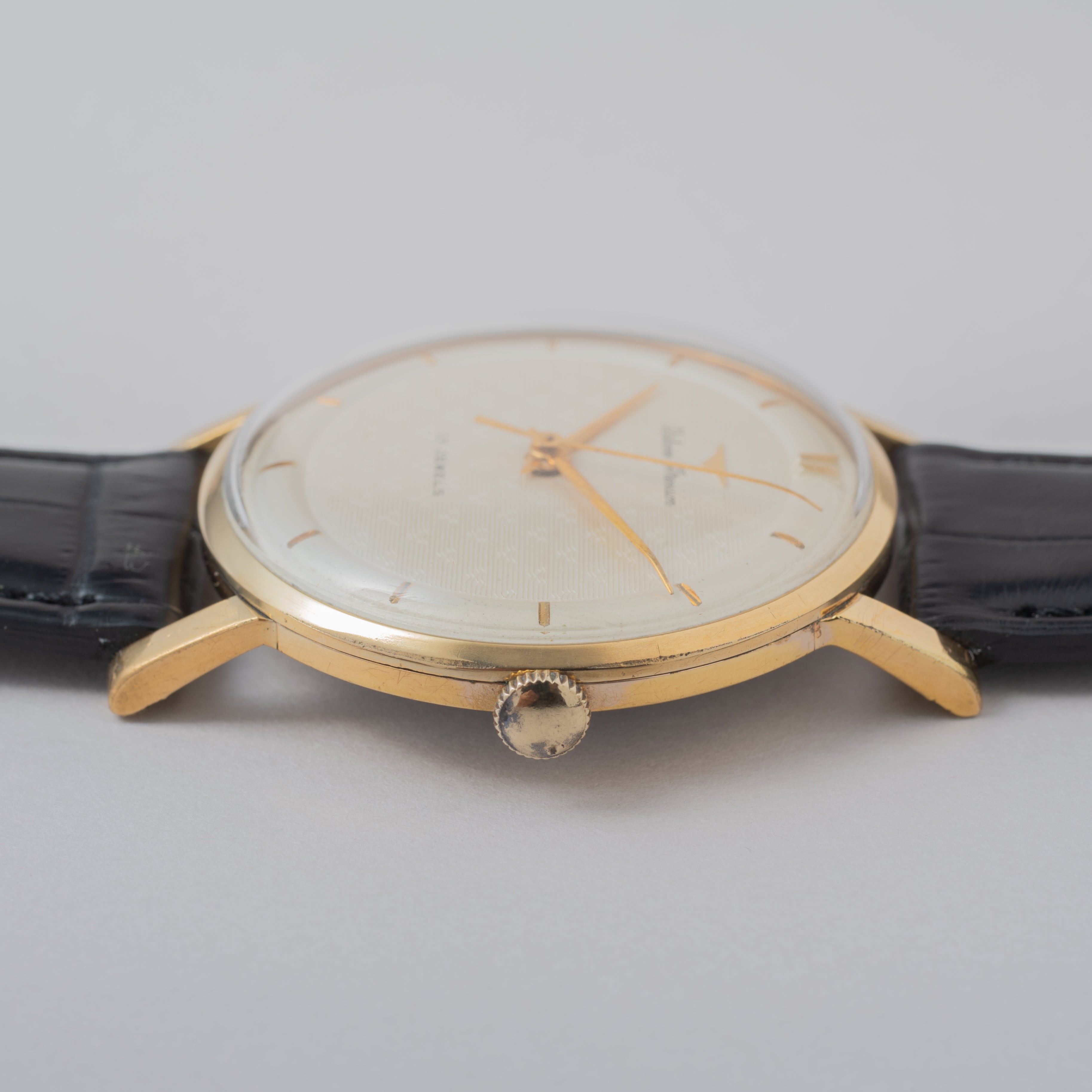 - ヴィンテージ時計の特性上、風防・パッキン・リューズ・バネ棒などの消耗部品は後年メンテナンス過程で交換されている場合がございます。オリジナル性を重視しておりますが、必要に応じて適切な部品にて調整されていますので、よりコレクション性重視のお求めのお客様は事前にご確認ください。