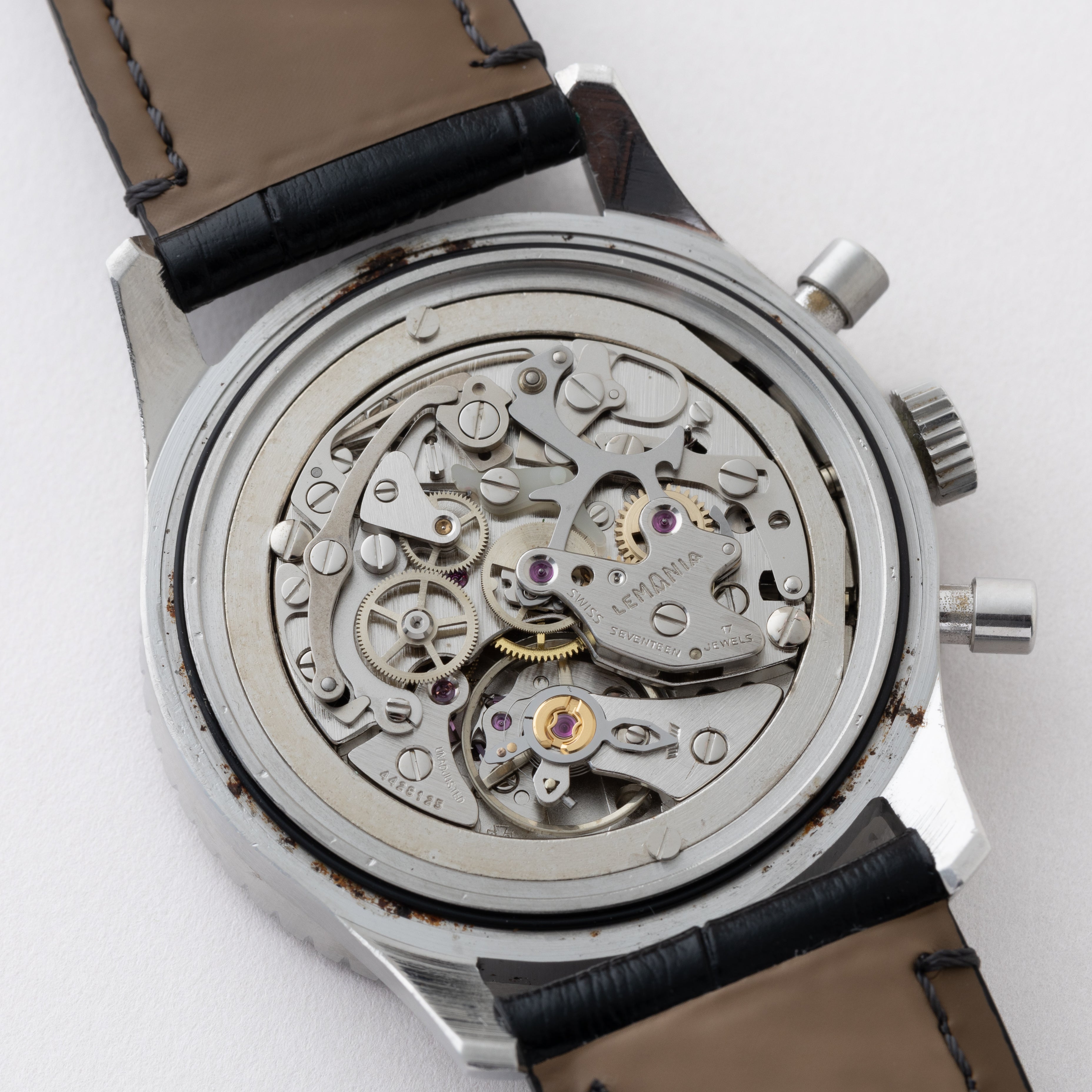 - ヴィンテージ時計の特性上、風防・パッキン・リューズ・バネ棒などの消耗部品は後年メンテナンス過程で交換されている場合がございます。オリジナル性を重視しておりますが、必要に応じて適切な部品にて調整されていますので、よりコレクション性重視のお求めのお客様は事前にご確認ください。