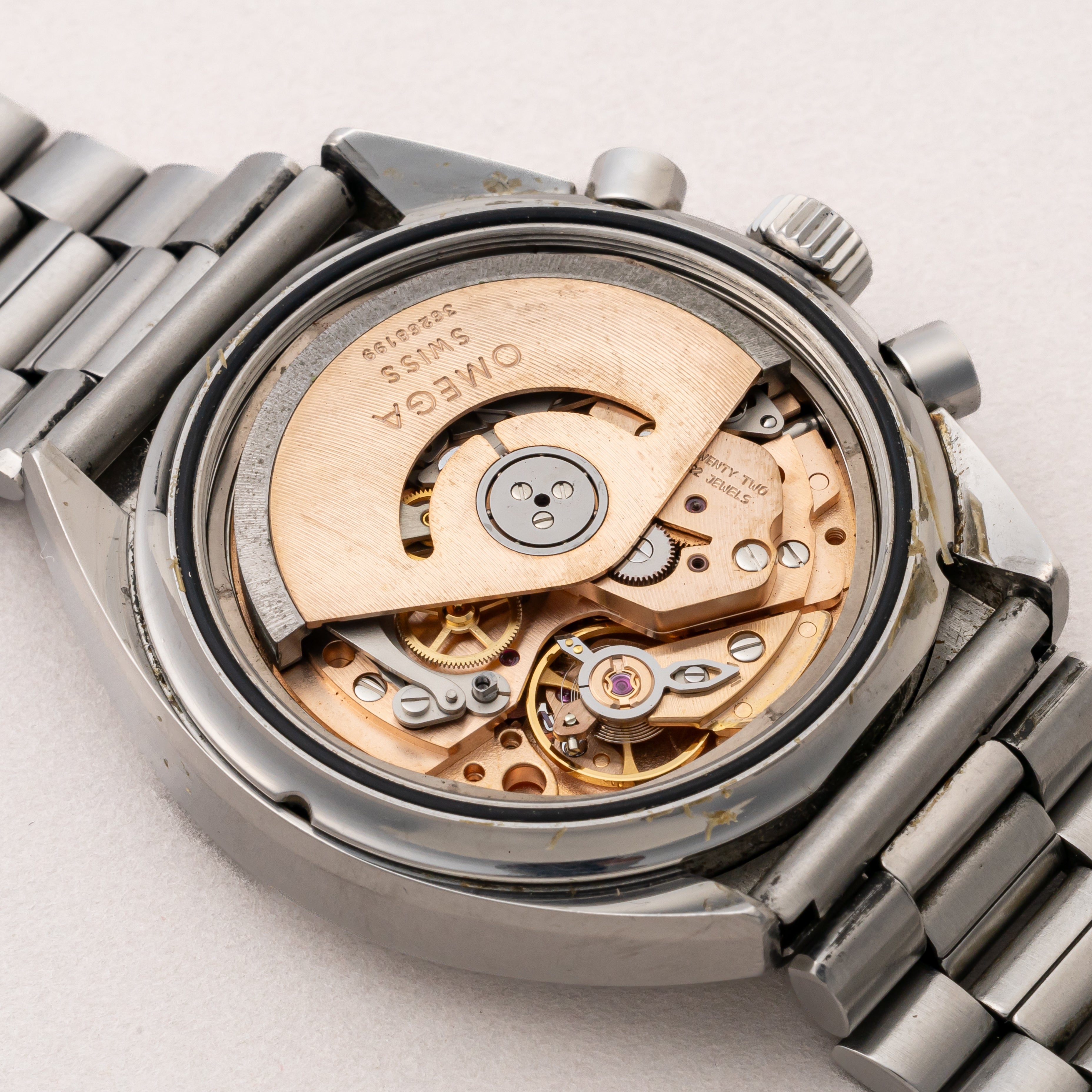 - ヴィンテージ時計の特性上、風防・パッキン・リューズ・バネ棒などの消耗部品は後年メンテナンス過程で交換されている場合がございます。オリジナル性を重視しておりますが、必要に応じて適切な部品にて調整されていますので、よりコレクション性重視のお求めのお客様は事前にご確認ください。