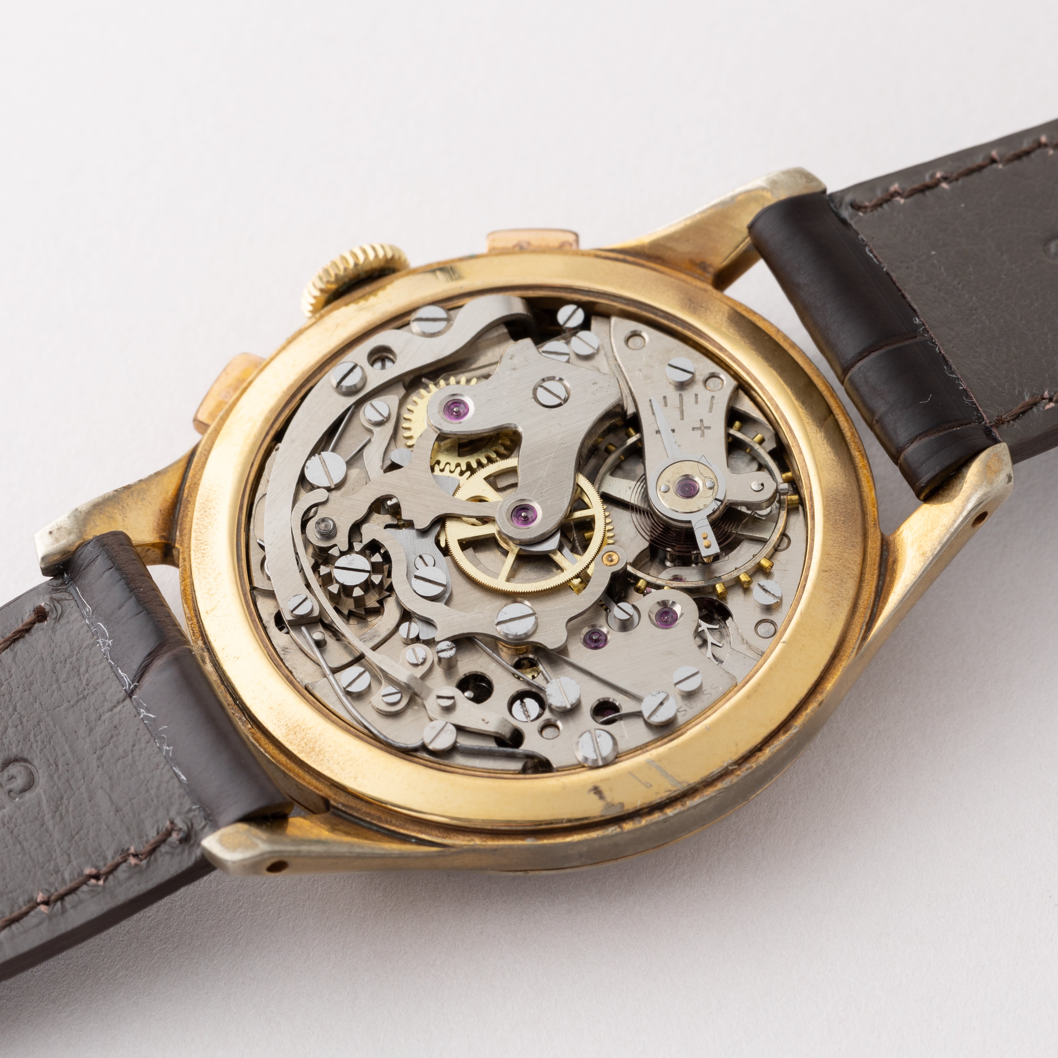 - ヴィンテージ時計の特性上、風防・パッキン・リューズ・バネ棒などの消耗部品は後年メンテナンス過程で交換されている場合がございます。オリジナル性を重視しておりますが、必要に応じて適切な部品にて調整されていますので、よりコレクション性重視のお求めのお客様は事前にご確認ください。