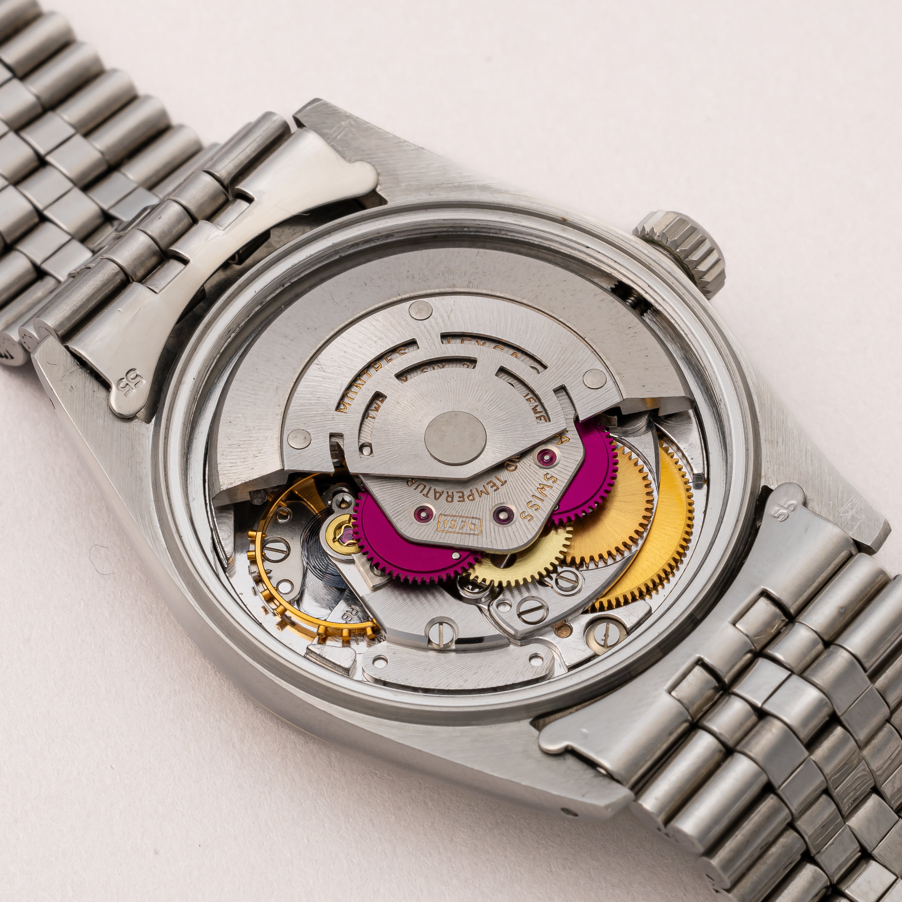 - ヴィンテージ時計の特性上、風防・パッキン・リューズ・バネ棒などの消耗部品は後年メンテナンス過程で交換されている場合がございます。オリジナル性を重視しておりますが、必要に応じて適切な部品にて調整されていますので、よりコレクション性重視のお求めのお客様は事前にご確認ください。