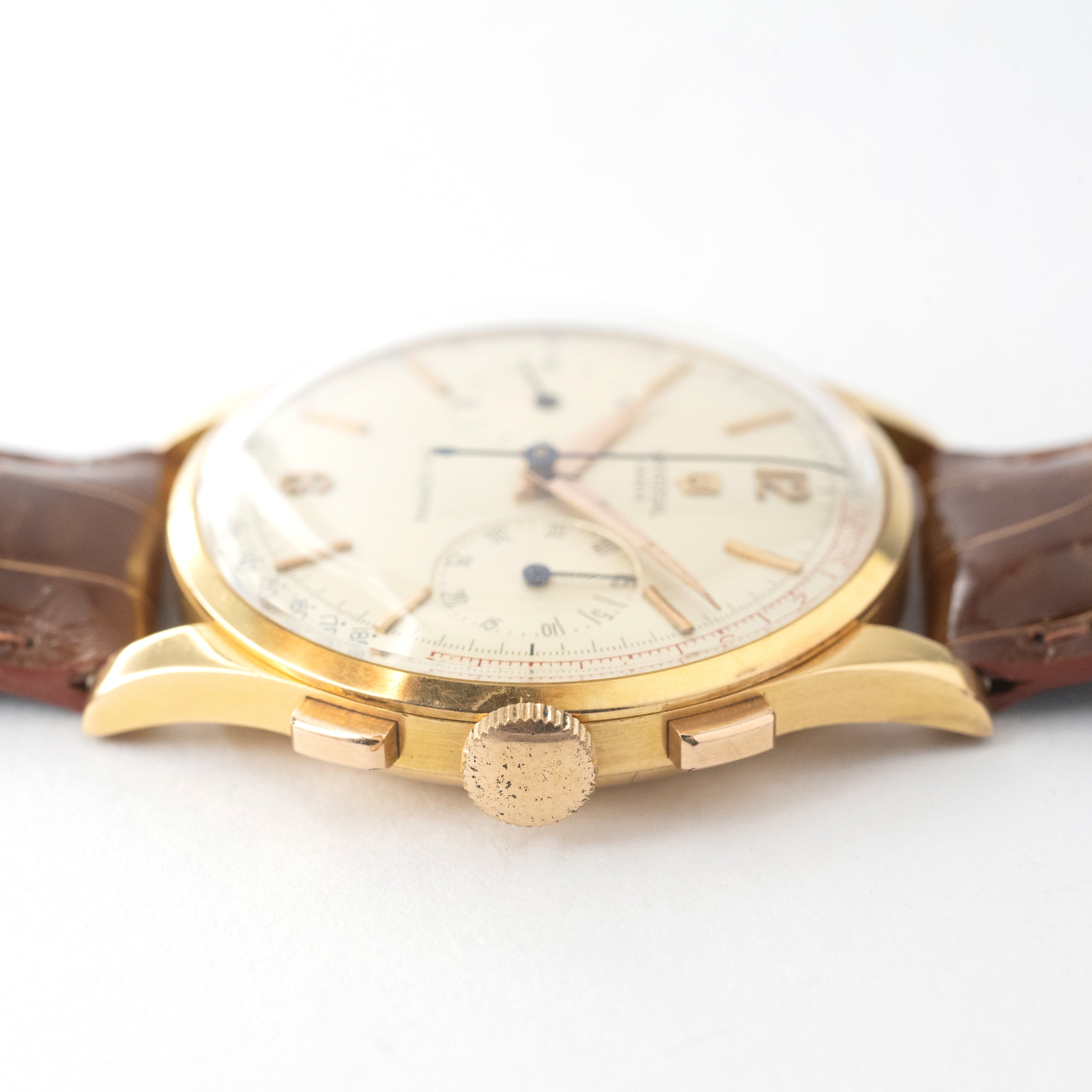 - ヴィンテージ時計の特性上、風防・パッキン・リューズ・バネ棒などの消耗部品は後年メンテナンス過程で交換されている場合がございます。オリジナル性を重視しておりますが、必要に応じて適切な部品にて調整されていますので、よりコレクション性重視のお求めのお客様は事前にご確認ください。