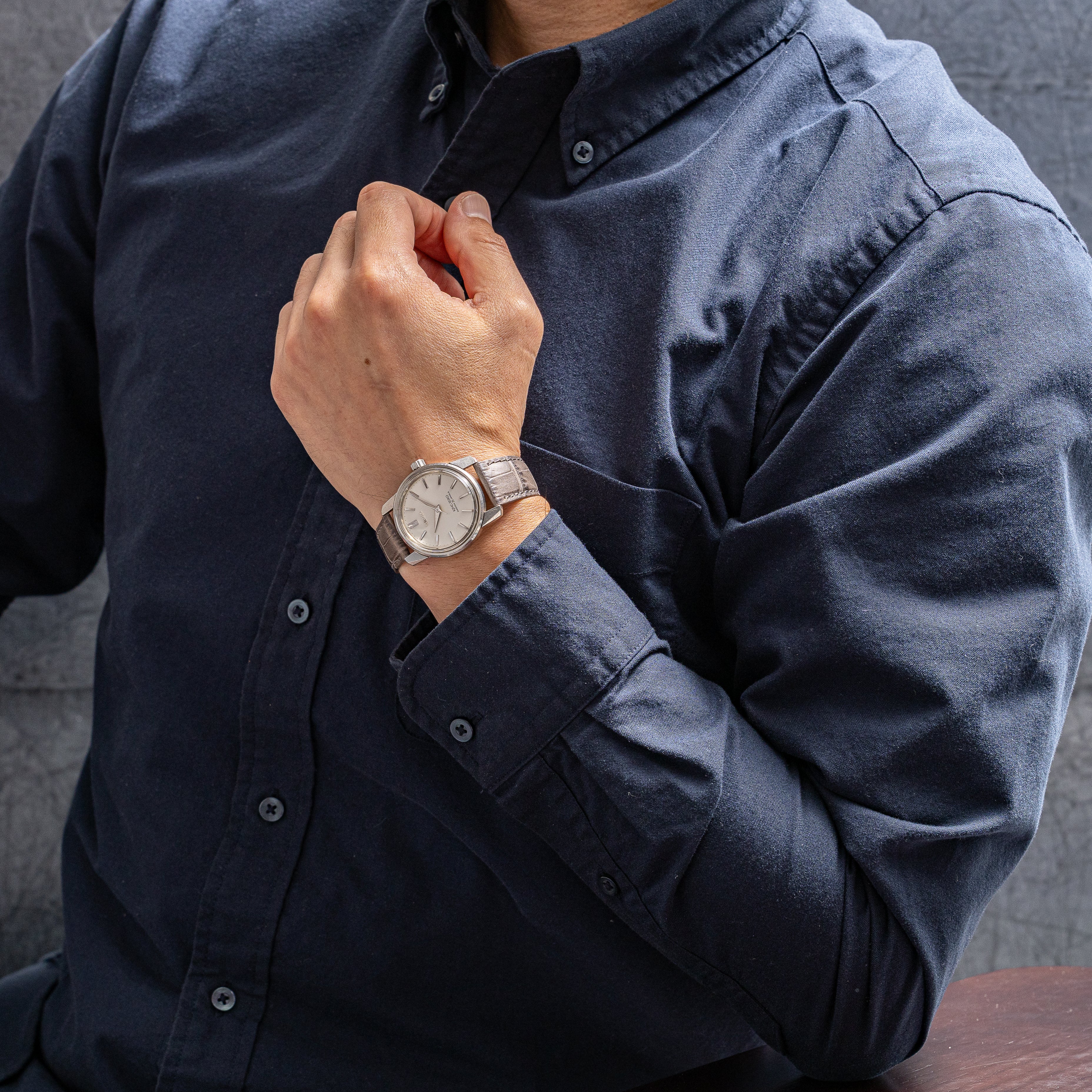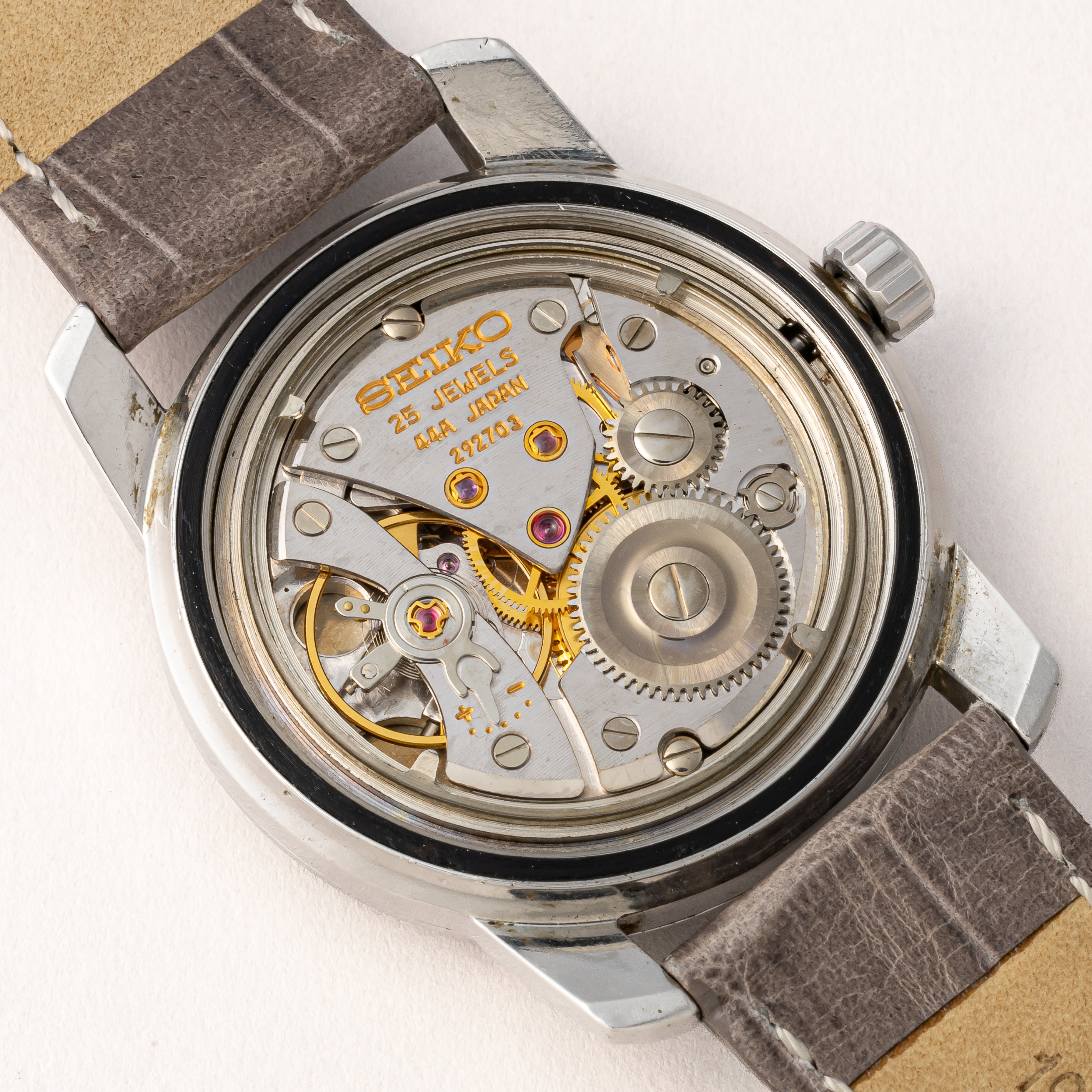- ヴィンテージ時計の特性上、風防・パッキン・リューズ・バネ棒などの消耗部品は後年メンテナンス過程で交換されている場合がございます。オリジナル性を重視しておりますが、必要に応じて適切な部品にて調整されていますので、よりコレクション性重視のお求めのお客様は事前にご確認ください。