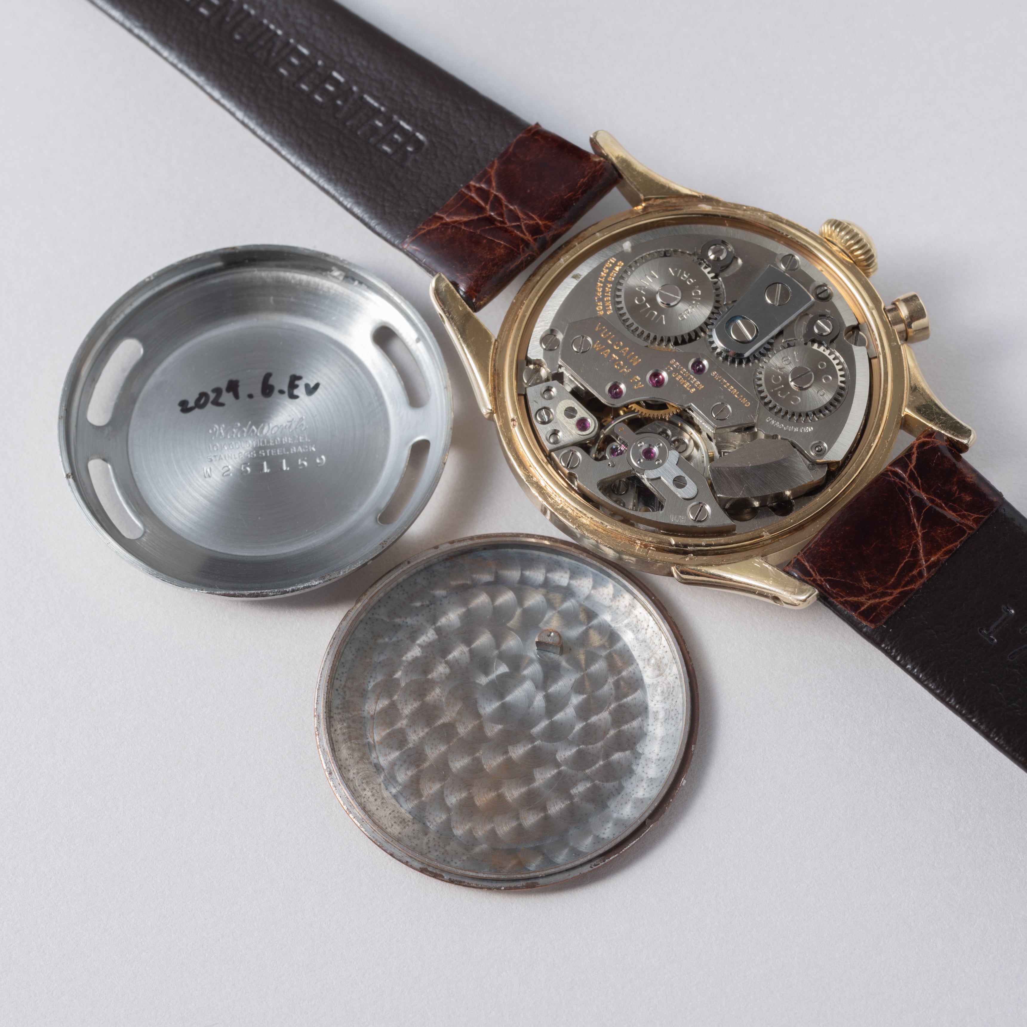 - ヴィンテージ時計の特性上、風防・パッキン・リューズ・バネ棒などの消耗部品は後年メンテナンス過程で交換されている場合がございます。オリジナル性を重視しておりますが、必要に応じて適切な部品にて調整されていますので、よりコレクション性重視のお求めのお客様は事前にご確認ください。