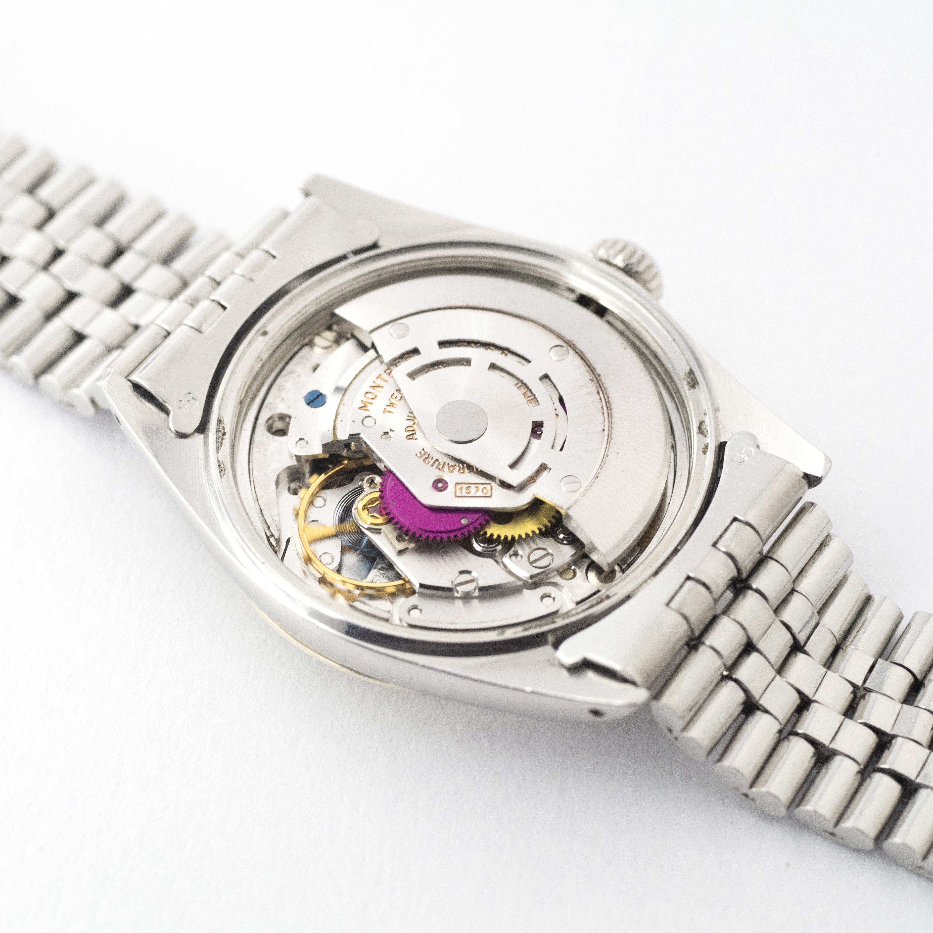 - ヴィンテージ時計の特性上、風防・パッキン・リューズ・バネ棒などの消耗部品は後年メンテナンス過程で交換されている場合がございます。オリジナル性を重視しておりますが、必要に応じて適切な部品にて調整されていますので、よりコレクション性重視のお求めのお客様は事前にご確認ください。