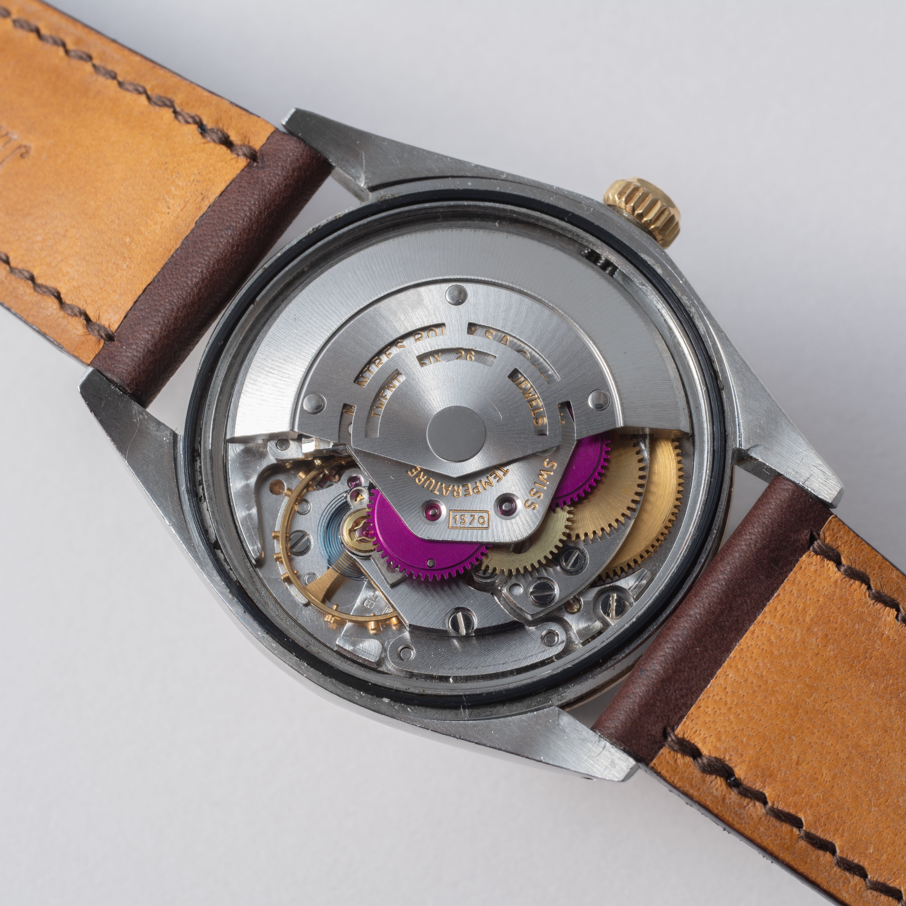 - ヴィンテージ時計の特性上、風防・パッキン・リューズ・バネ棒などの消耗部品は後年メンテナンス過程で交換されている場合がございます。オリジナル性を重視しておりますが、必要に応じて適切な部品にて調整されていますので、よりコレクション性重視のお求めのお客様は事前にご確認ください。