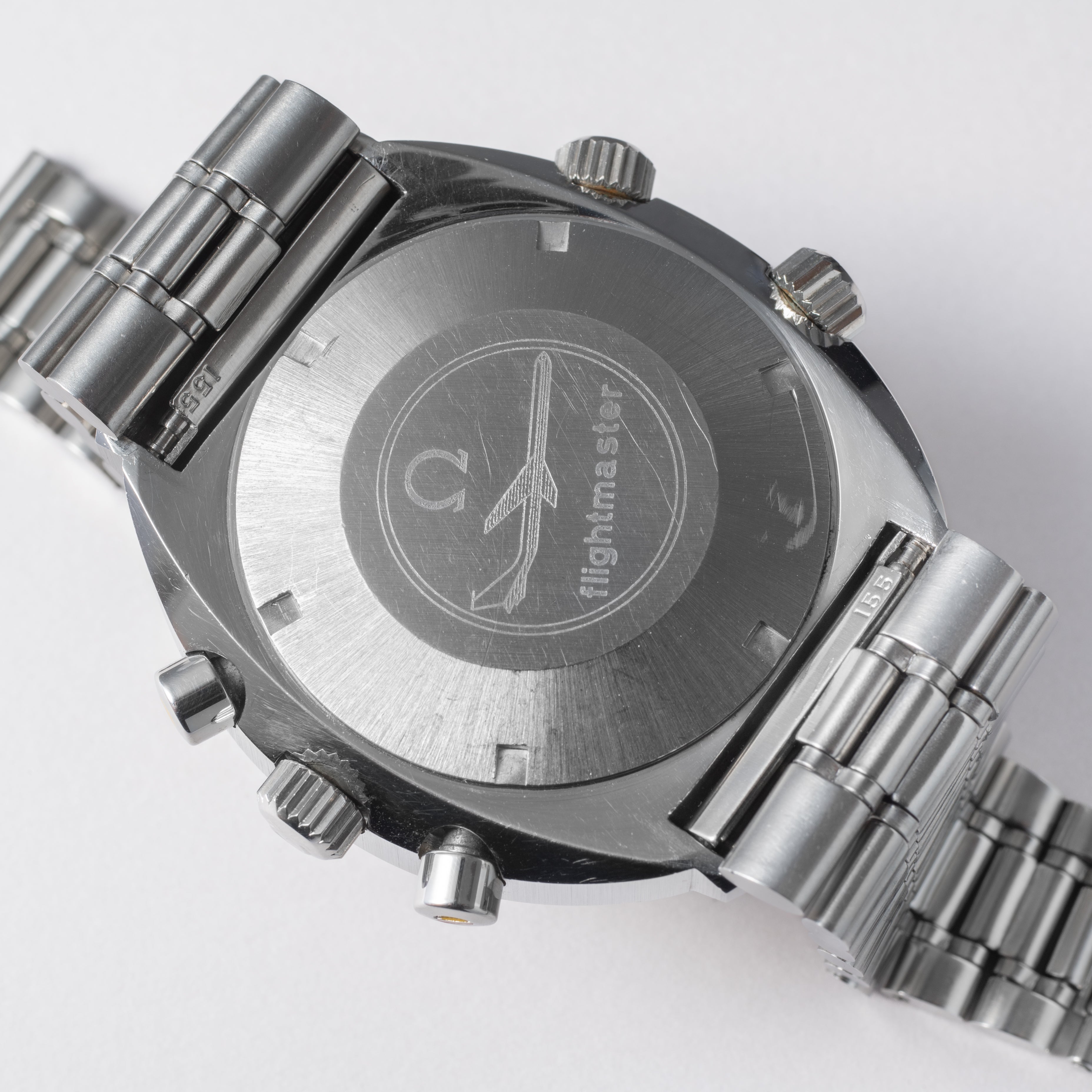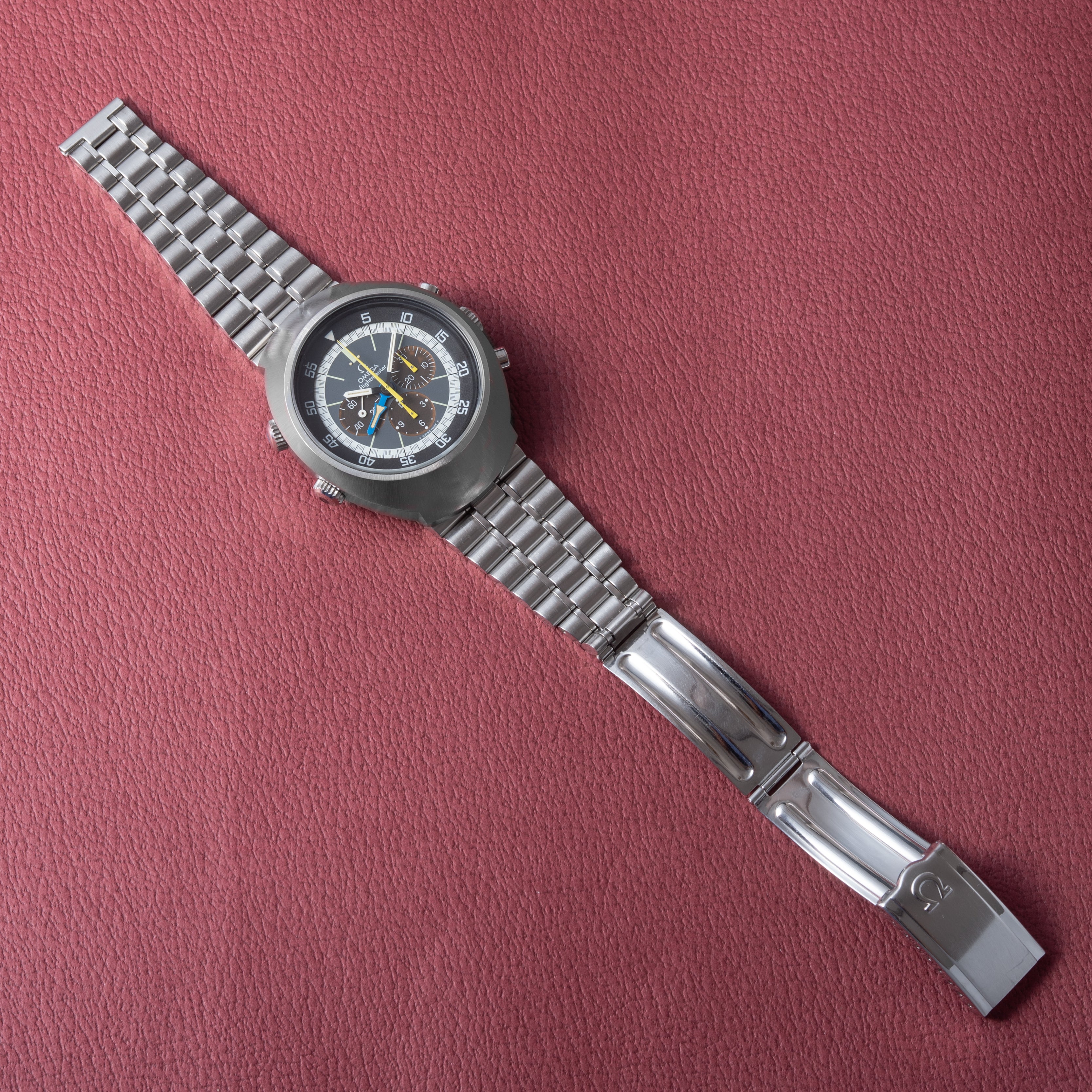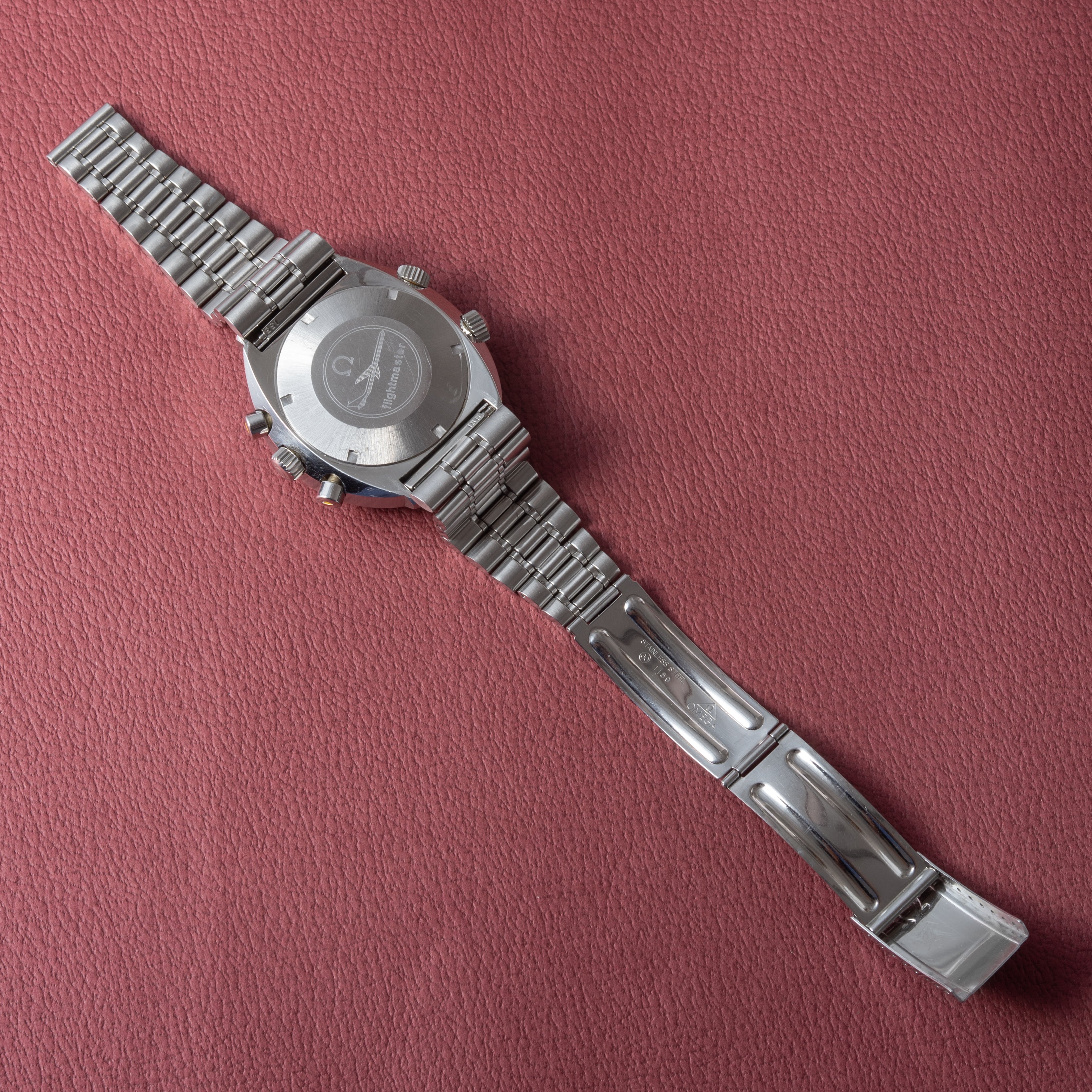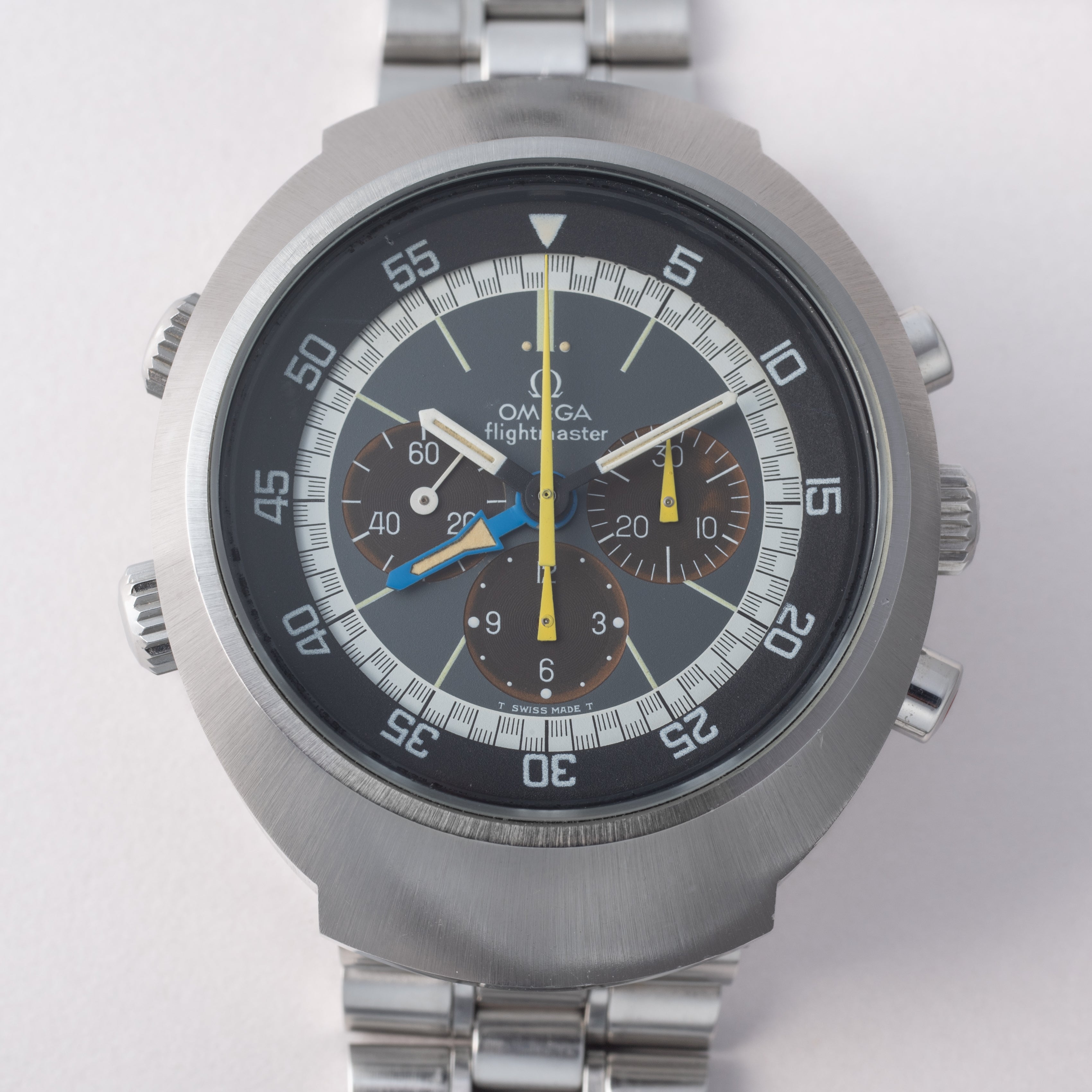1971年製のオメガフライトマスターです。ケースが前期型より分厚くなった後期型です。人気のイエロークロノ針で如何にも1970年代といった雰囲気のパイロットウォッチです。クロノグラフとGMTが合わさった多機能モデルで3時位置に30分積算計、6時位置に12時間計、9時位置に秒針を配置したクロノグラフに、8時半位置のリュウズでインナーベゼルの調整、10時位置のリュウズはGMT針を調整することができます。ムーブメントはスピードマスターのCal.861に付加機能を追加したCal.911を搭載。ケースやブレスは小傷はあるものの申し分なく良いコンディションで、インダイヤルはブラウンに変化しています。このようなコンディションの良さと経年変化を同時に感じることが出来る個体は多くありません。ベルトは純正ステンレスベルト(1159/FF155)が取り付けてあります。手巻きや針回しの操作はスムースです。こちらはOH済みです。