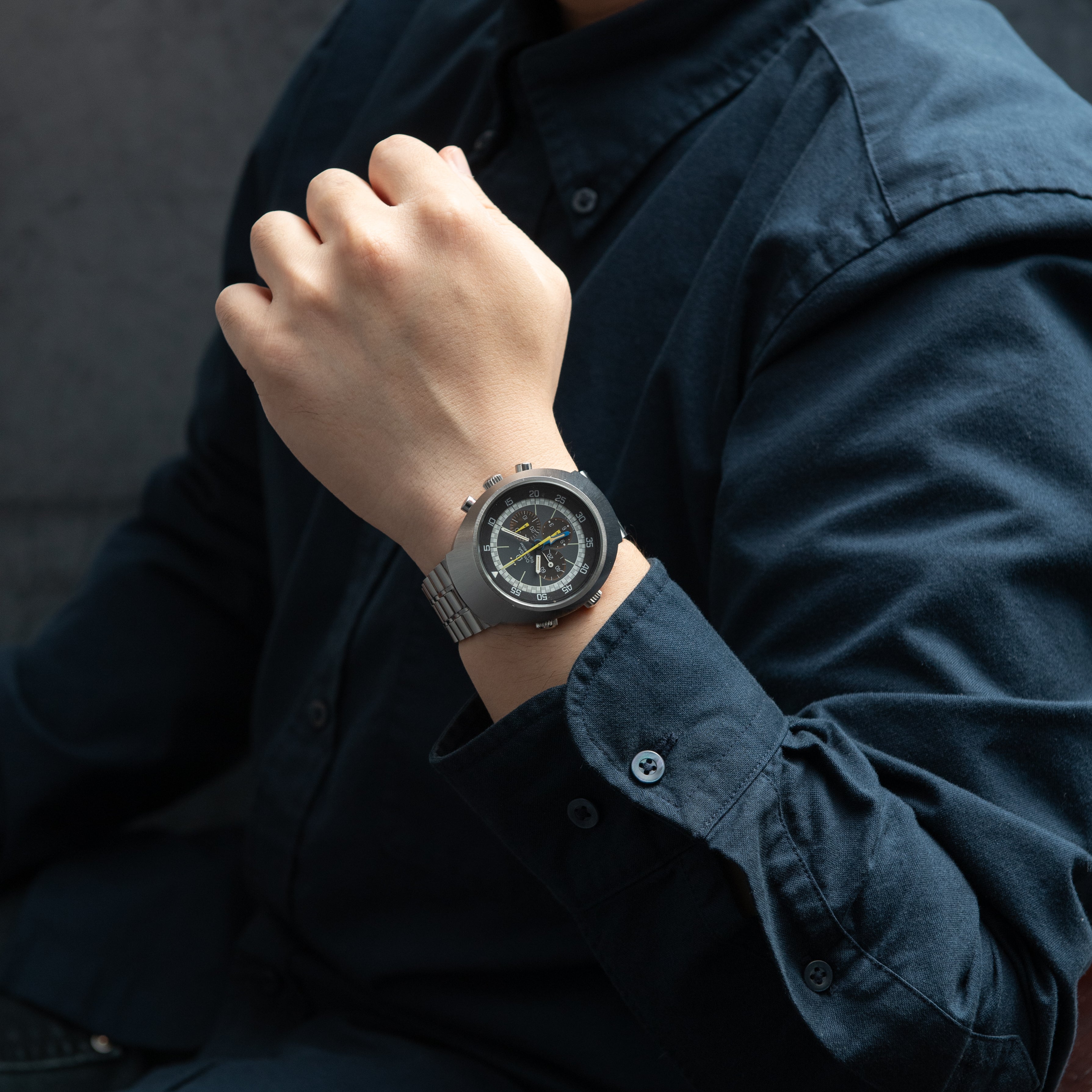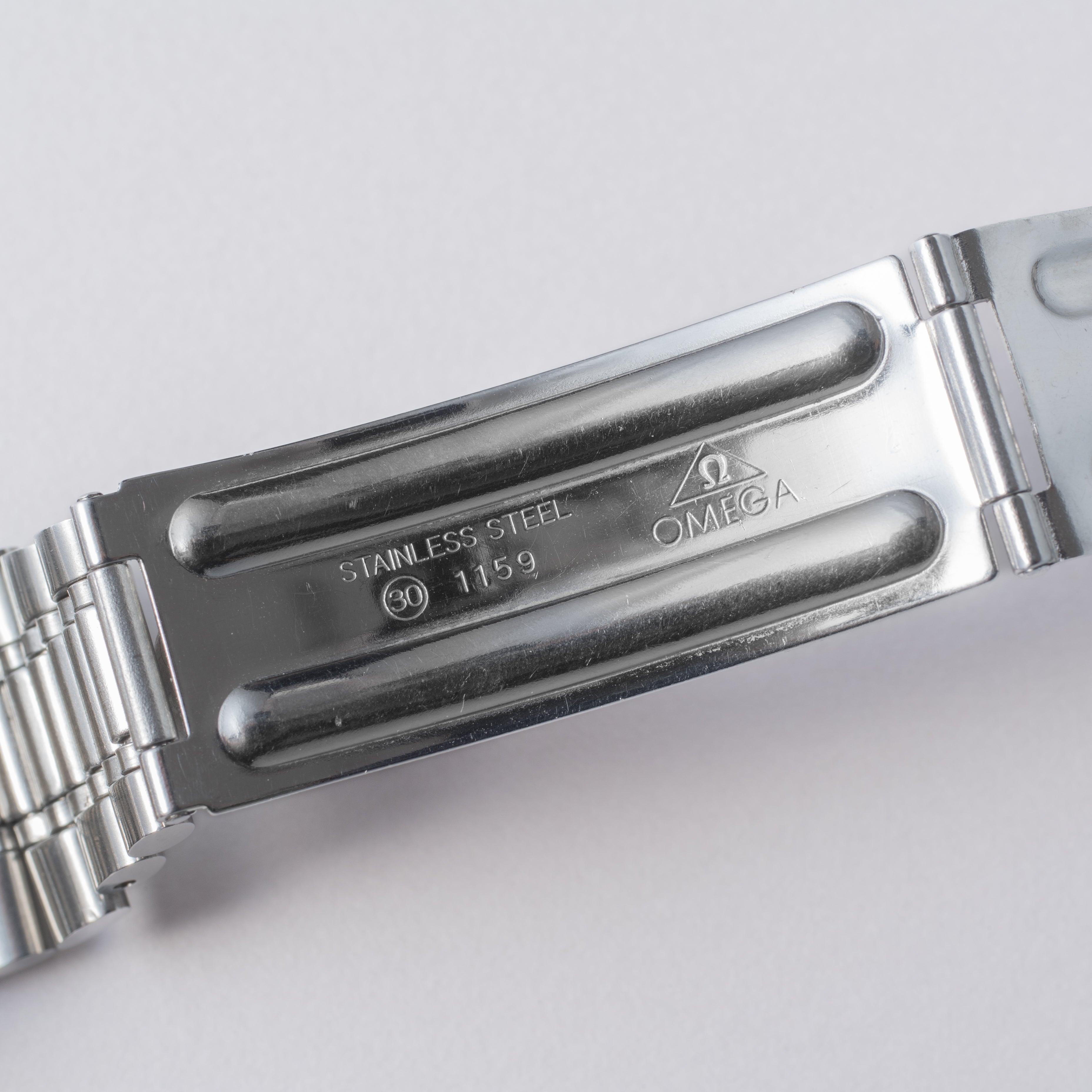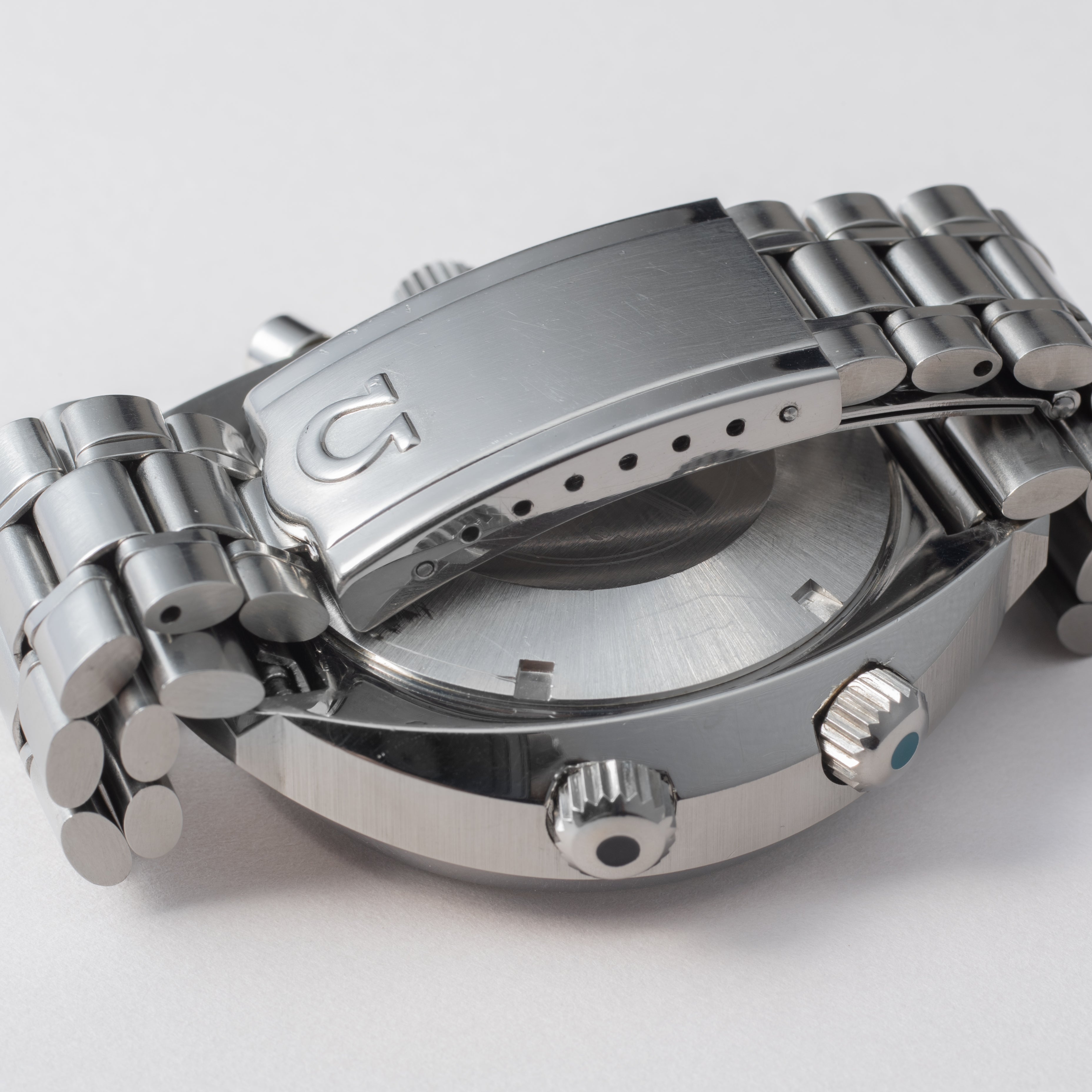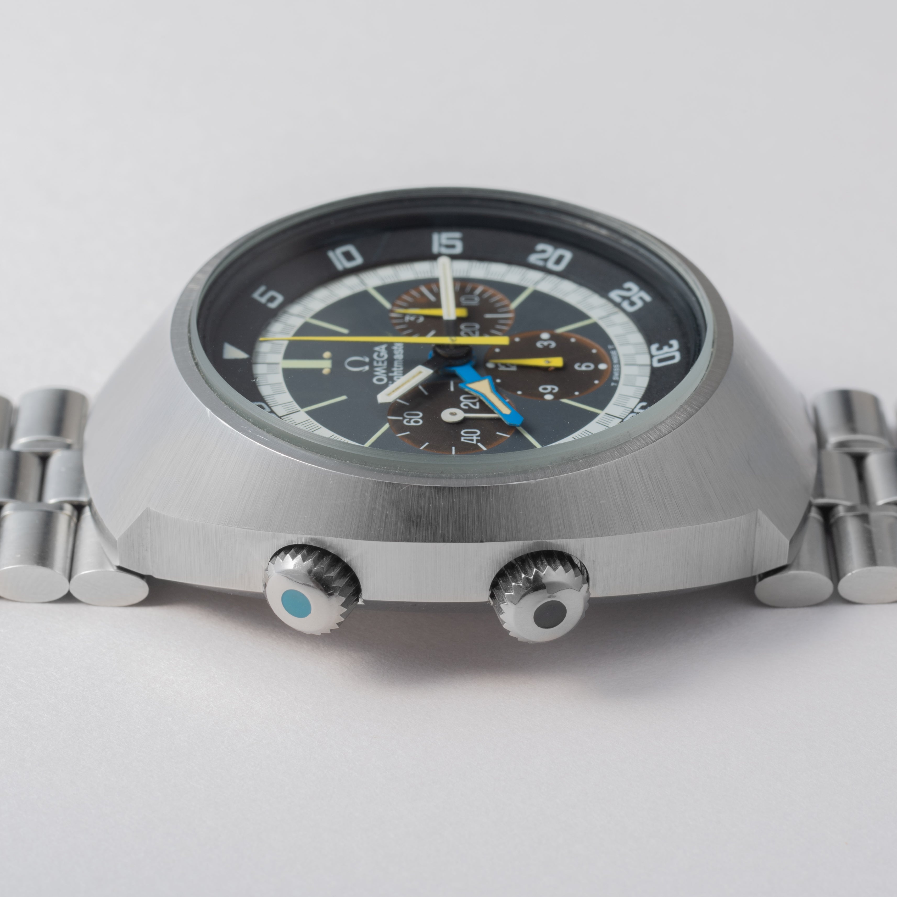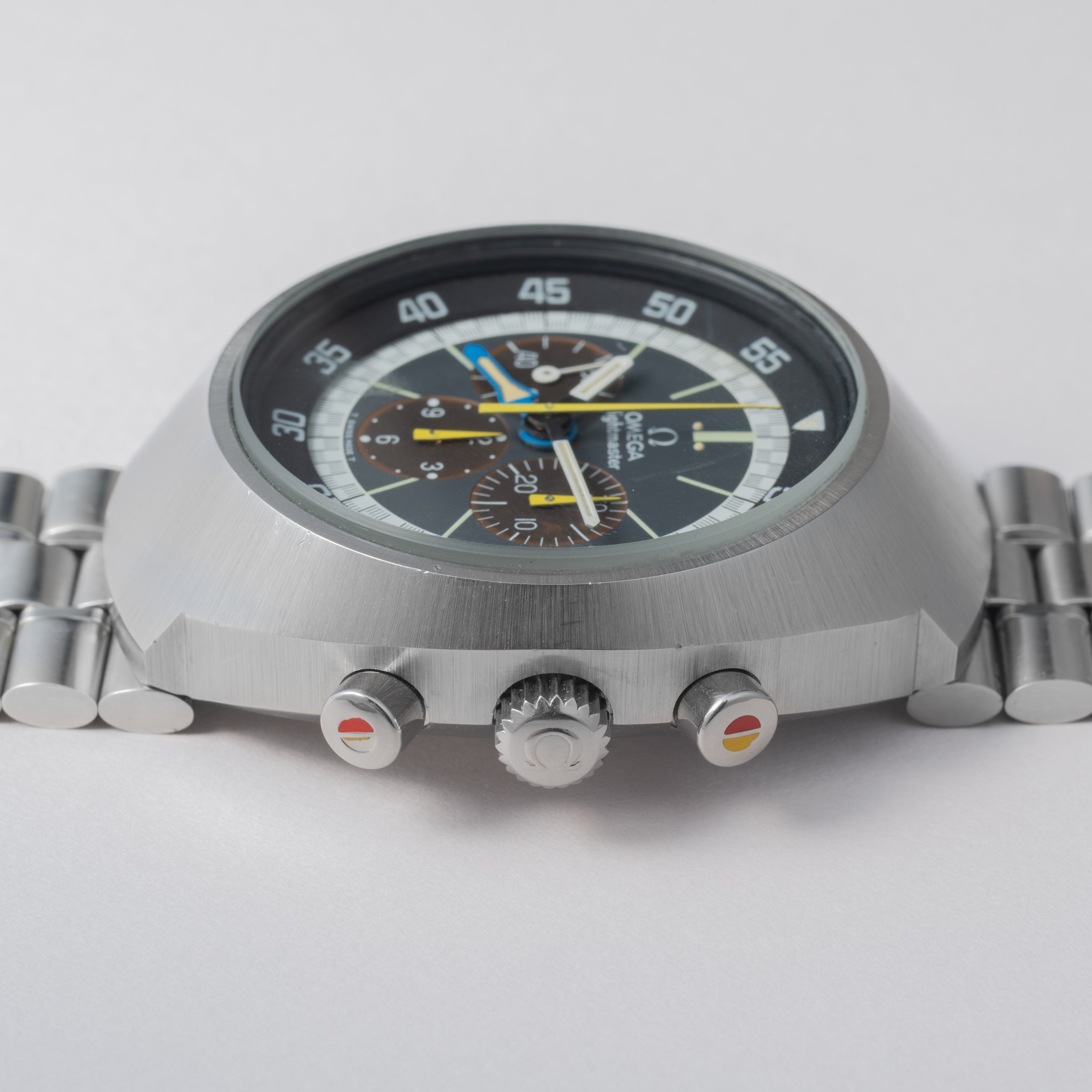 1971年製のオメガフライトマスターです。ケースが前期型より分厚くなった後期型です。人気のイエロークロノ針で如何にも1970年代といった雰囲気のパイロットウォッチです。クロノグラフとGMTが合わさった多機能モデルで3時位置に30分積算計、6時位置に12時間計、9時位置に秒針を配置したクロノグラフに、8時半位置のリュウズでインナーベゼルの調整、10時位置のリュウズはGMT針を調整することができます。ムーブメントはスピードマスターのCal.861に付加機能を追加したCal.911を搭載。ケースやブレスは小傷はあるものの申し分なく良いコンディションで、インダイヤルはブラウンに変化しています。このようなコンディションの良さと経年変化を同時に感じることが出来る個体は多くありません。ベルトは純正ステンレスベルト(1159/FF155)が取り付けてあります。手巻きや針回しの操作はスムースです。こちらはOH済みです。