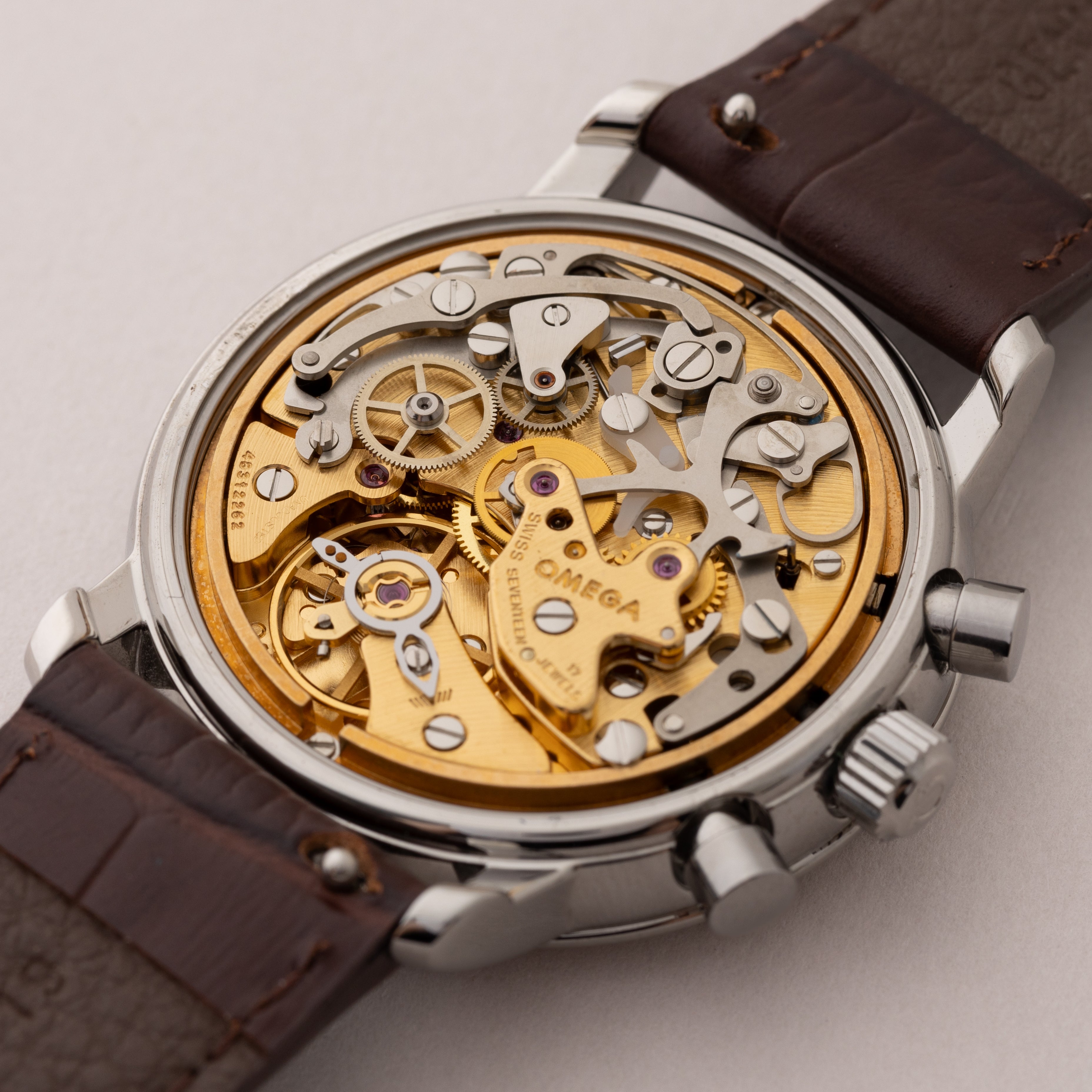 - ヴィンテージ時計の特性上、風防・パッキン・リューズ・バネ棒などの消耗部品は後年メンテナンス過程で交換されている場合がございます。オリジナル性を重視しておりますが、必要に応じて適切な部品にて調整されていますので、よりコレクション性重視のお求めのお客様は事前にご確認ください。
