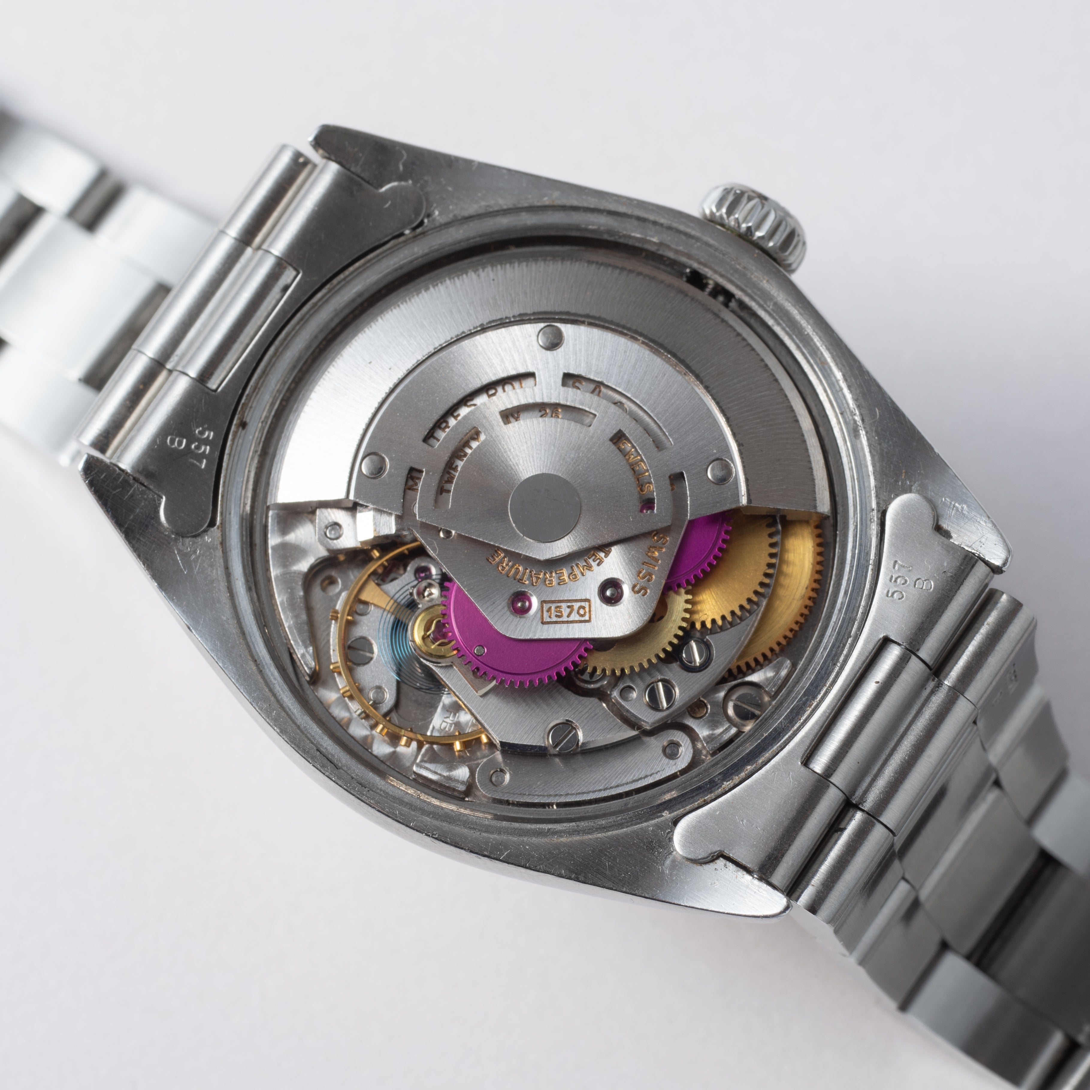 - ヴィンテージ時計の特性上、風防・パッキン・リューズ・バネ棒などの消耗部品は後年メンテナンス過程で交換されている場合がございます。オリジナル性を重視しておりますが、必要に応じて適切な部品にて調整されていますので、よりコレクション性重視のお求めのお客様は事前にご確認ください。