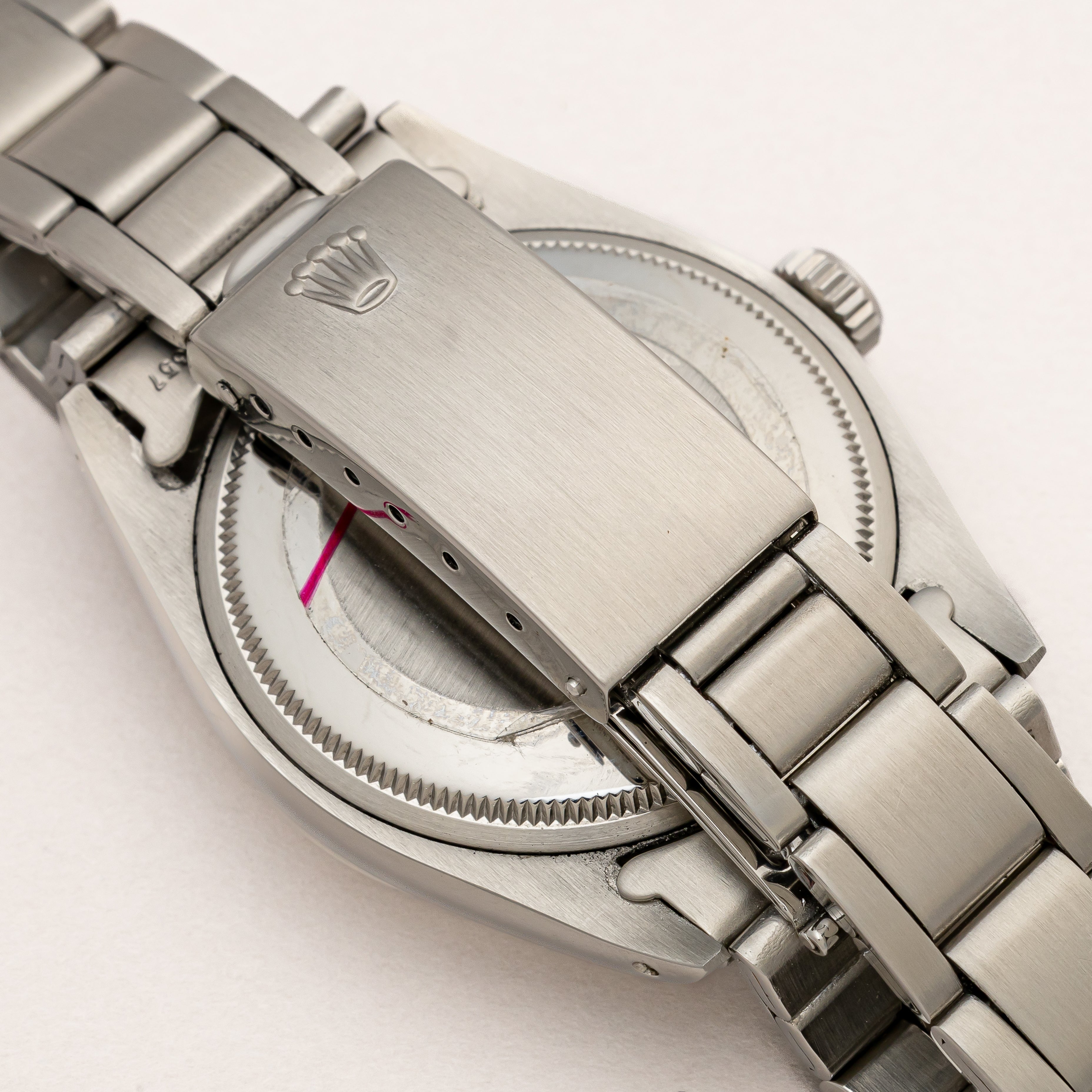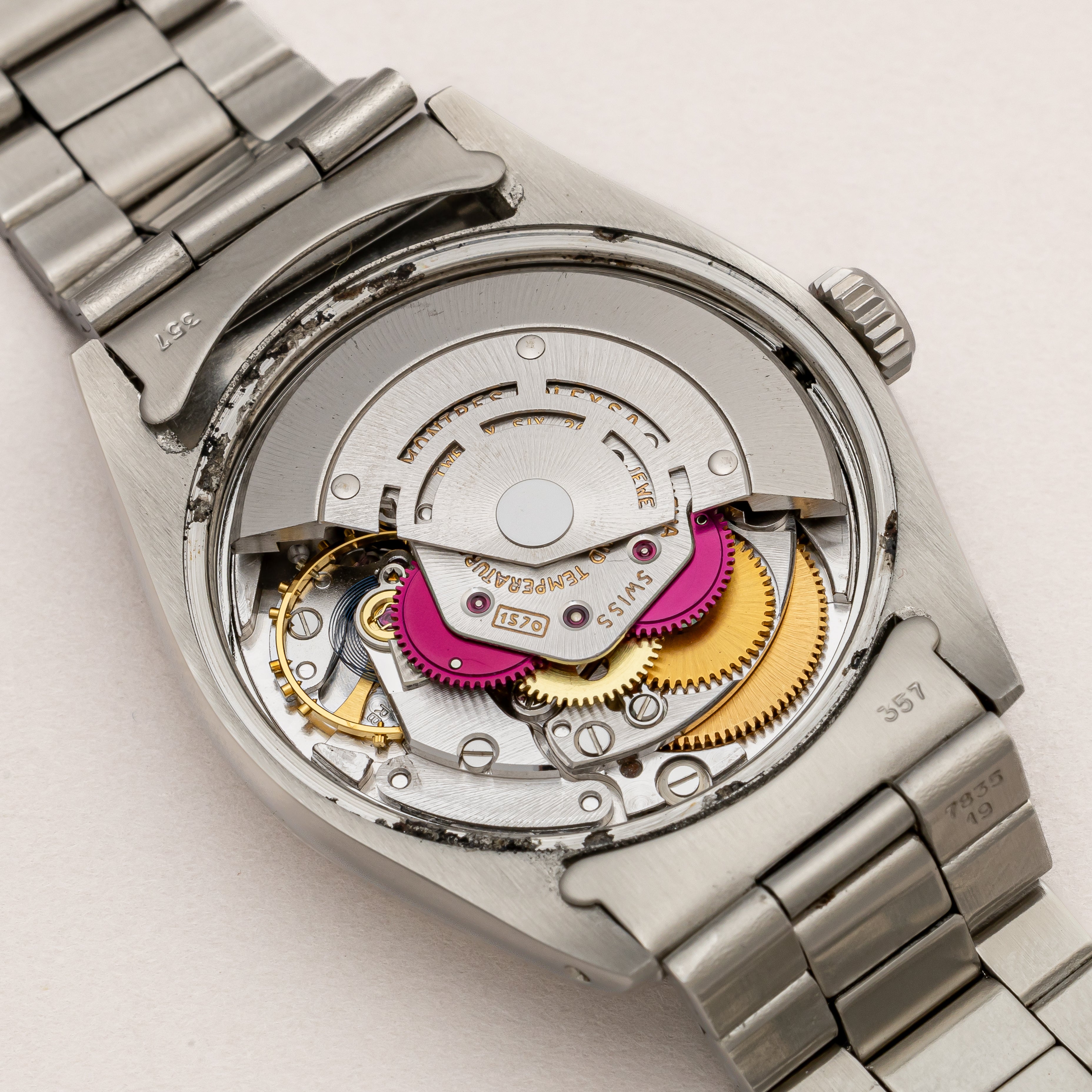 - ヴィンテージ時計の特性上、風防・パッキン・リューズ・バネ棒などの消耗部品は後年メンテナンス過程で交換されている場合がございます。オリジナル性を重視しておりますが、必要に応じて適切な部品にて調整されていますので、よりコレクション性重視のお求めのお客様は事前にご確認ください。