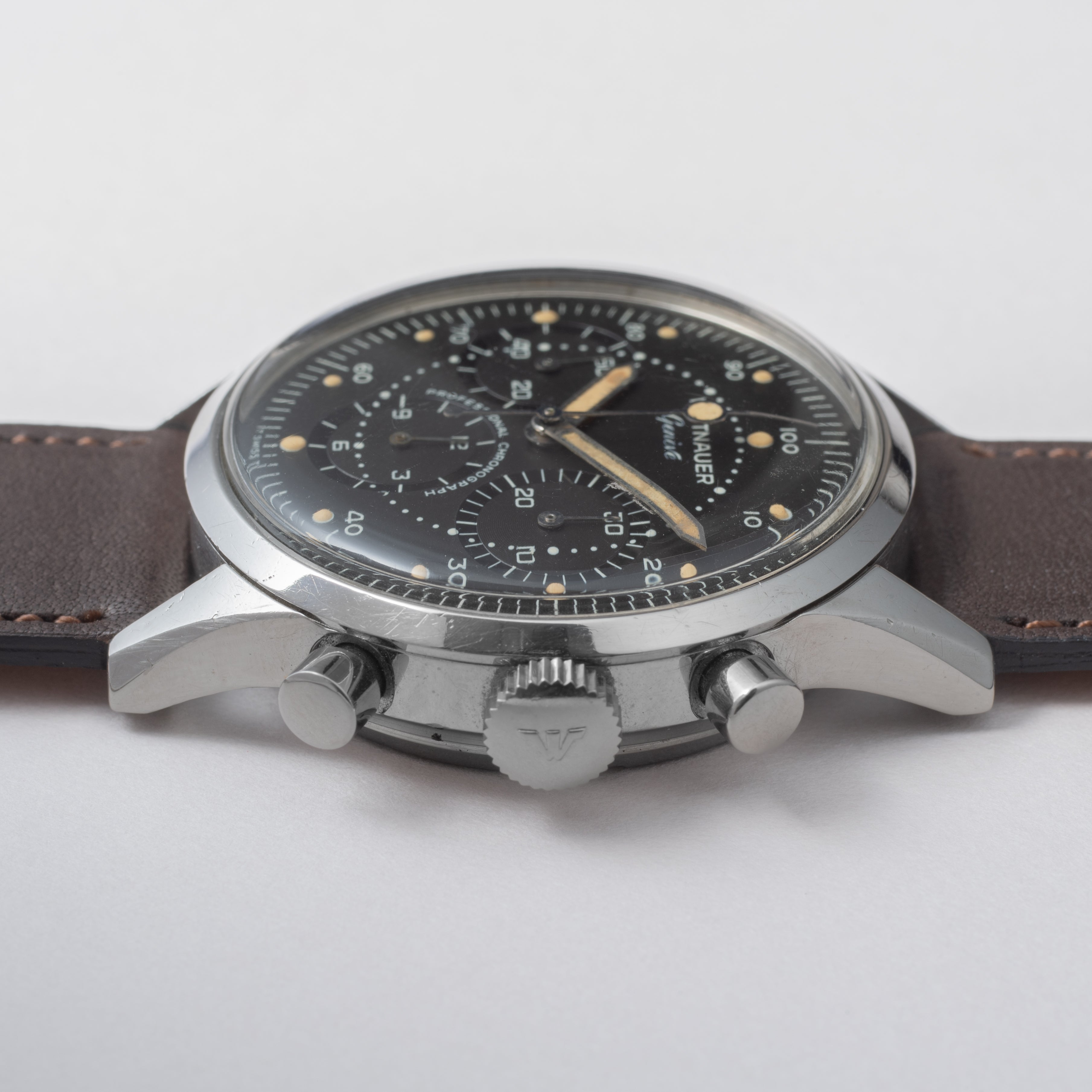 - ヴィンテージ時計の特性上、風防・パッキン・リューズ・バネ棒などの消耗部品は後年メンテナンス過程で交換されている場合がございます。オリジナル性を重視しておりますが、必要に応じて適切な部品にて調整されていますので、よりコレクション性重視のお求めのお客様は事前にご確認ください。