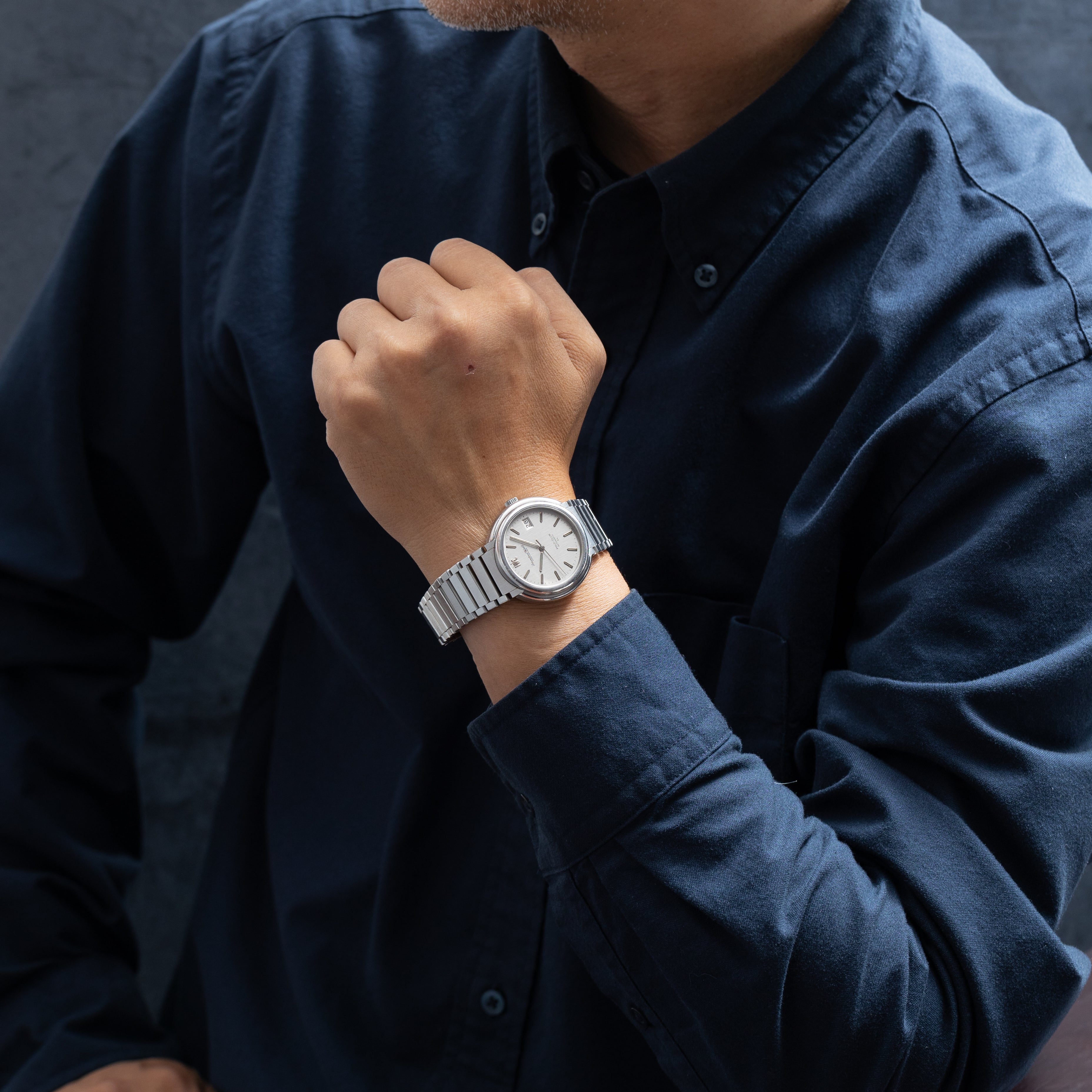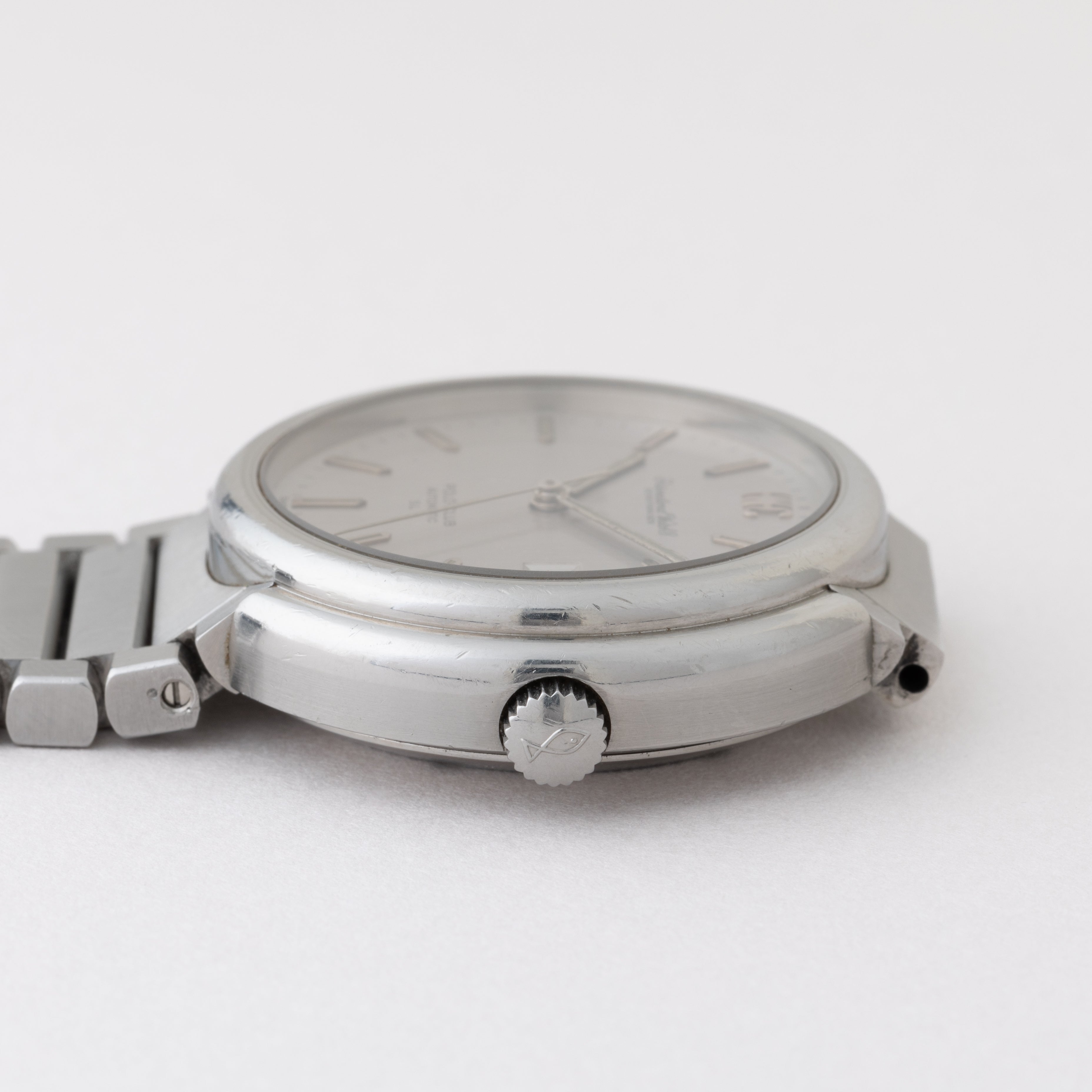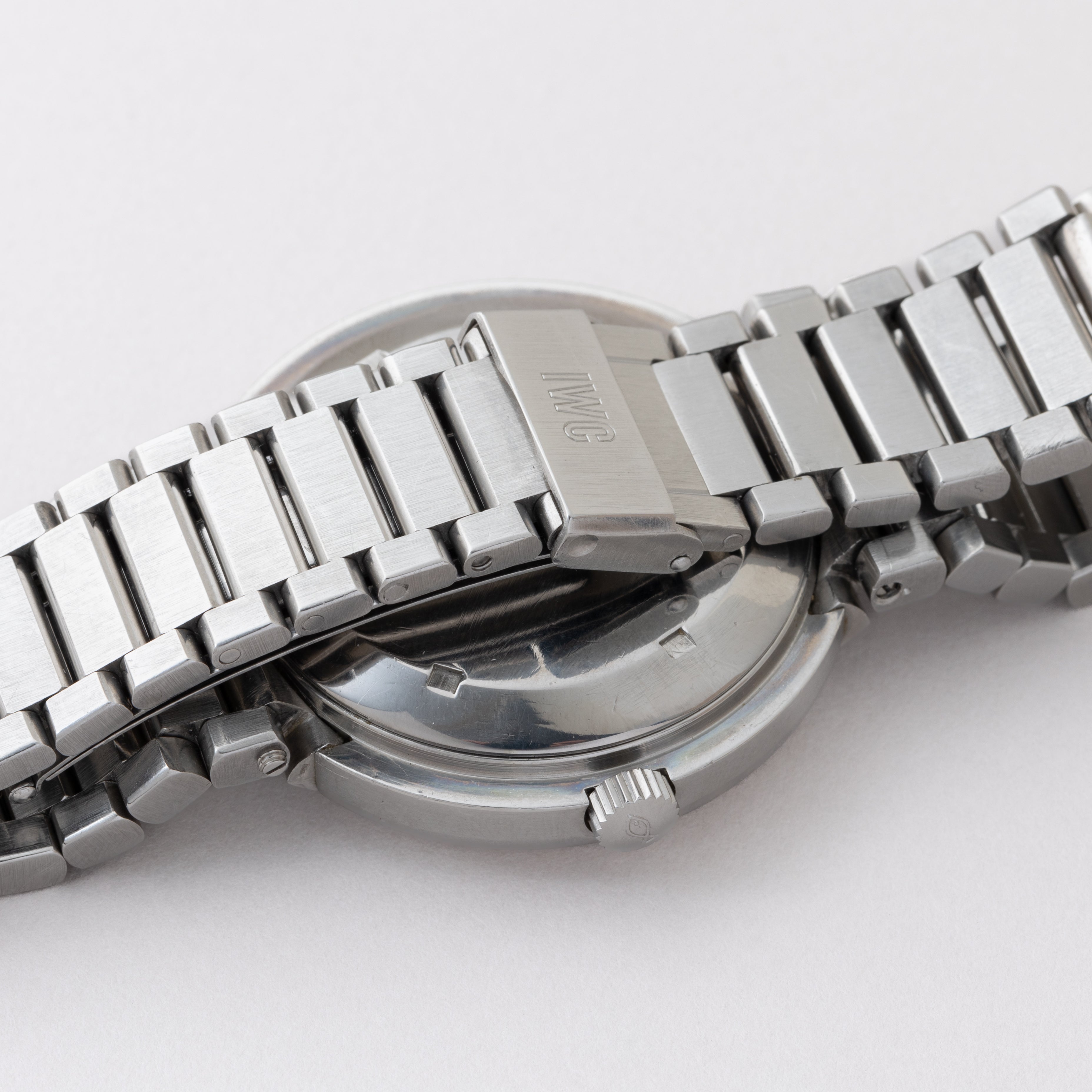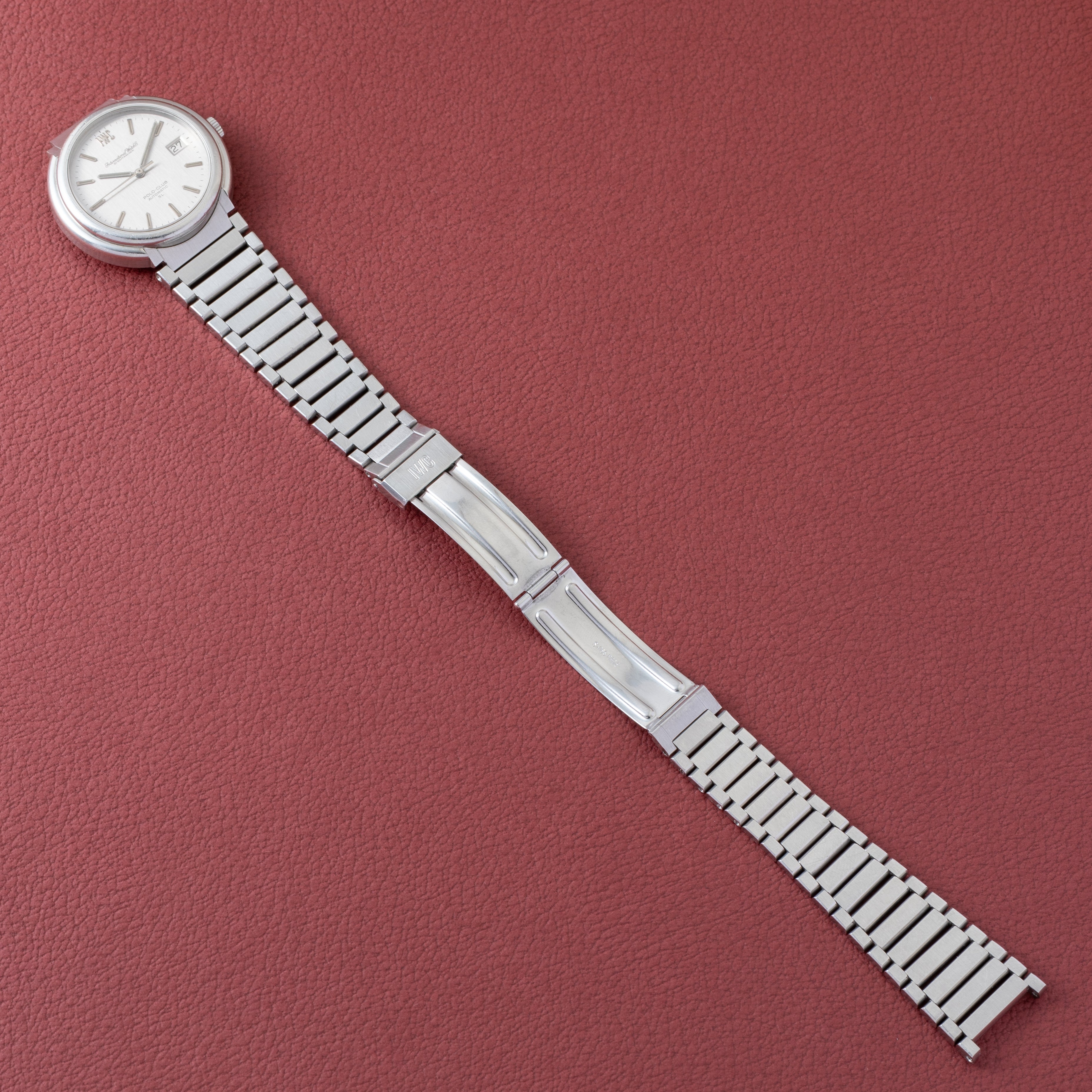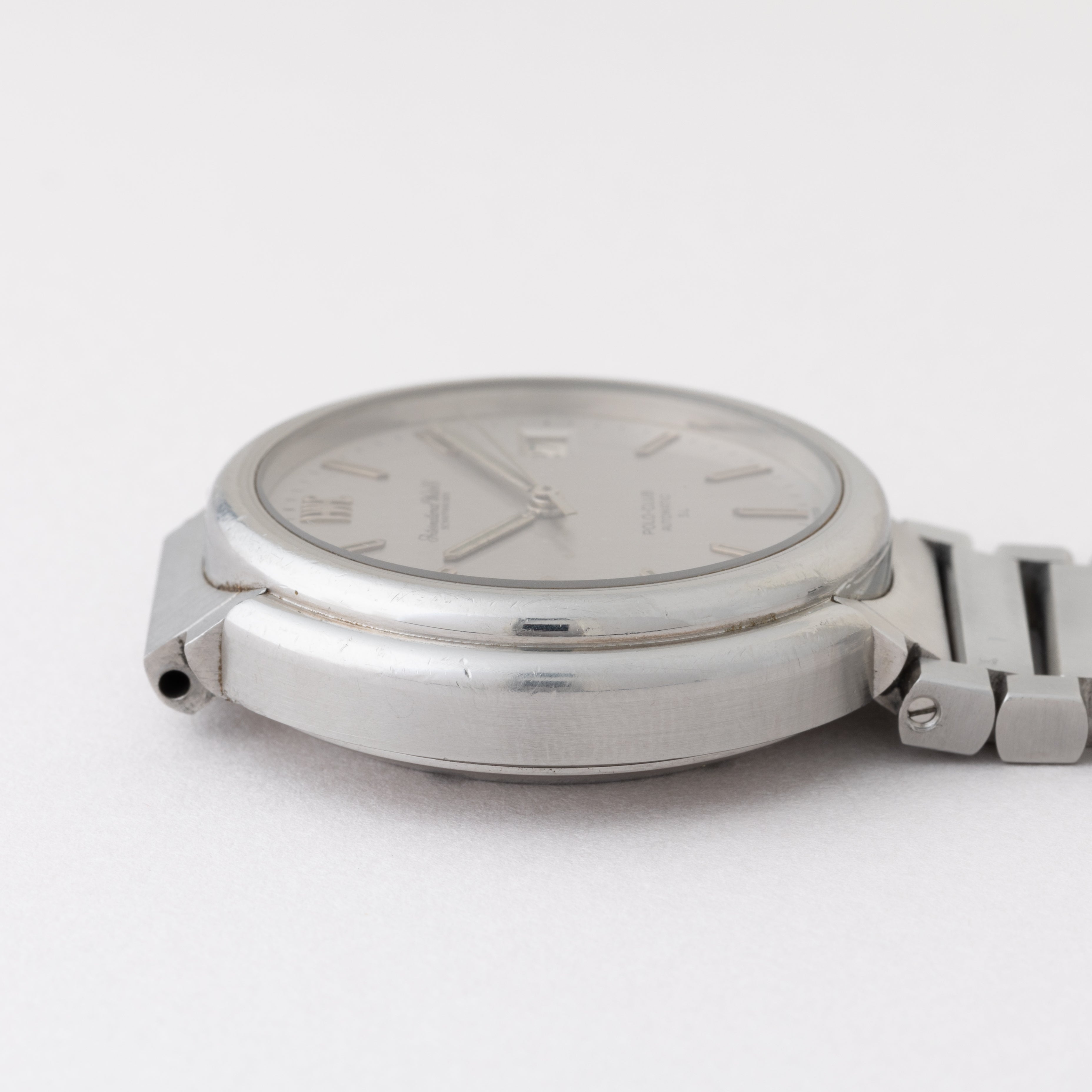 IWC ポロクラブ 1978年製 ラウンドケース Cal.8541B ジェラルド・ジェンタデザインです。ジェラルド・ジェンタ氏のデザインらしいラグジュアリースポーツモデルになっています。デザインは先進的ながらムーブメントはペラトン式自動巻きの最終型Cal.8541Bを搭載しています。文字盤は表面の劣化が見られますが良いヴィンテージ感です。ケースは小傷が見られますが大きなダメージはありません。ブレスは純正のステンレスブレスになっています。