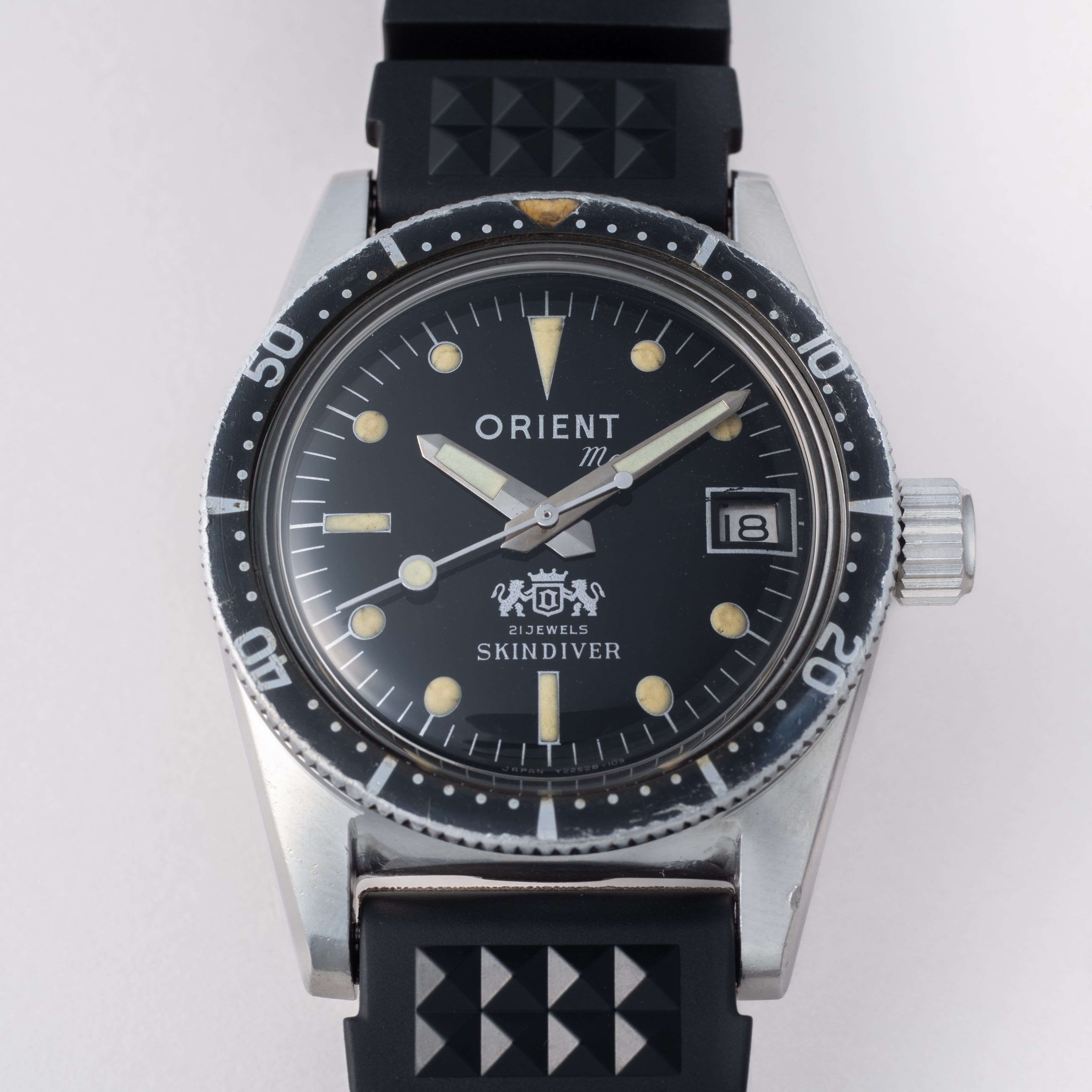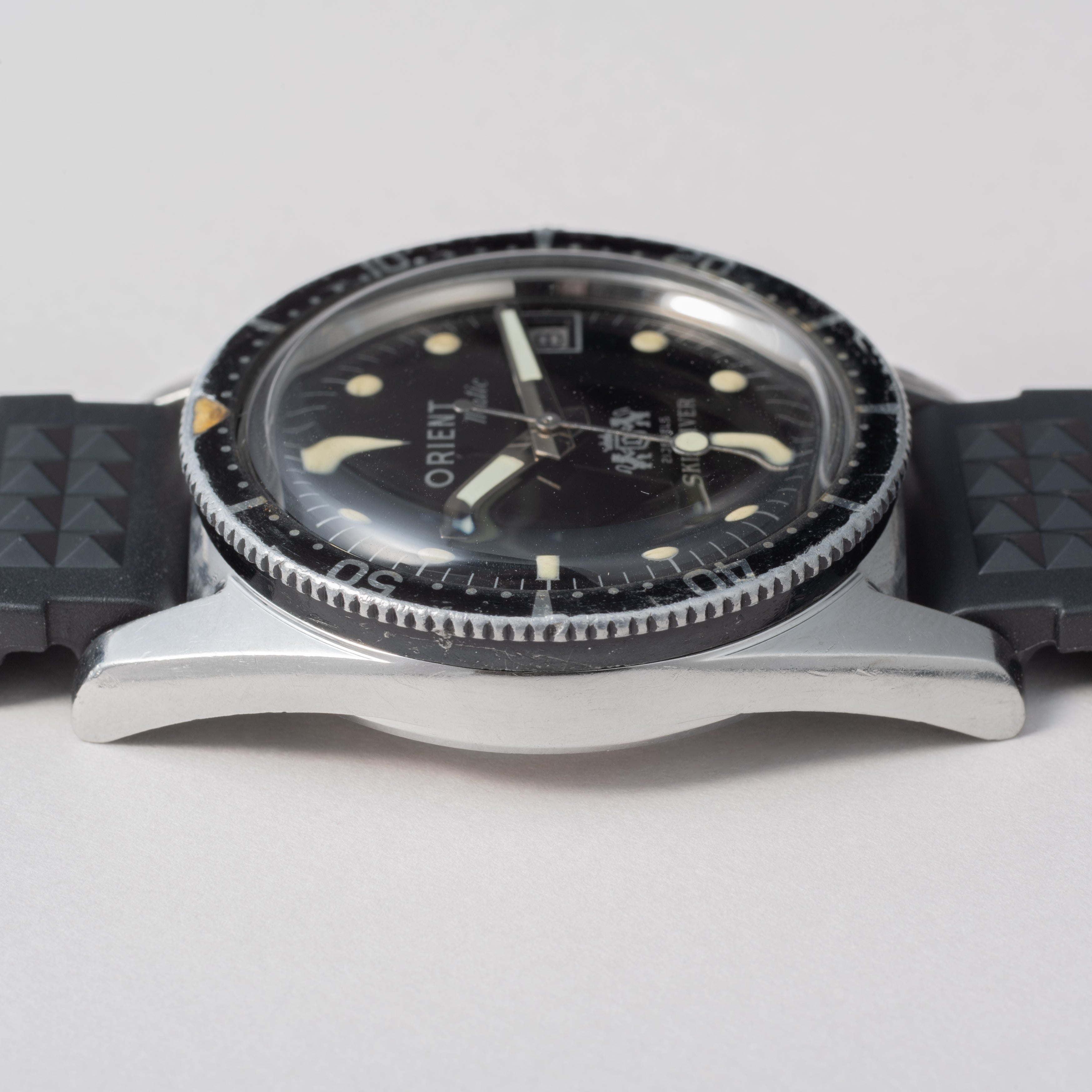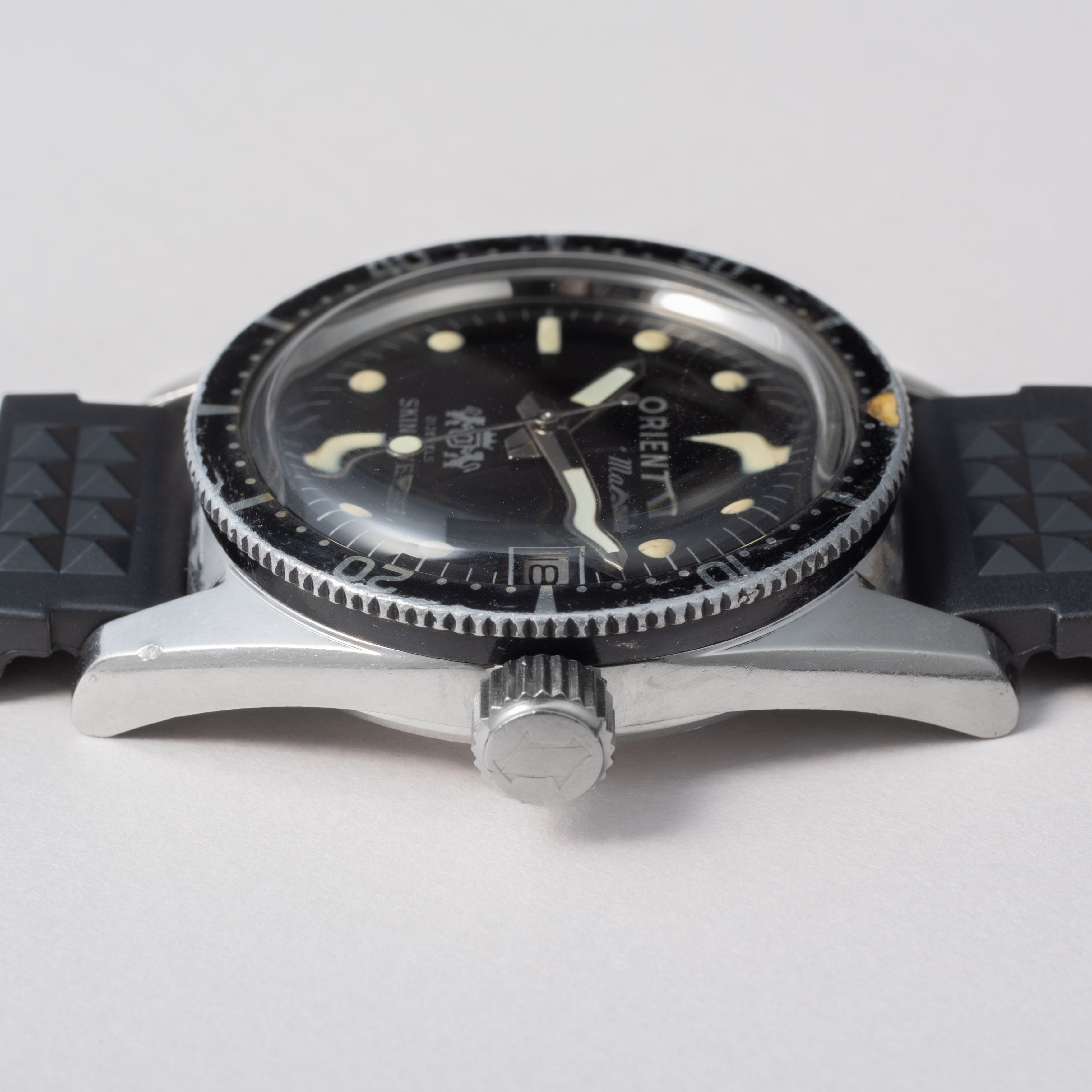 1960年代製、オリエントのスキンダイバーです。スキンダイバーは「素潜り」の意味ですが、この時計は300Mの刻印がされています。他モデルではあまり見られない太字のオリエントロゴ、6時位置の白色の獅子マークも特徴です。文字盤、ケースに小傷が見られますが、大きなダメージはありません。ベルトは社外のラバーベルトを合わせています。こちらはOH済みです。