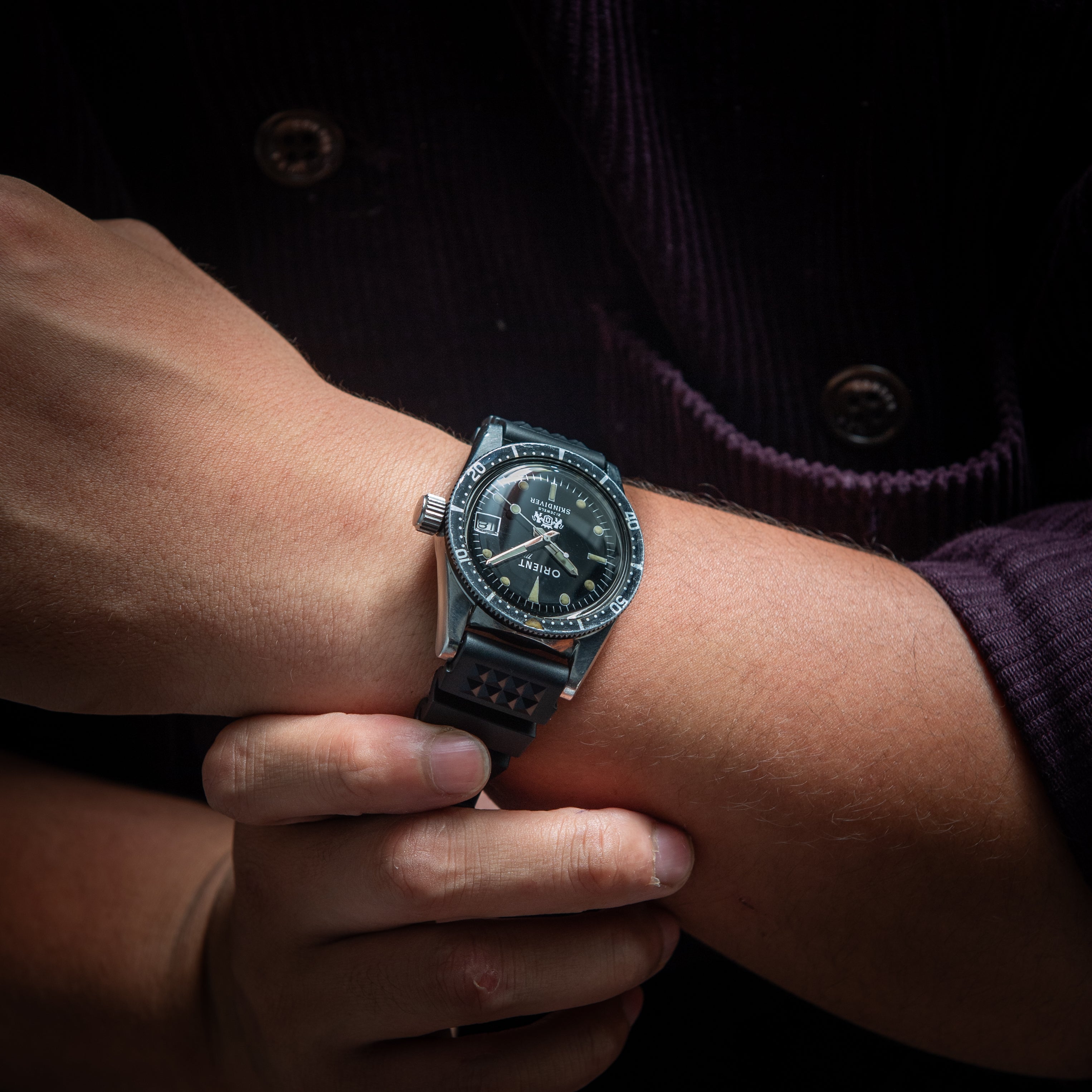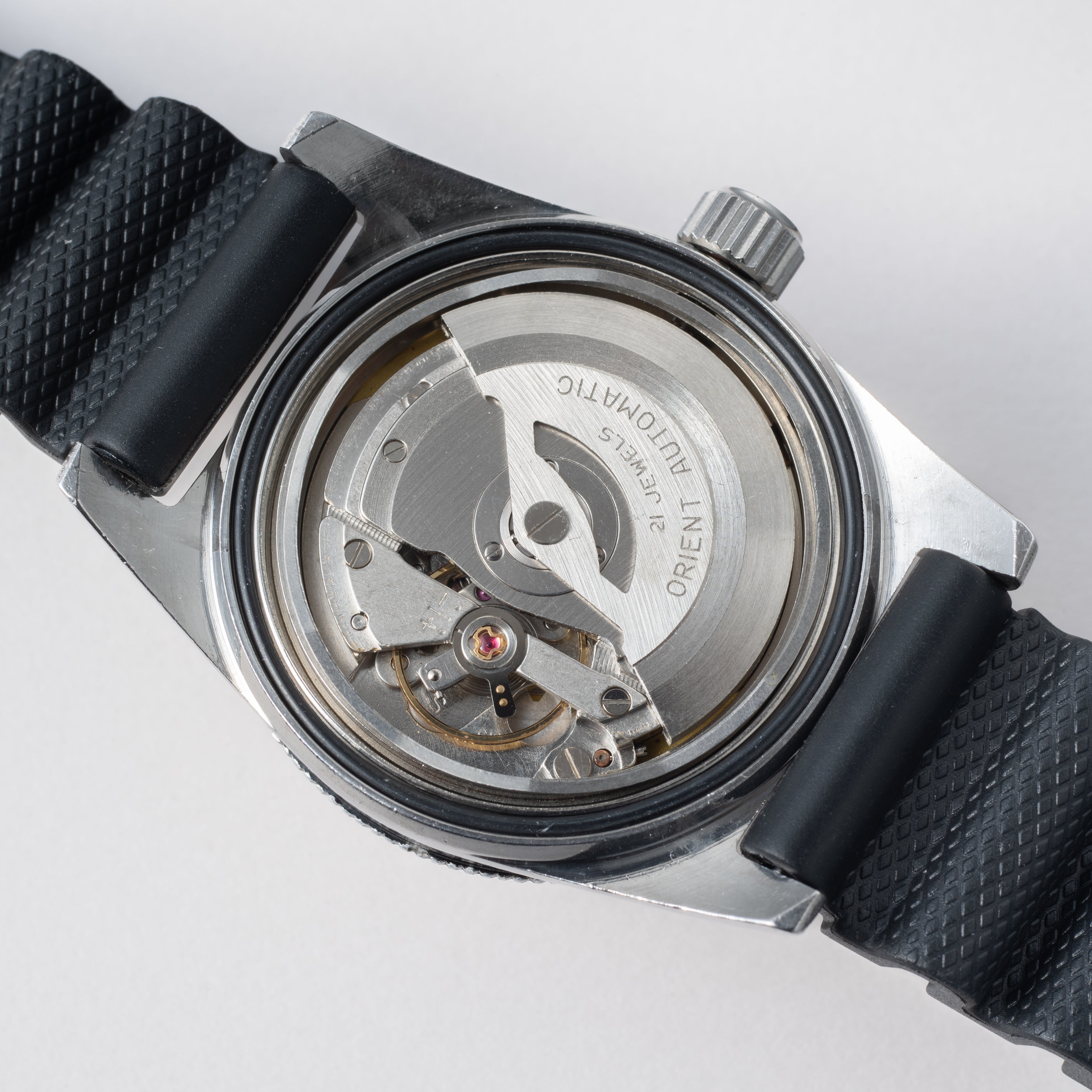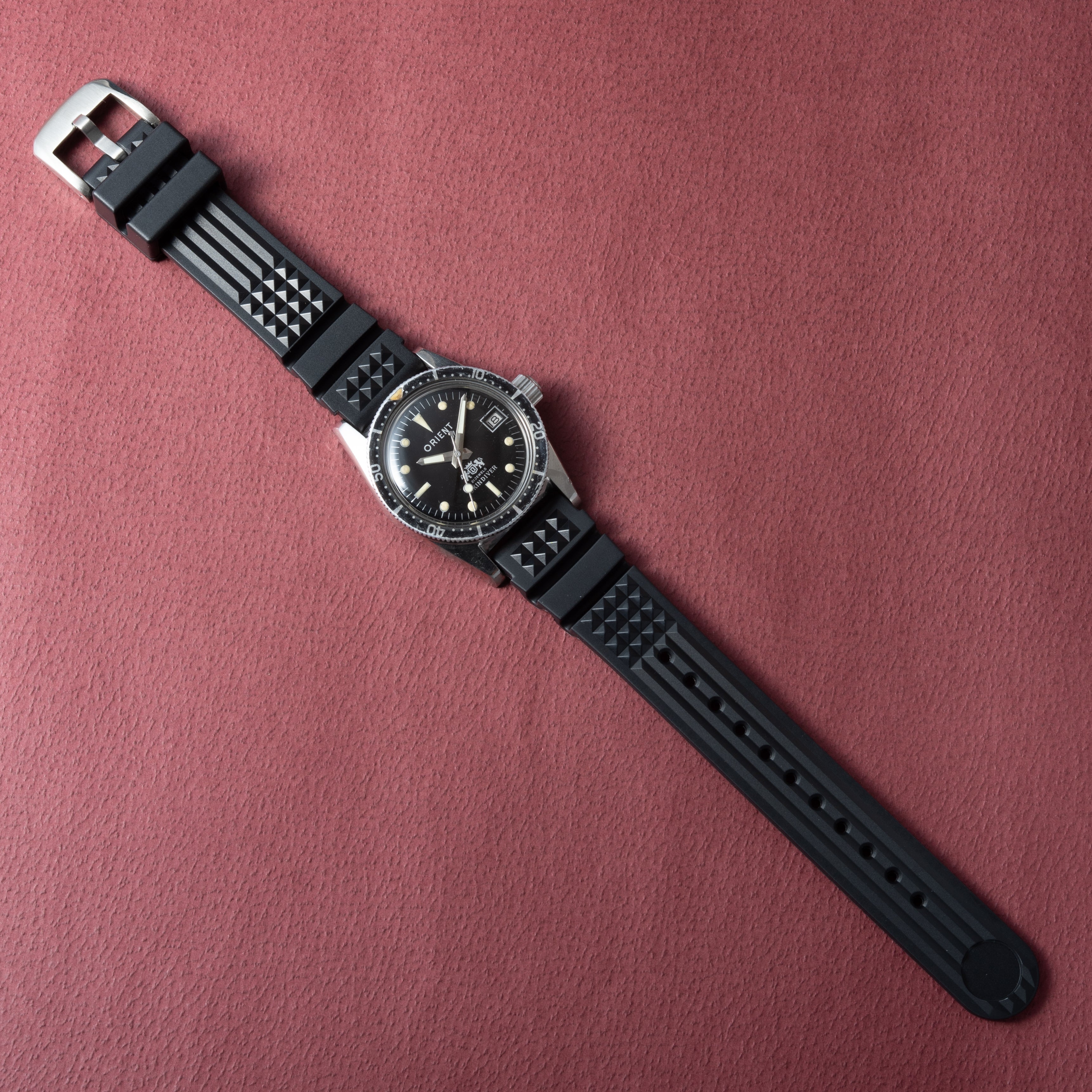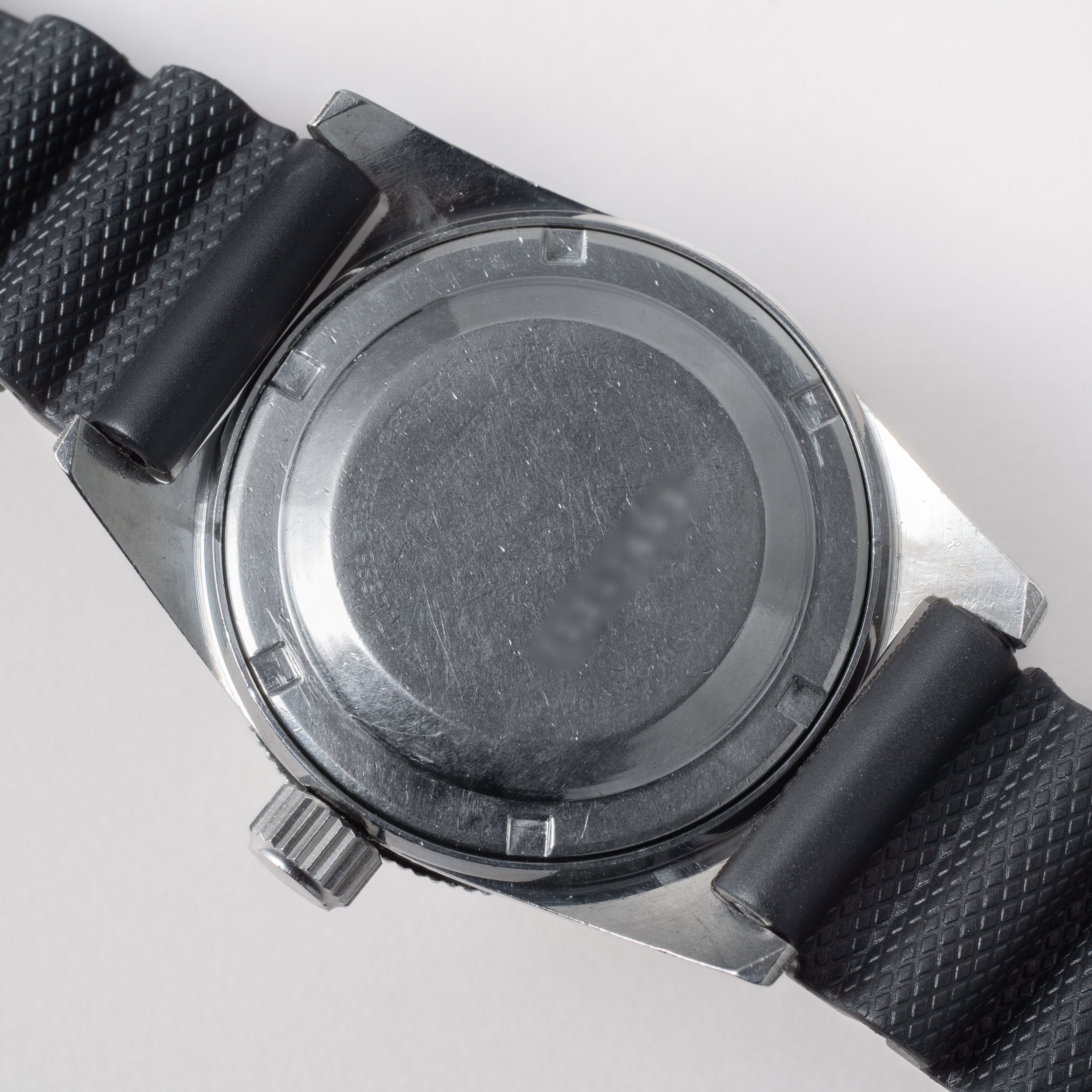 1960年代製、オリエントのスキンダイバーです。スキンダイバーは「素潜り」の意味ですが、この時計は300Mの刻印がされています。他モデルではあまり見られない太字のオリエントロゴ、6時位置の白色の獅子マークも特徴です。文字盤、ケースに小傷が見られますが、大きなダメージはありません。ベルトは社外のラバーベルトを合わせています。こちらはOH済みです。