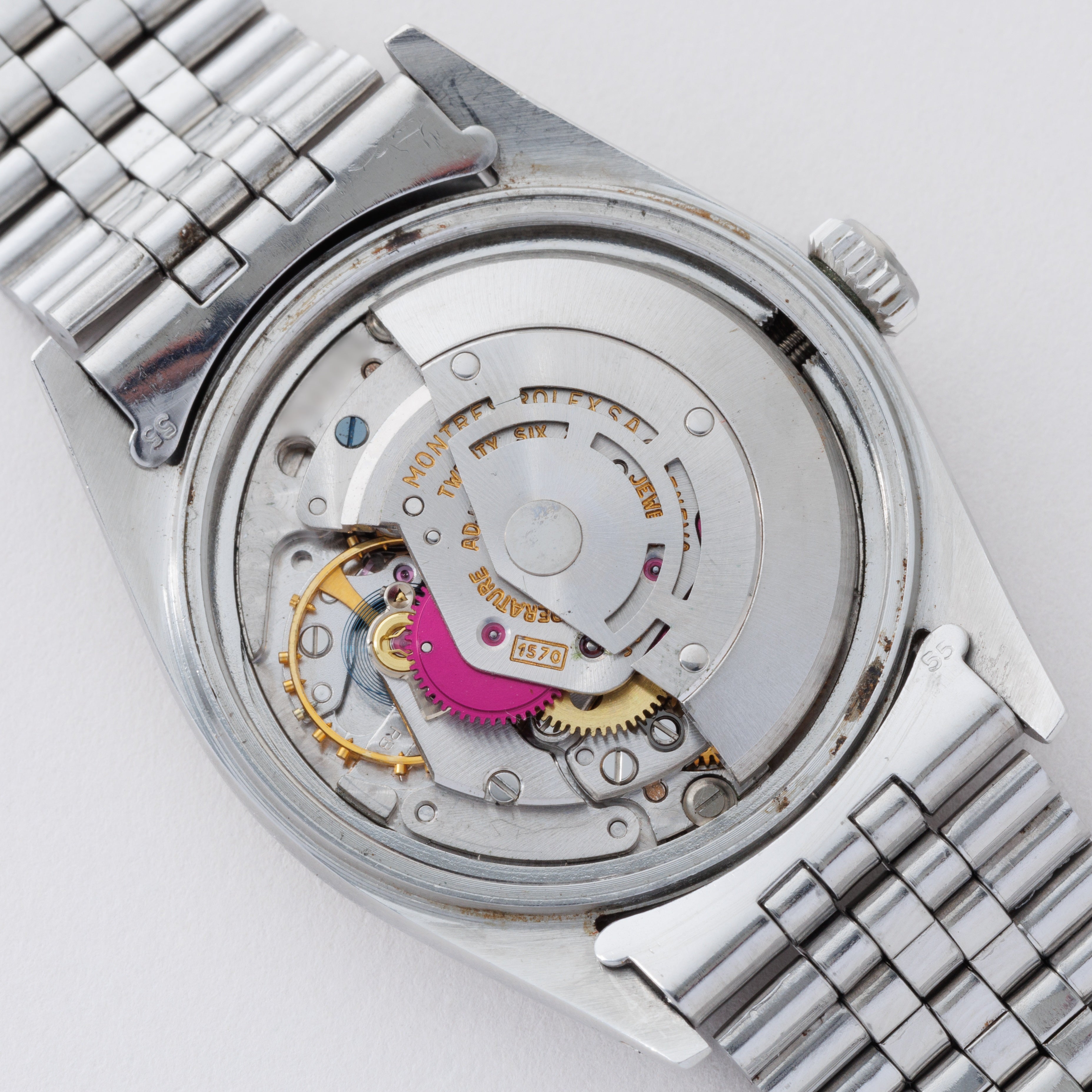 - ヴィンテージ時計の特性上、風防・パッキン・リューズ・バネ棒などの消耗部品は後年メンテナンス過程で交換されている場合がございます。オリジナル性を重視しておりますが、必要に応じて適切な部品にて調整されていますので、よりコレクション性重視のお求めのお客様は事前にご確認ください。