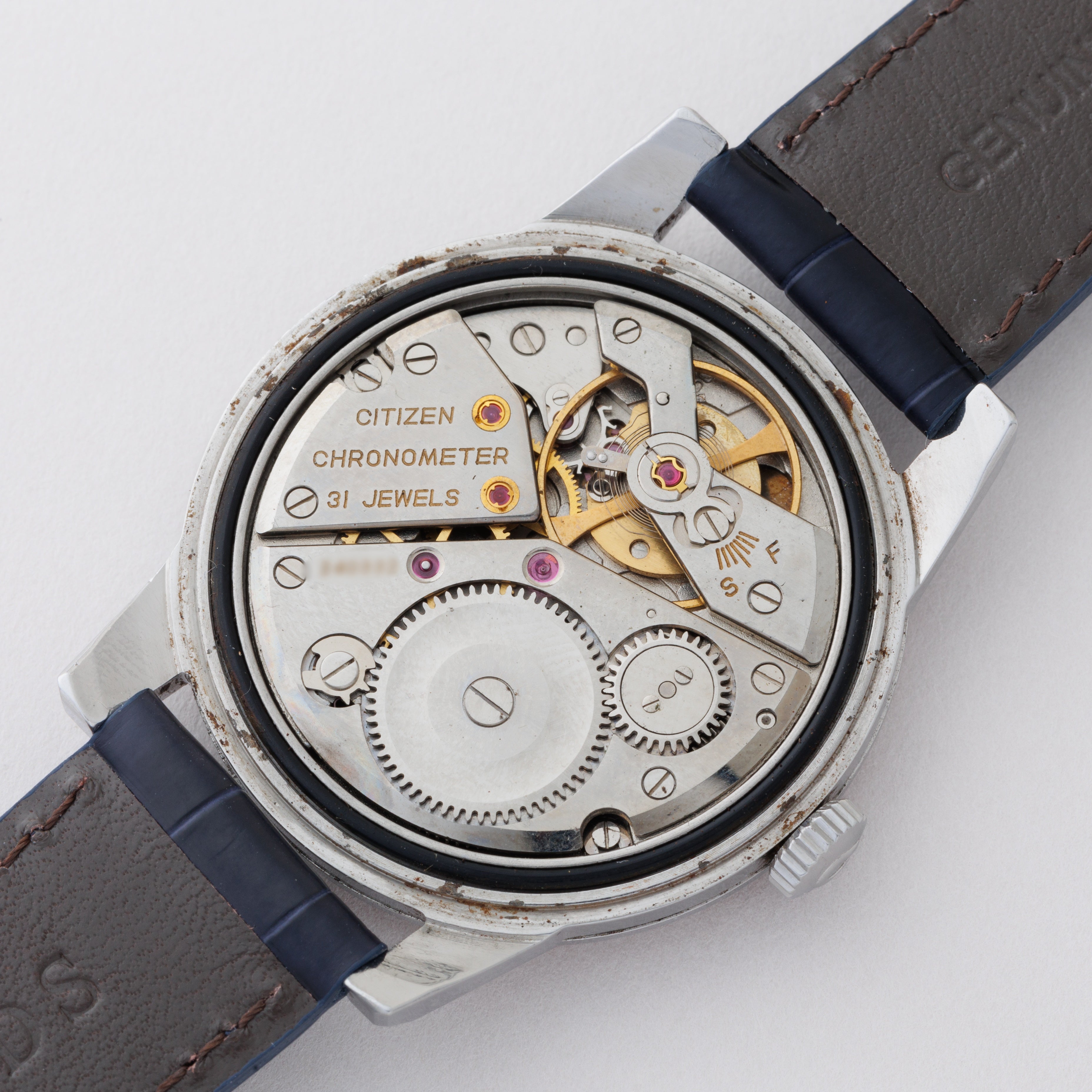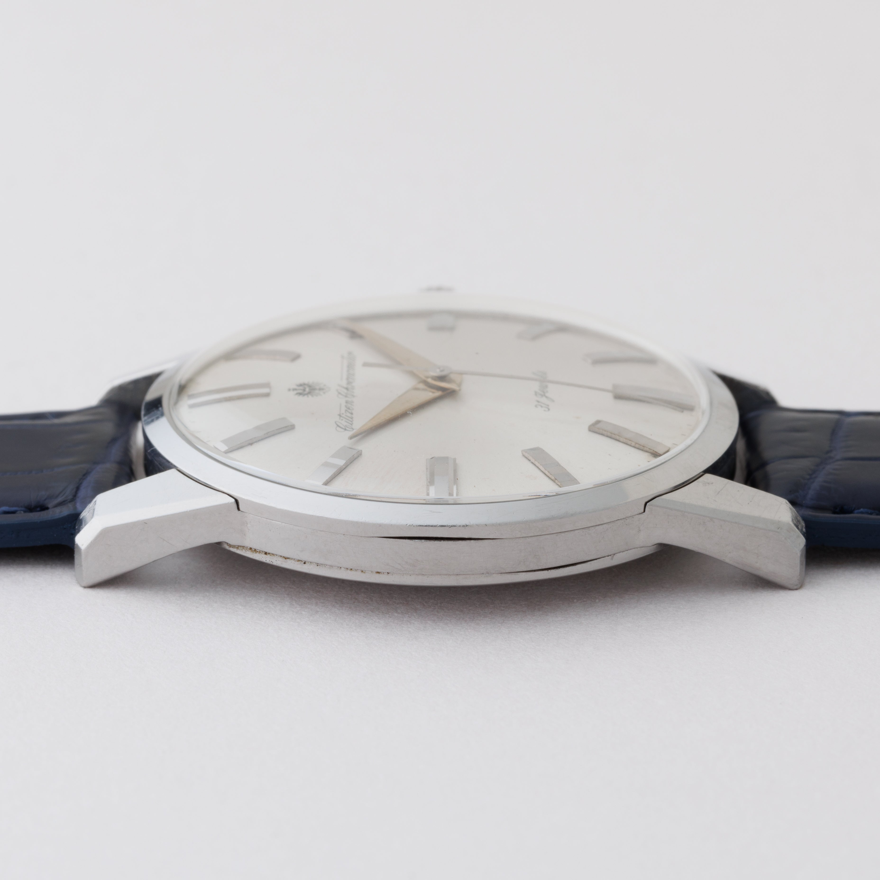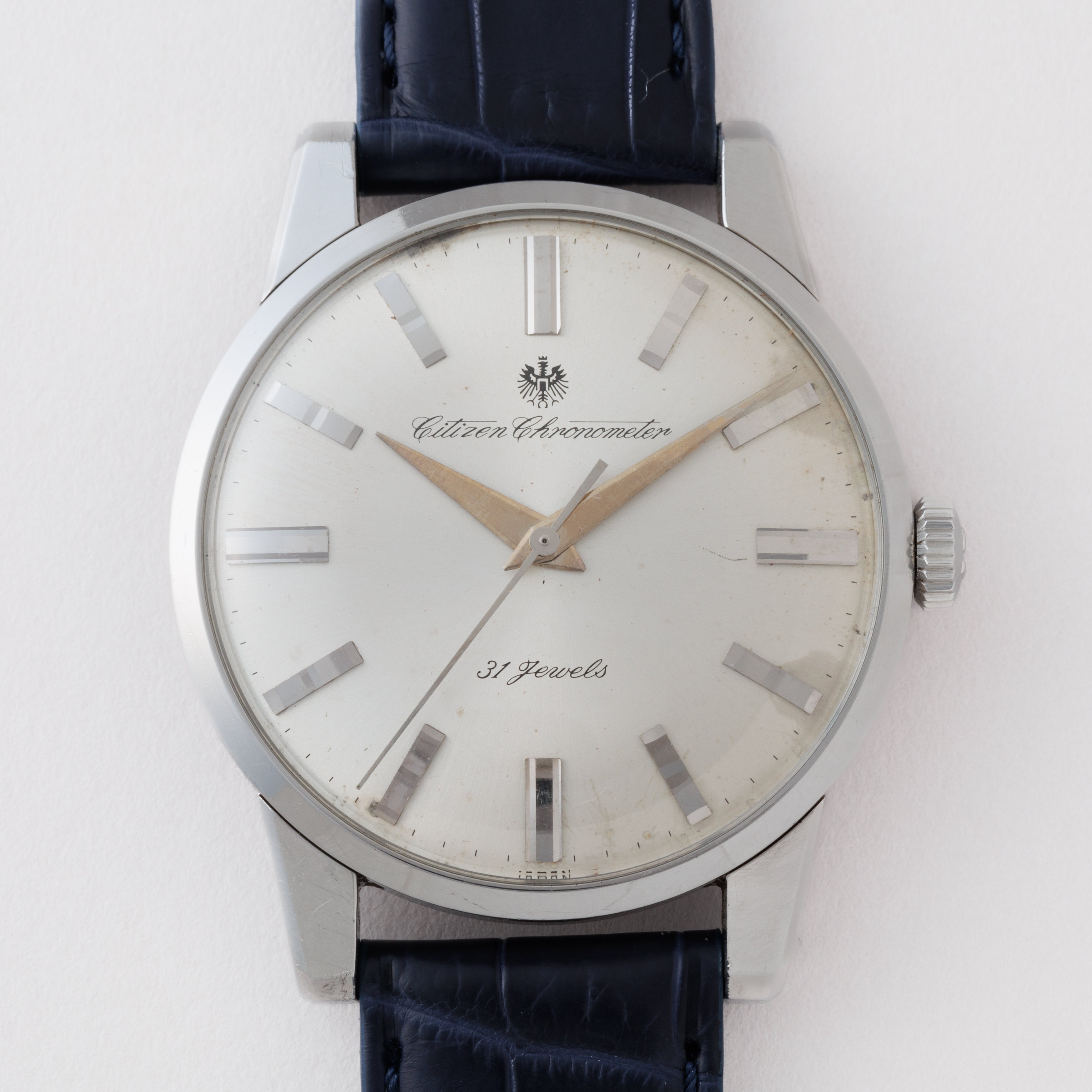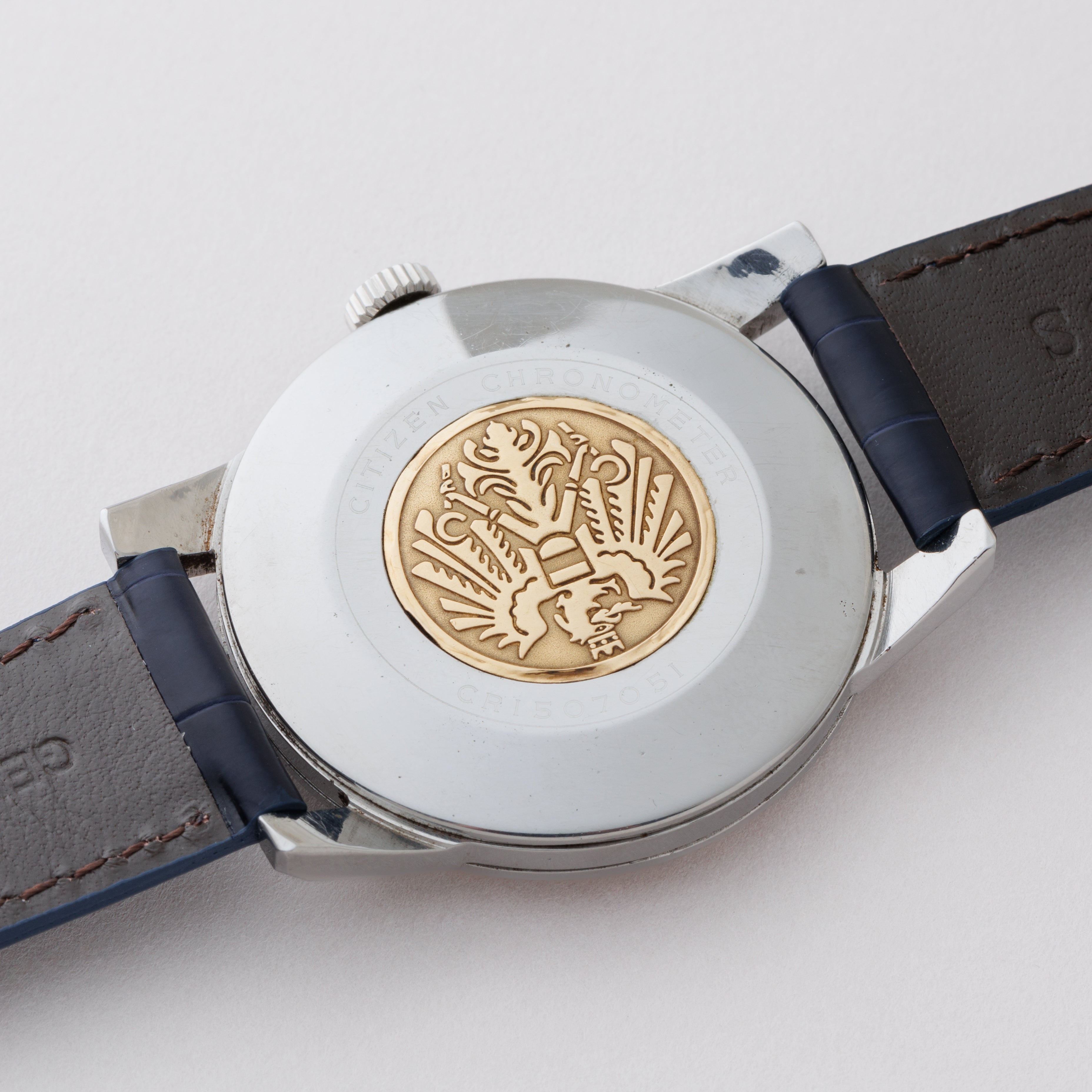国産腕時計最高峰の一つと言われているシチズンの名機「クロノメーターCR1507051」1963年製です。 1962年から1966年までの約4年間のみ製造されたモデルで、採算を度外視して造られた為に短命になったと言われています。人気のステンレスケースで非常に美しい外観と精度を重視した大型ムーブメントは惚れ惚れとします。ケースは小傷が見られますが大きなダメージや腐食は見られません。メダリオンも残っています。ベルトはファイアーキッズオリジナルのクロコダイルが取り付けてあります。手巻きや針回しの操作はスムースです。
