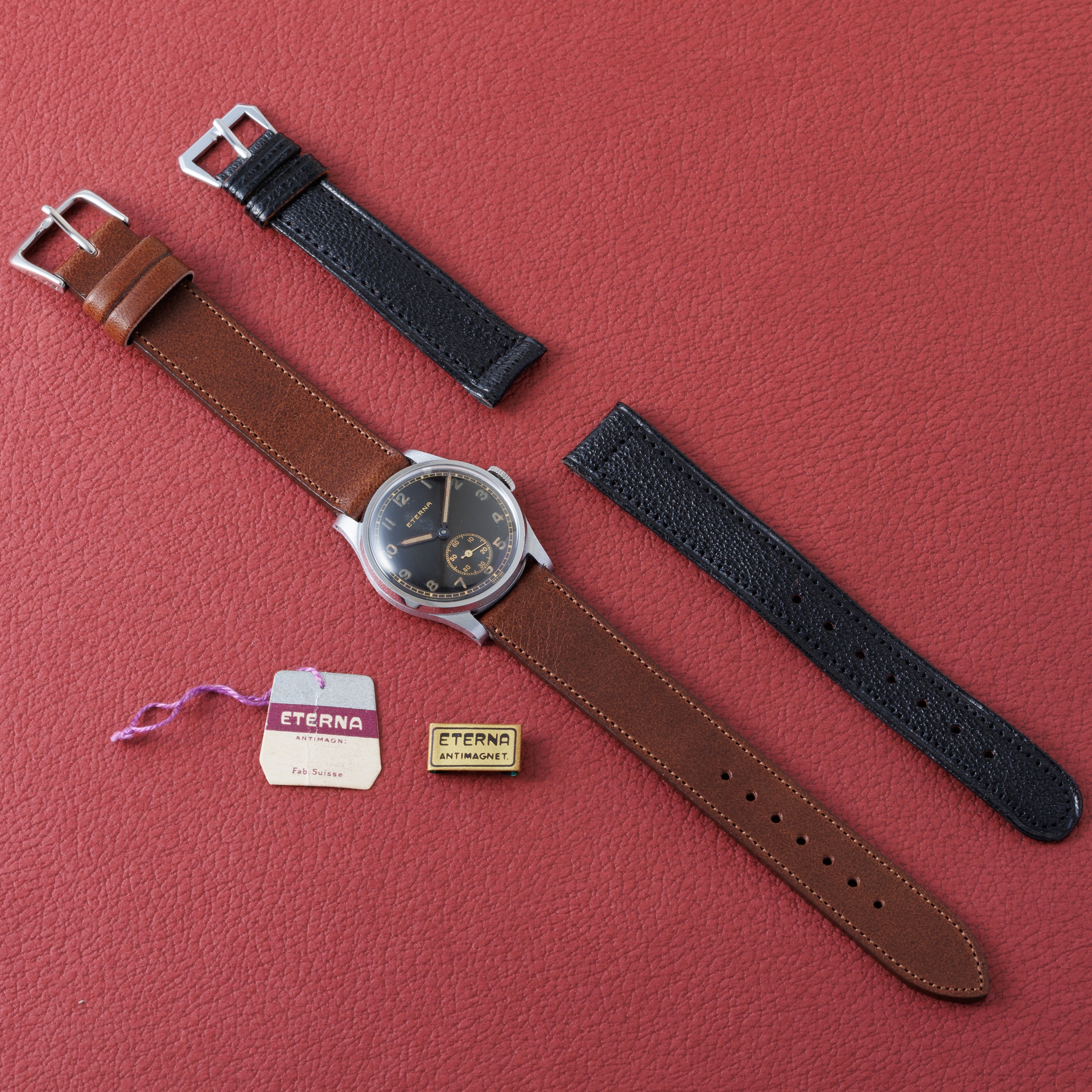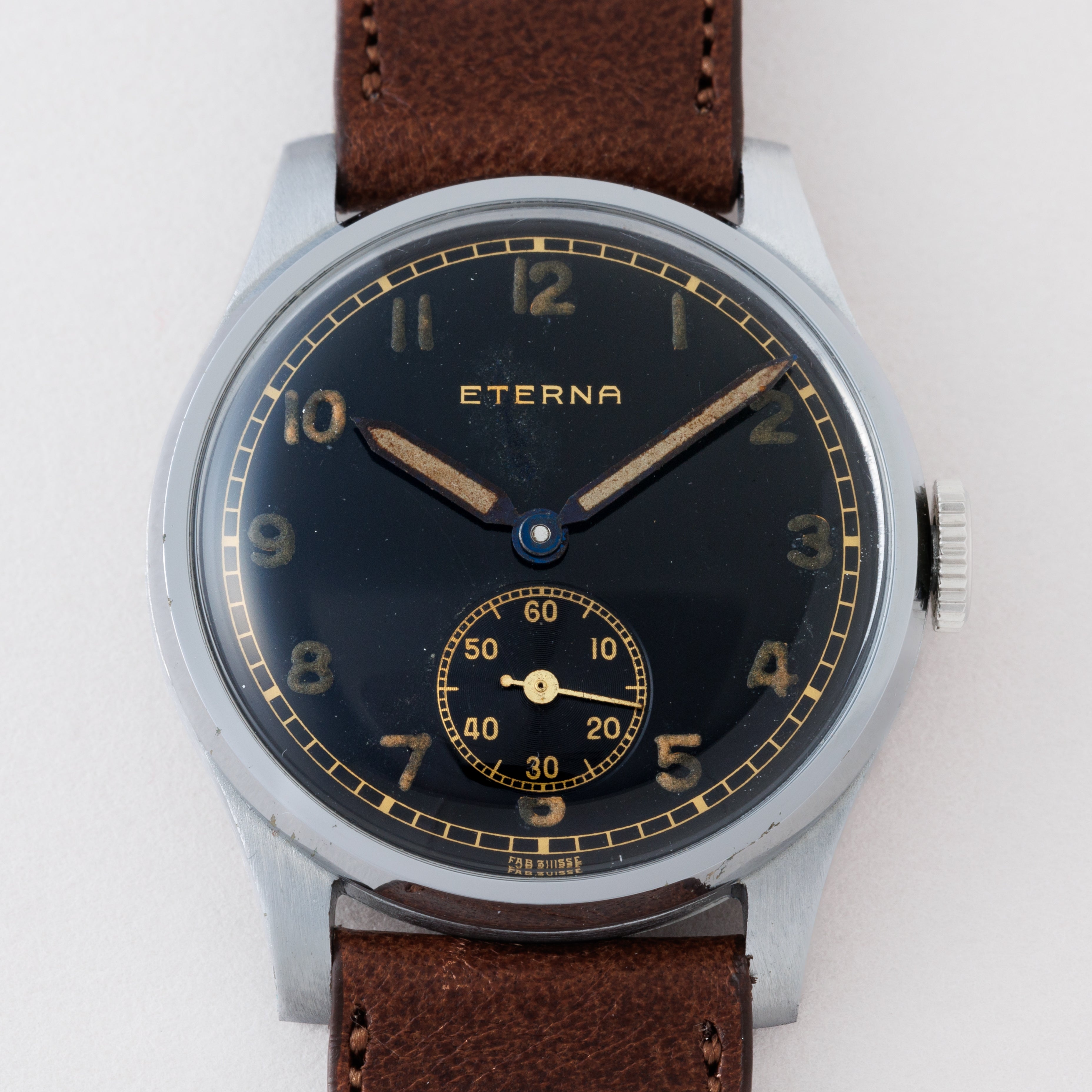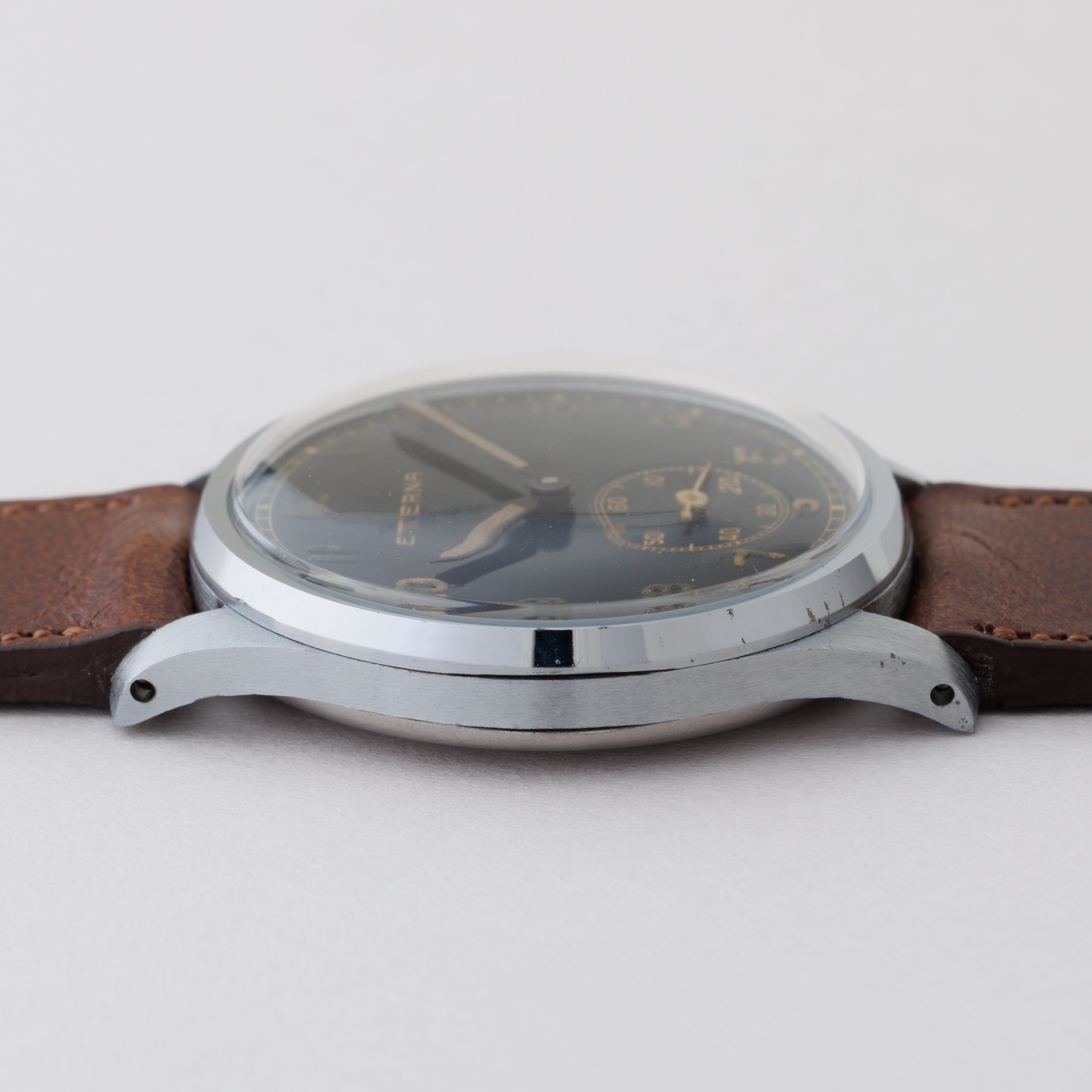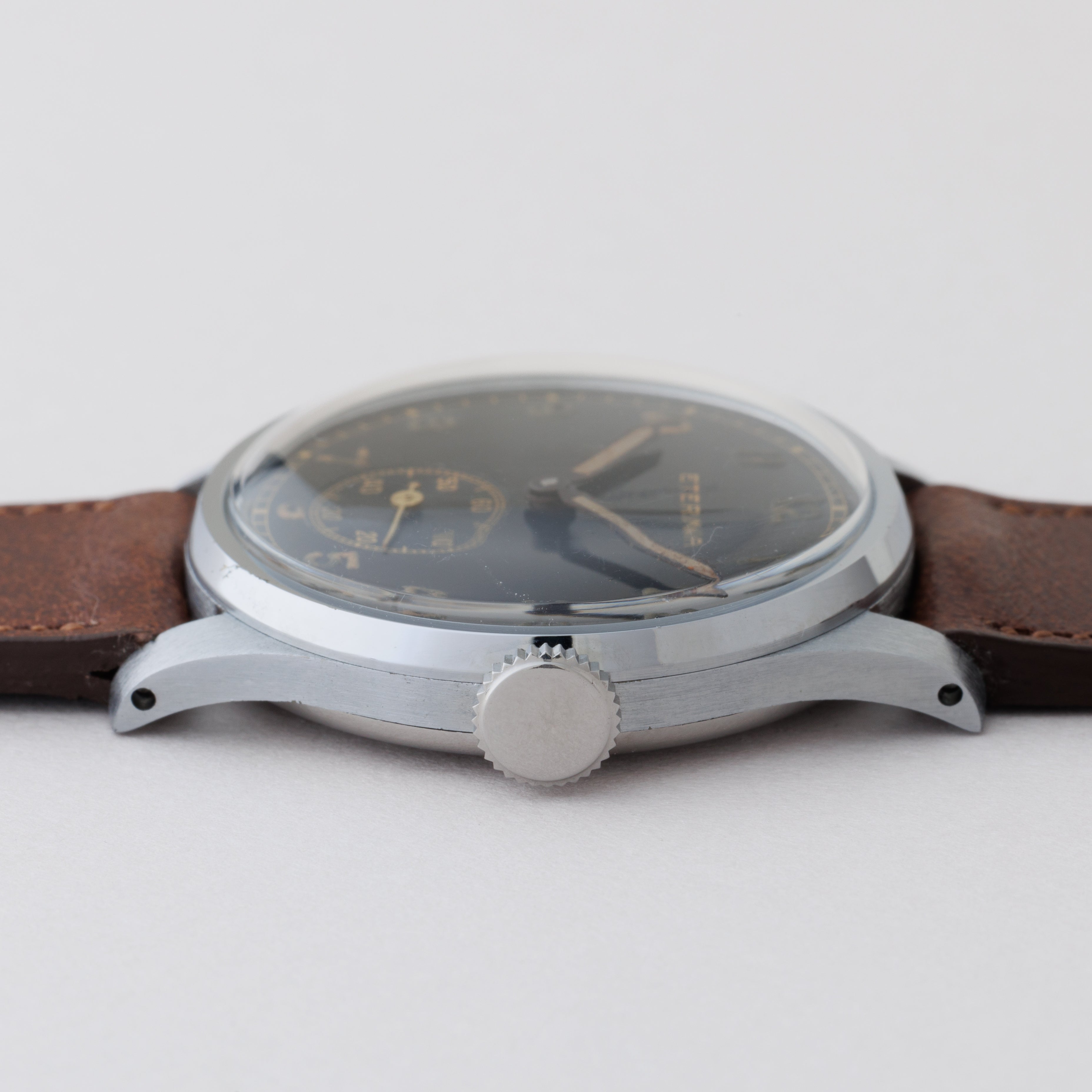 1940年代製スイスの名門エテルナのブラックミラーアラビアダイヤルです。夜光入りのアラビアダイヤル、ペンシルハンドは軍用時計を思わせるルックスで針焼けはありますが、ツヤをしっかりと残した状態です。ケースは気になるダメージや磨きのない非常に良好なコンディションです。ムーブメントはCal.905を搭載、手巻きや針回しの操作はスムースです。ファイアーキッズオリジナルのブッテーロカーフレザーベルトを合わせています。こちらはOH済みです。