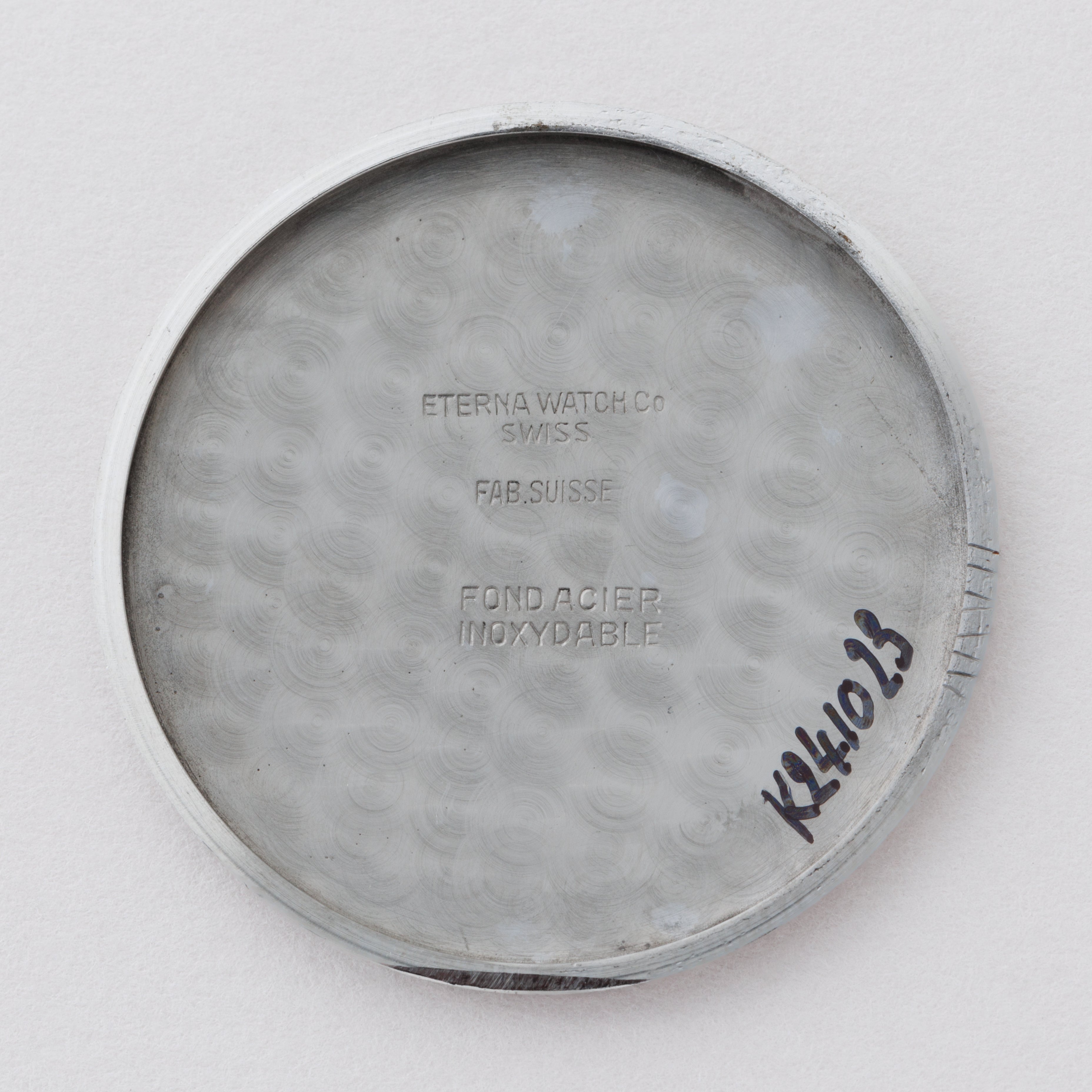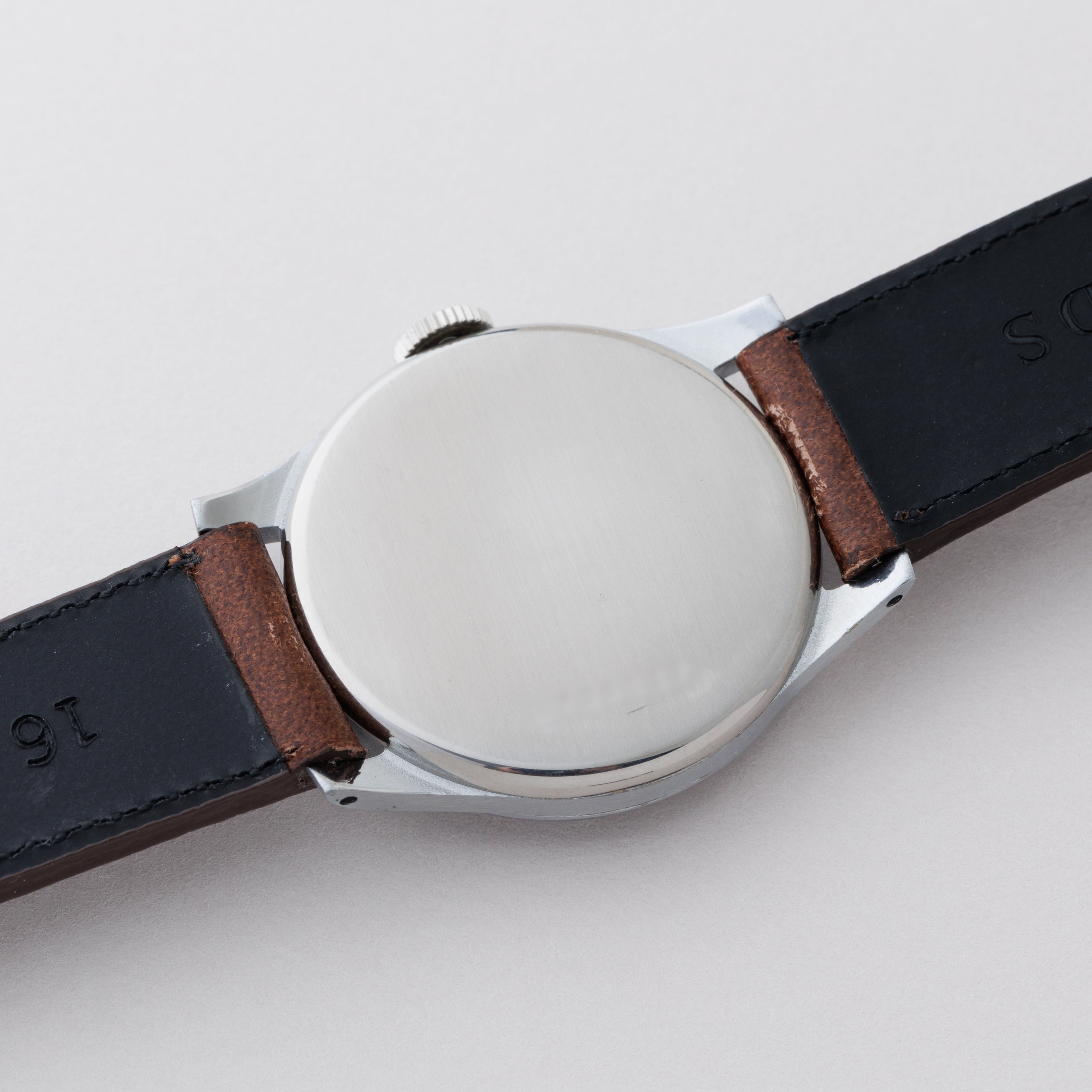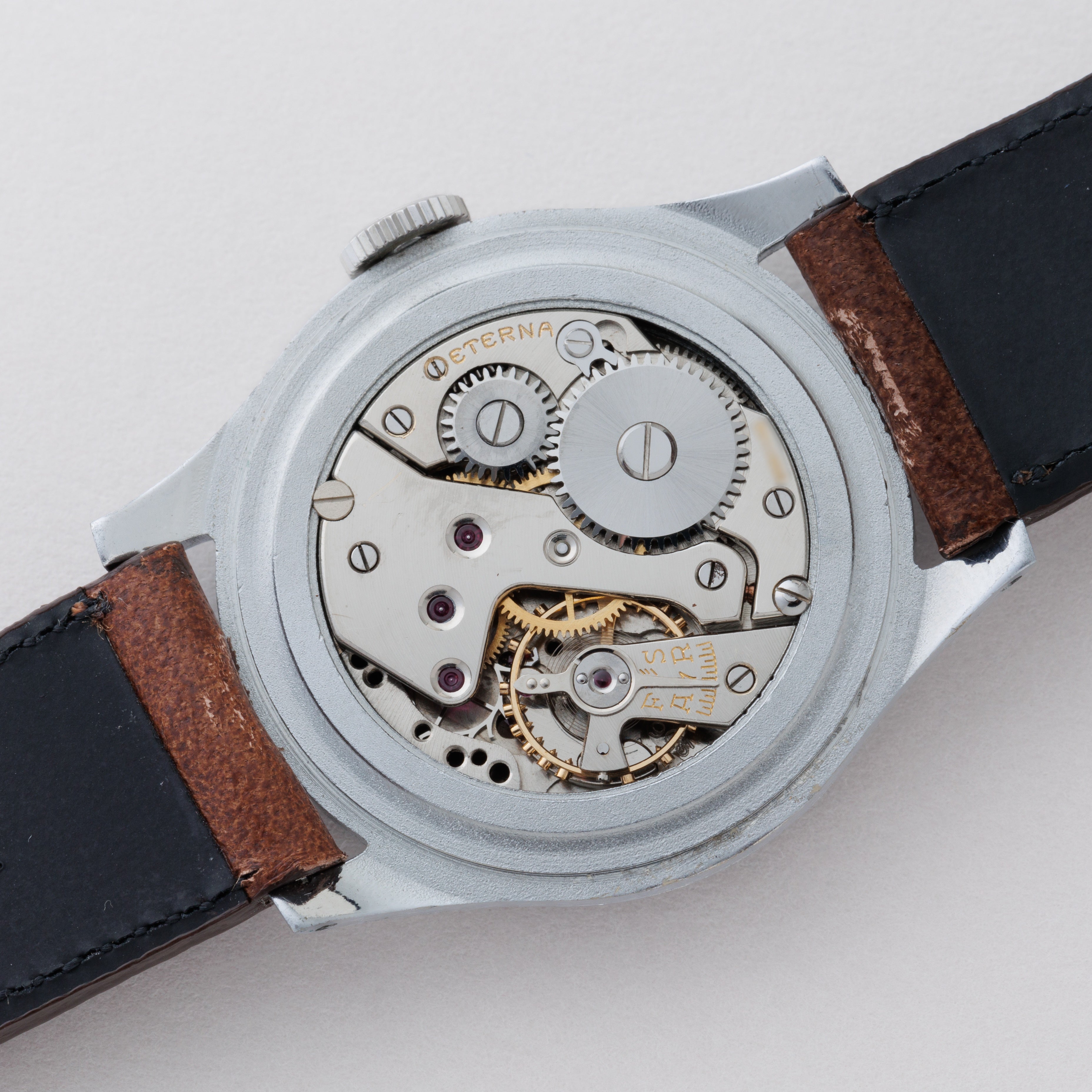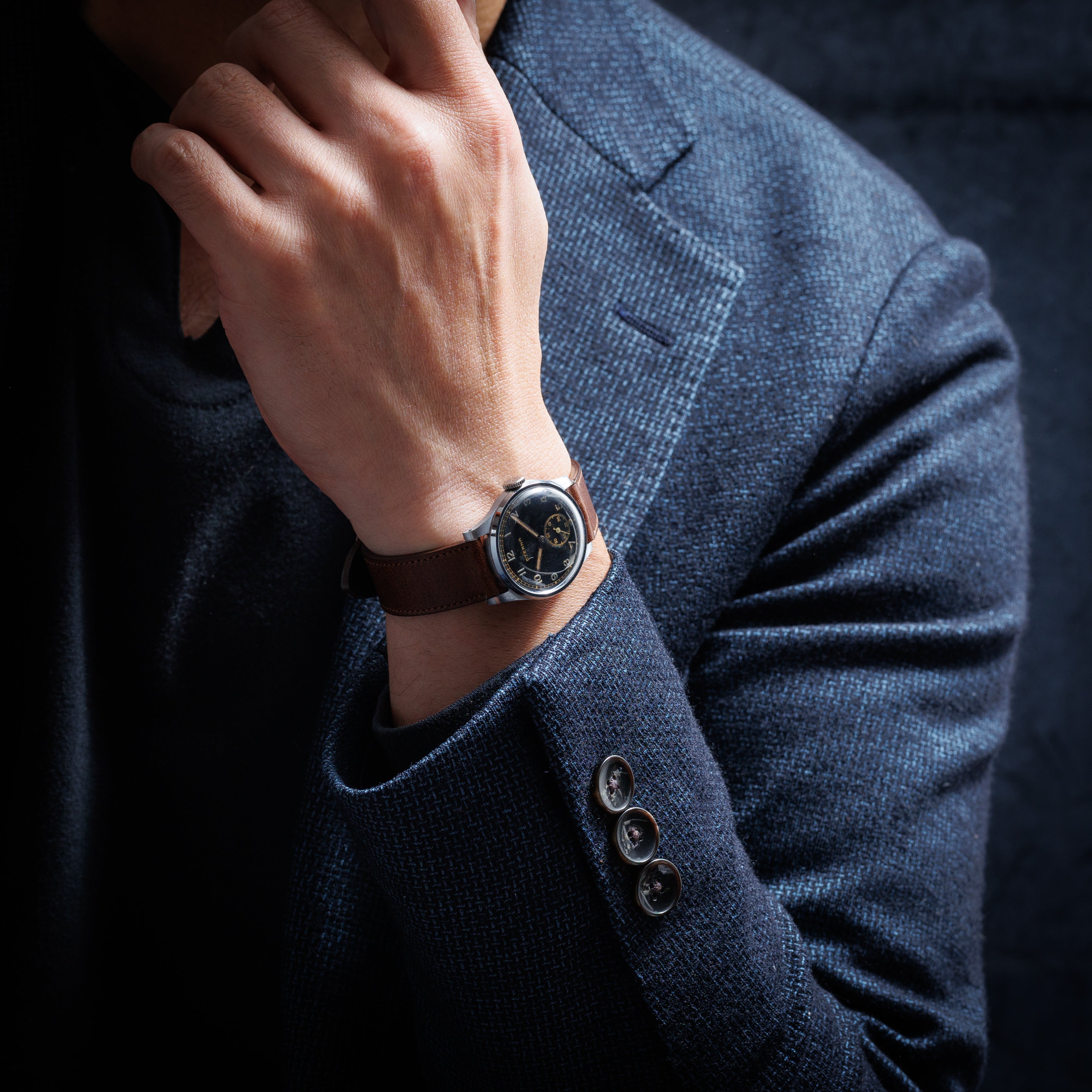 1940年代製スイスの名門エテルナのブラックミラーアラビアダイヤルです。夜光入りのアラビアダイヤル、ペンシルハンドは軍用時計を思わせるルックスで針焼けはありますが、ツヤをしっかりと残した状態です。ケースは気になるダメージや磨きのない非常に良好なコンディションです。ムーブメントはCal.905を搭載、手巻きや針回しの操作はスムースです。ファイアーキッズオリジナルのブッテーロカーフレザーベルトを合わせています。こちらはOH済みです。