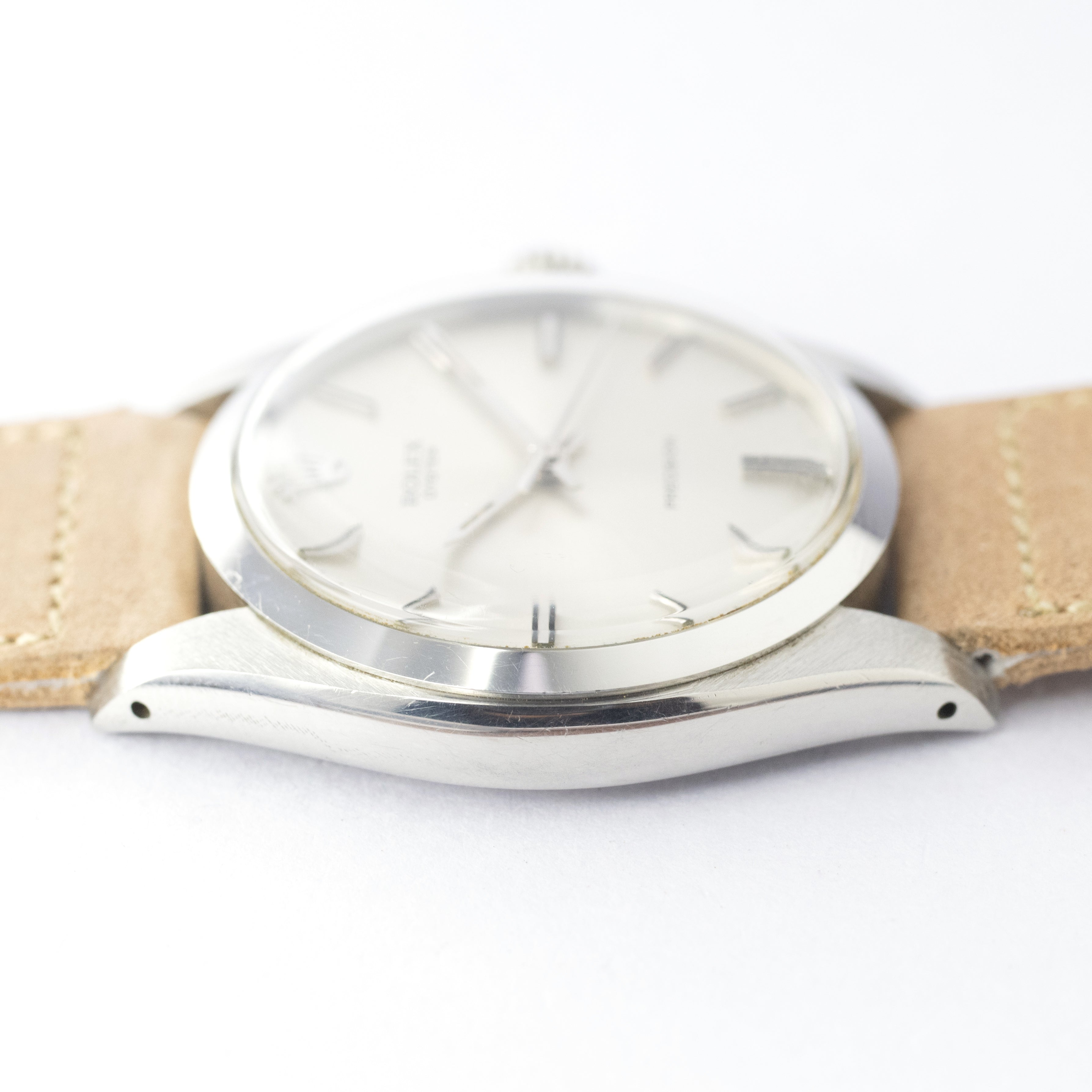 - ヴィンテージ時計の特性上、風防・パッキン・リューズ・バネ棒などの消耗部品は後年メンテナンス過程で交換されている場合がございます。オリジナル性を重視しておりますが、必要に応じて適切な部品にて調整されていますので、よりコレクション性重視のお求めのお客様は事前にご確認ください。