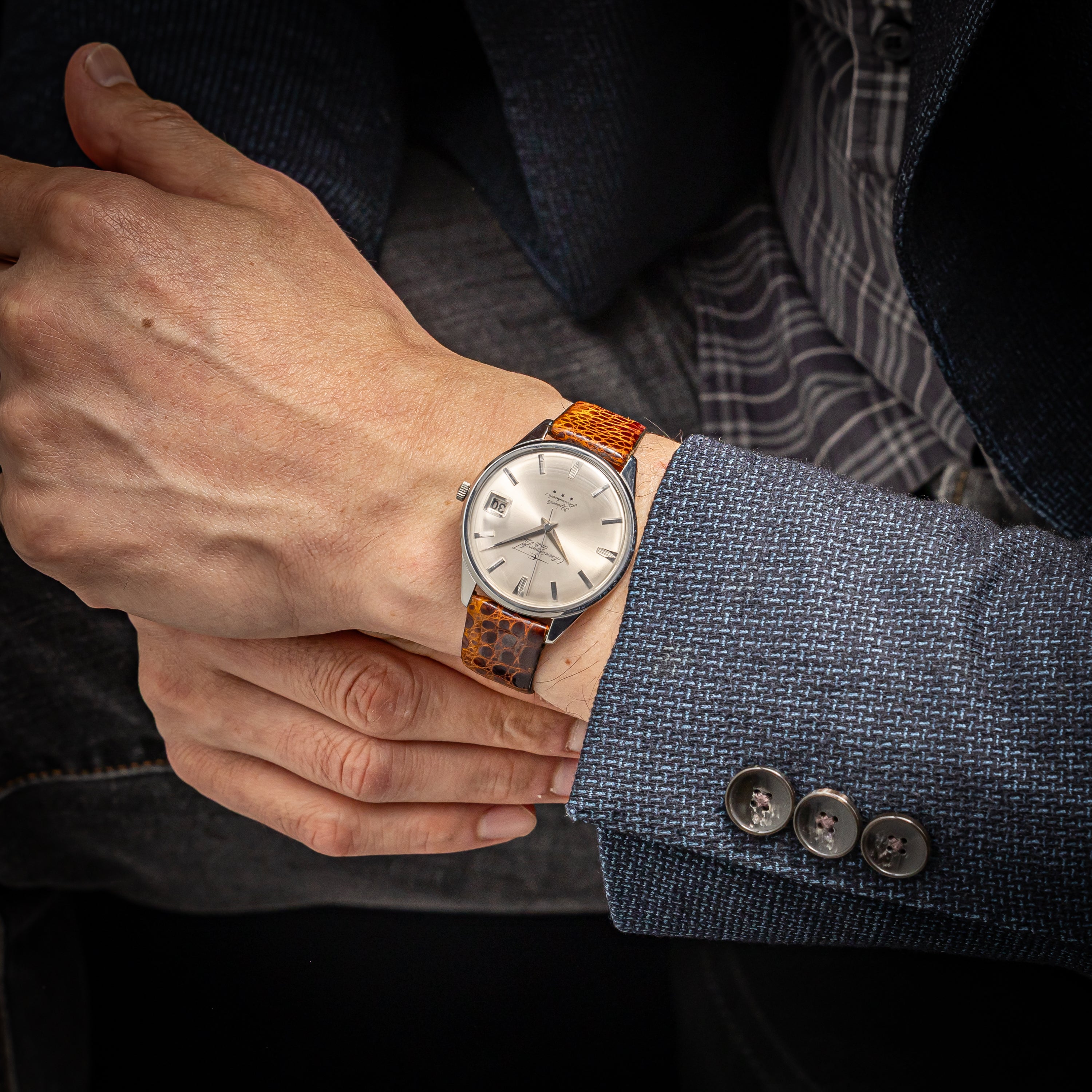 - ヴィンテージ時計の特性上、風防・パッキン・リューズ・バネ棒などの消耗部品は後年メンテナンス過程で交換されている場合がございます。オリジナル性を重視しておりますが、必要に応じて適切な部品にて調整されていますので、よりコレクション性重視のお求めのお客様は事前にご確認ください。