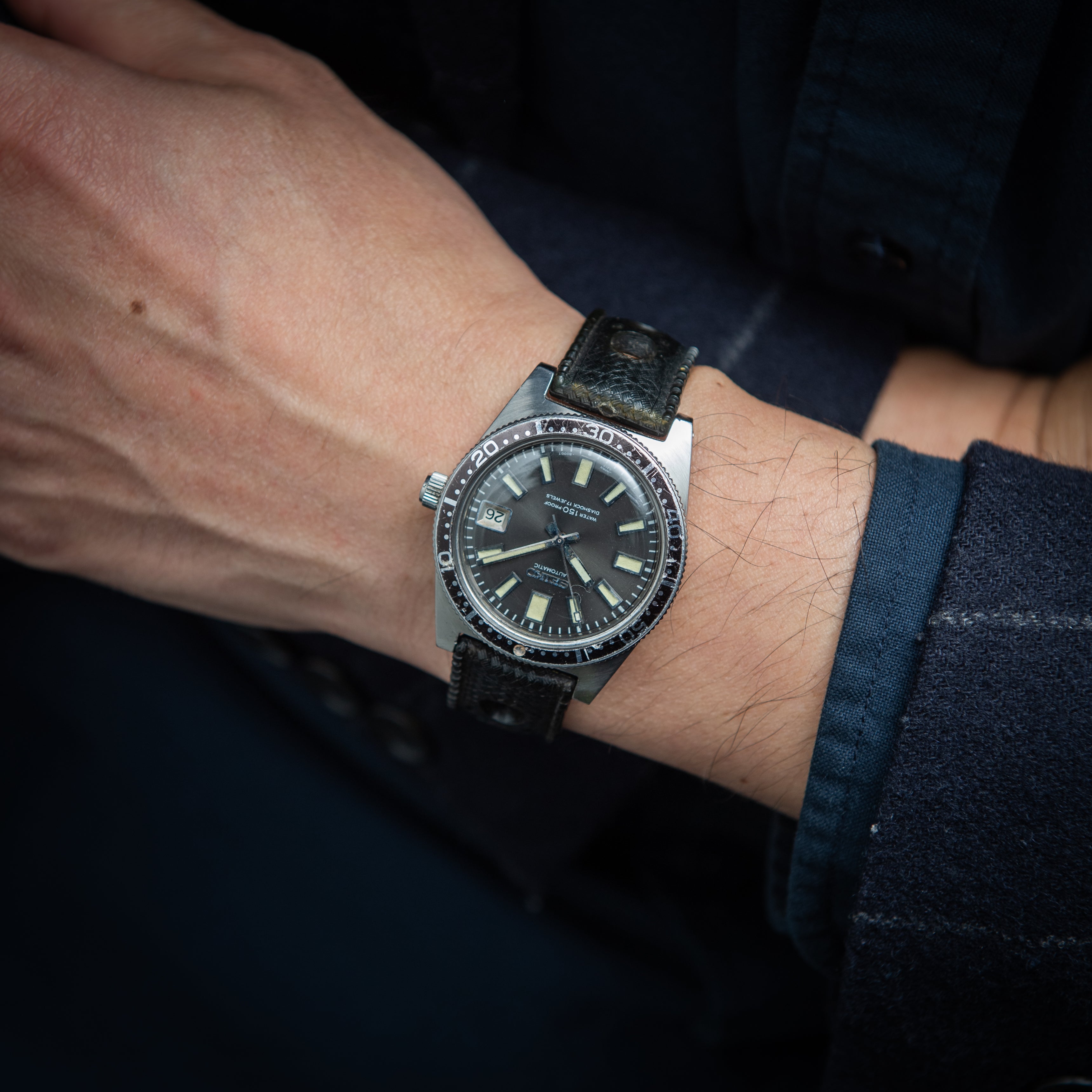 1965年製のセイコー1stダイバーです。国産初のダイバーズウオッチ150mダイバーファーストモデルの6217-8000です。1965年4月から製造されてるファーストダイバーですがこちらは初期型でわずか数か月しか製造していない希少モデルです。違いとしては後期型と比べてリューズの大きさとベゼルの厚みに違いがございます。ムーブメントは自動巻きのCal.6217Aを搭載。文字盤はキレイな状態です。ケースやベゼルは小傷はございますが大きなダメージはございません。ベルトは社外のラバーベルトが取り付けられています。