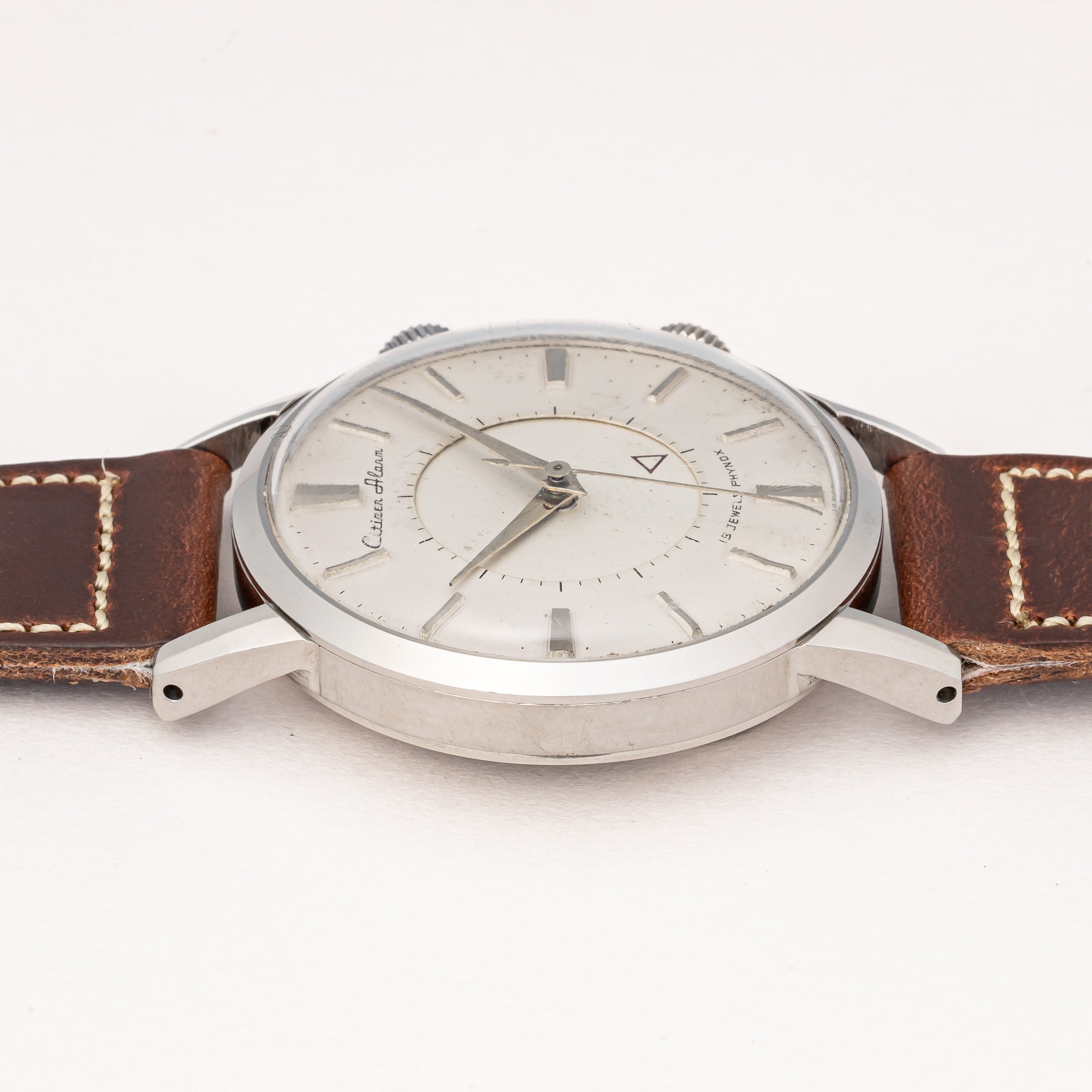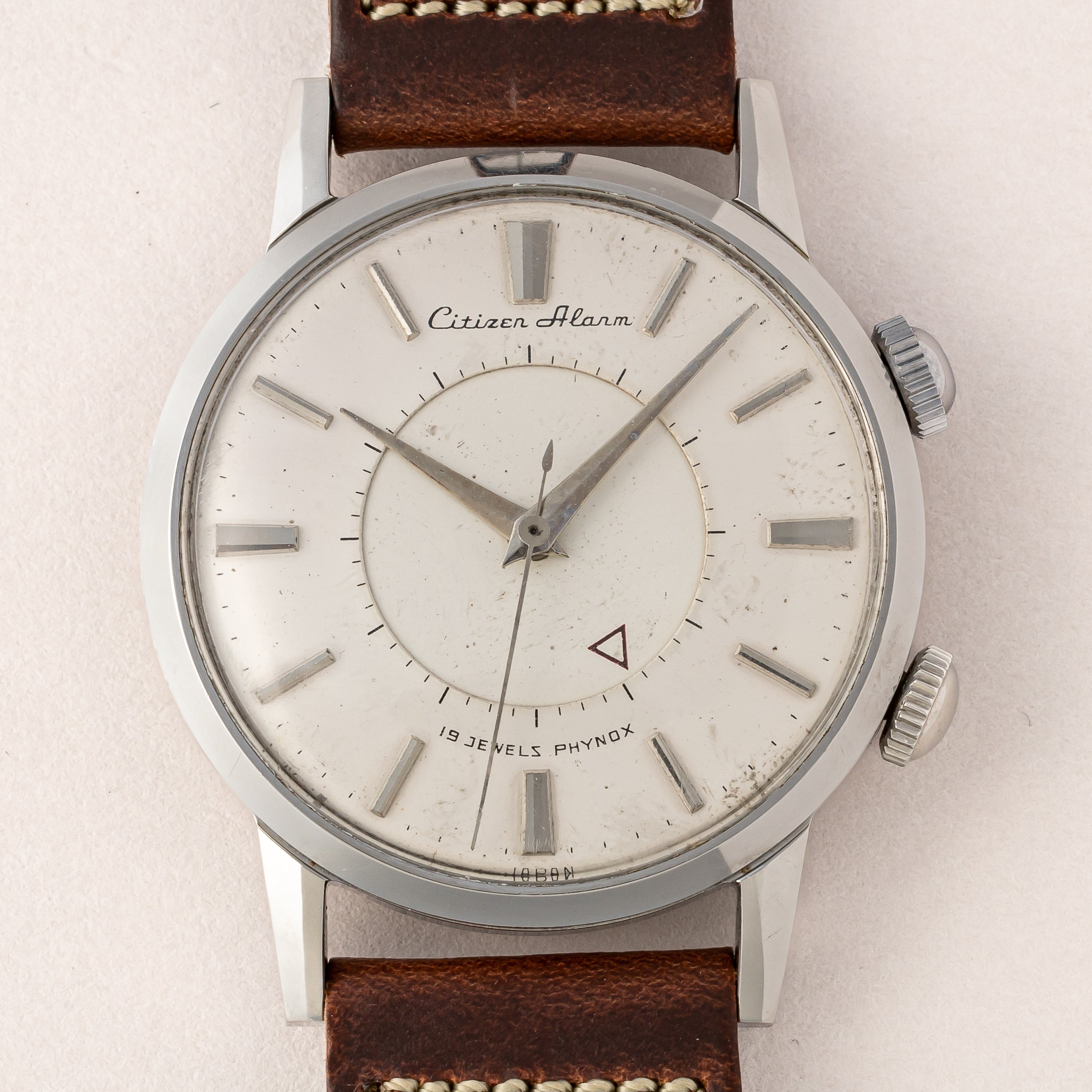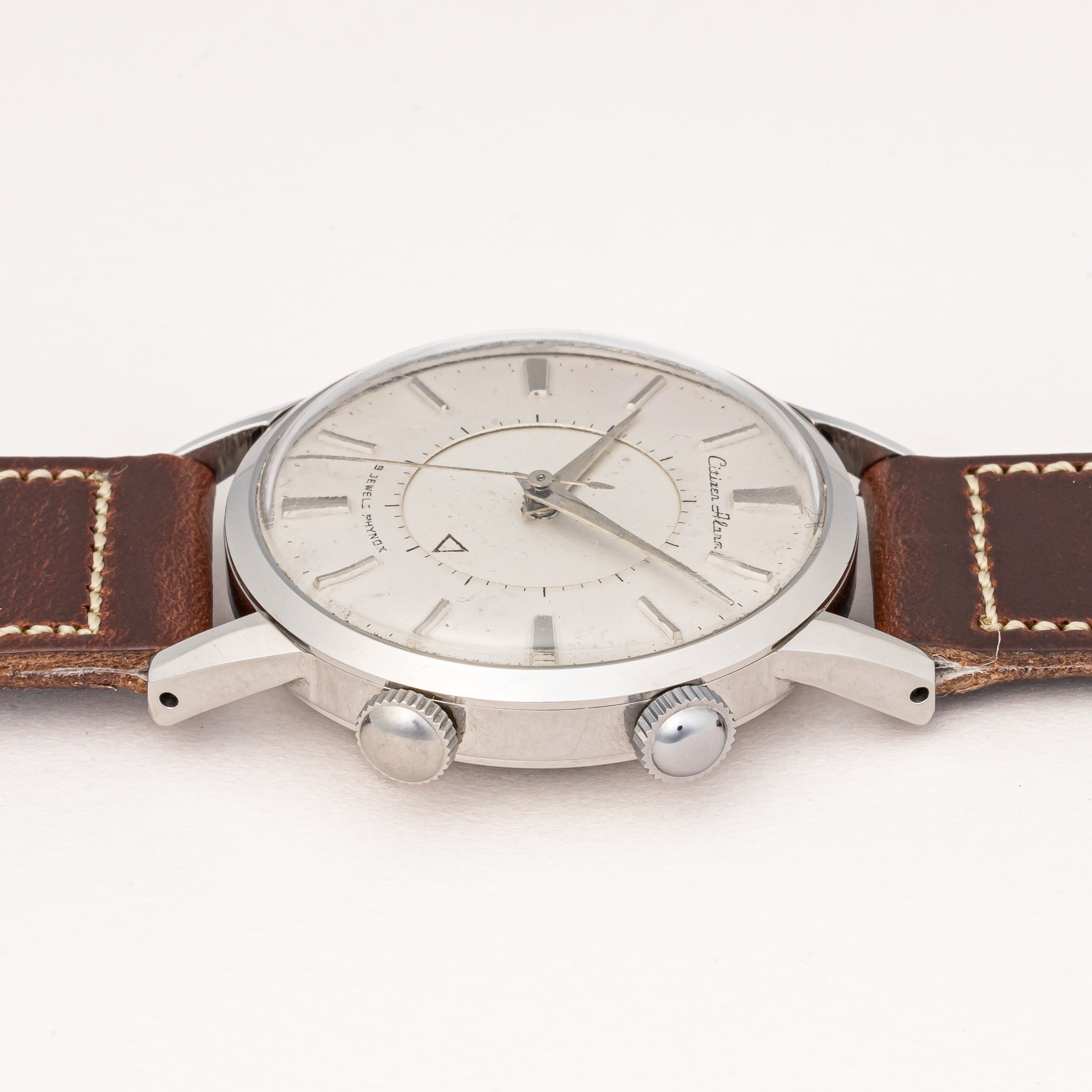 1950年代製のシチズンアラーム手巻きモデルです。ジャガールクルトのメモボックスを意識したデザインで2時位置のリューズでアラーム(インダイヤル)の操作を行い、4時位置のリューズで時計の操作を行います。ジリリリと虫の鳴き声のような音がします。文字盤表面には荒れが見られますが年代を考えれば概ね良好です。人気のステンレスケースは小傷程度で大きなダメージはありません。ベルトはアキュレイトフォルムの革ベルトを合わせています。