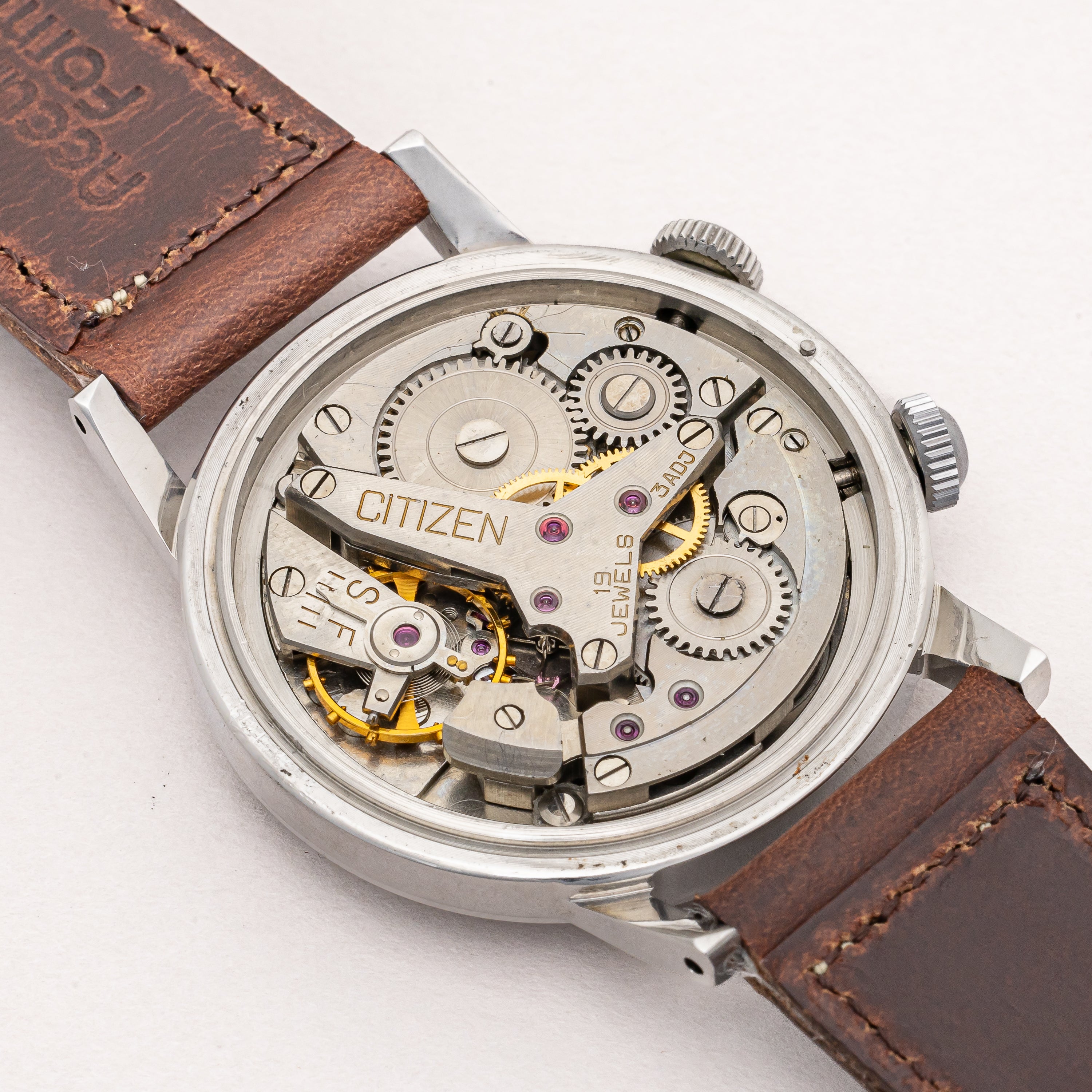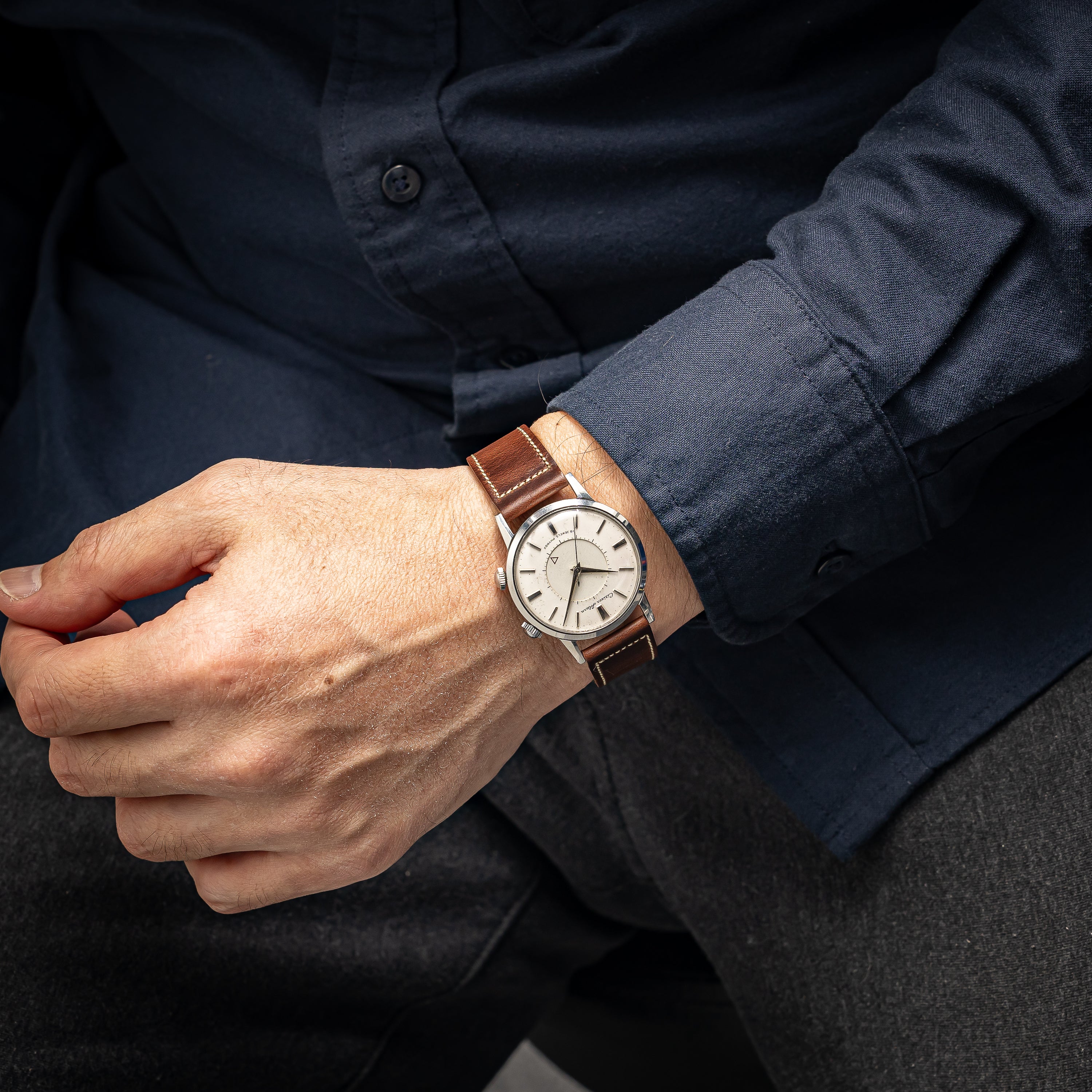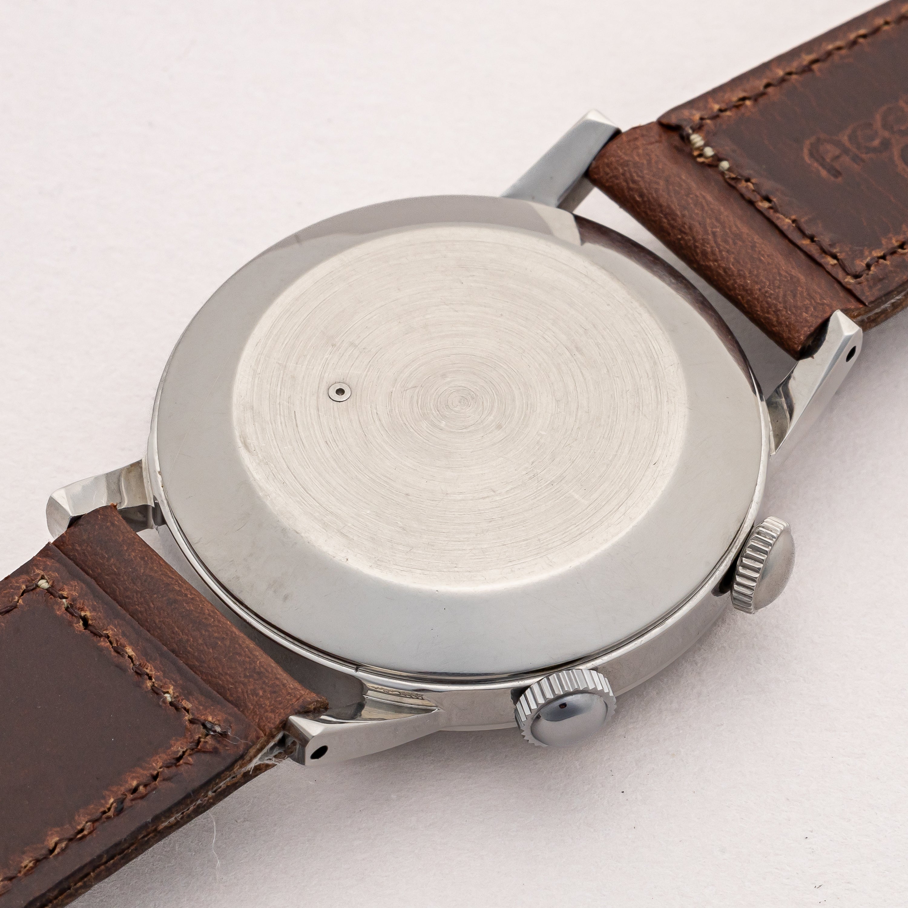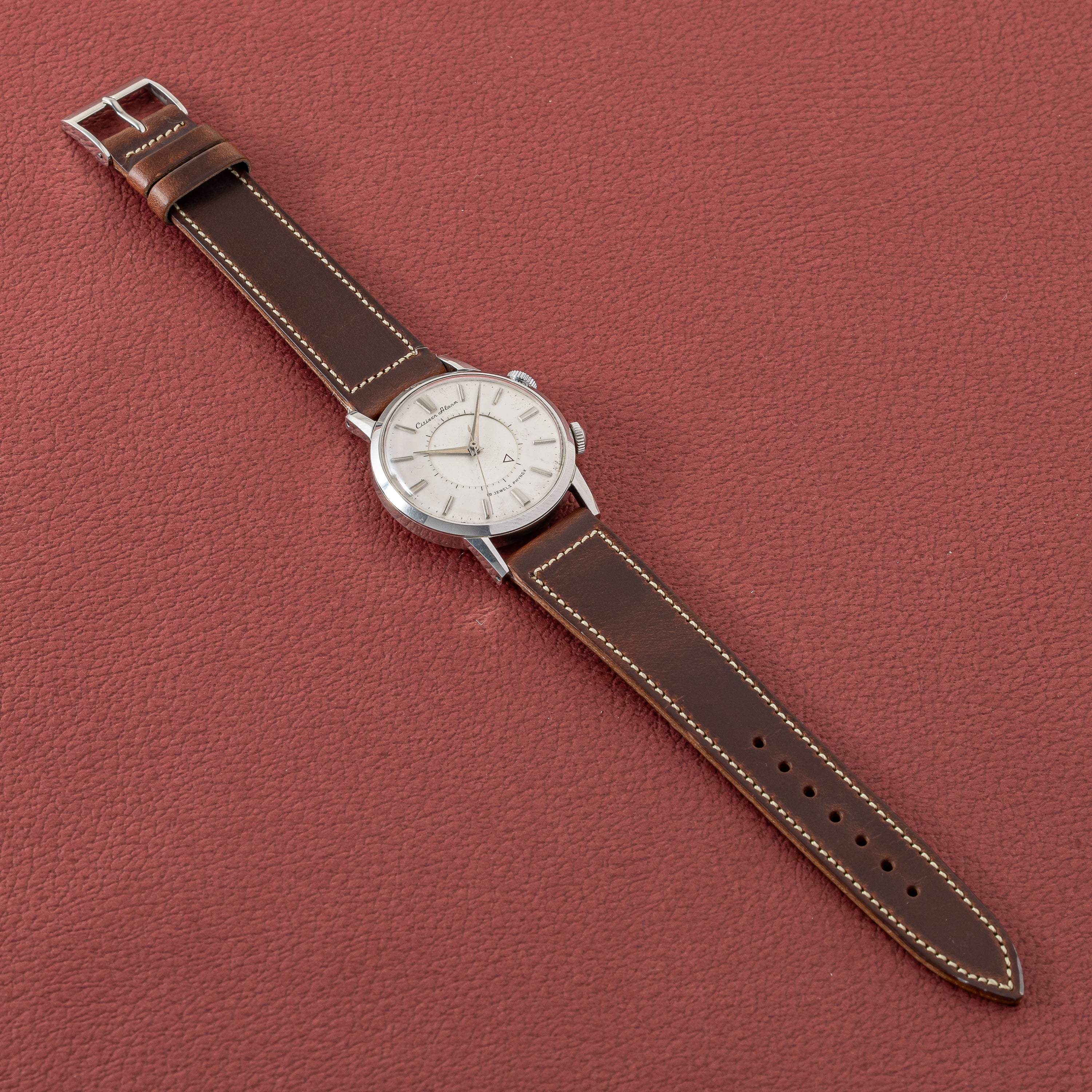 1950年代製のシチズンアラーム手巻きモデルです。ジャガールクルトのメモボックスを意識したデザインで2時位置のリューズでアラーム(インダイヤル)の操作を行い、4時位置のリューズで時計の操作を行います。ジリリリと虫の鳴き声のような音がします。文字盤表面には荒れが見られますが年代を考えれば概ね良好です。人気のステンレスケースは小傷程度で大きなダメージはありません。ベルトはアキュレイトフォルムの革ベルトを合わせています。