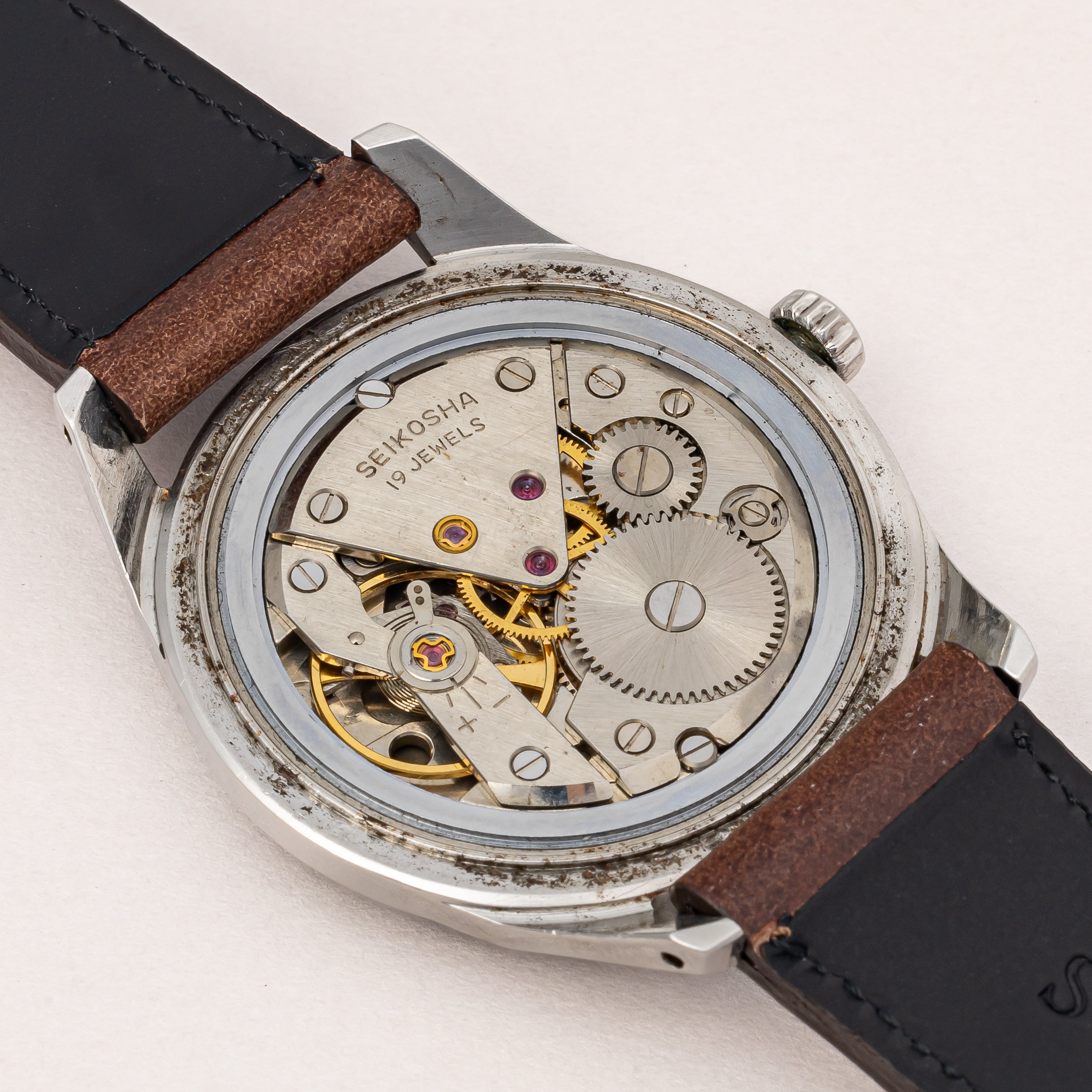 - ヴィンテージ時計の特性上、風防・パッキン・リューズ・バネ棒などの消耗部品は後年メンテナンス過程で交換されている場合がございます。オリジナル性を重視しておりますが、必要に応じて適切な部品にて調整されていますので、よりコレクション性重視のお求めのお客様は事前にご確認ください。